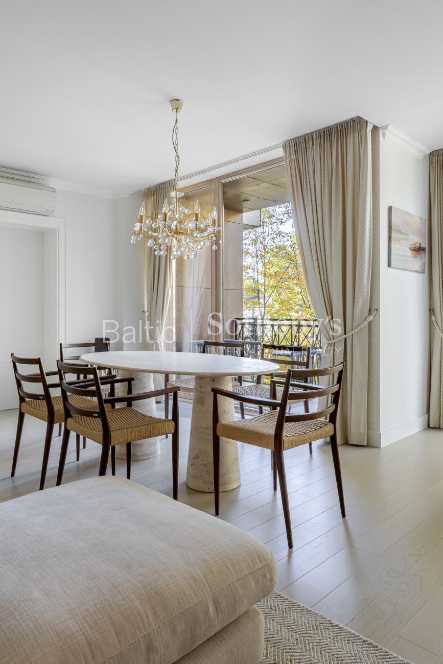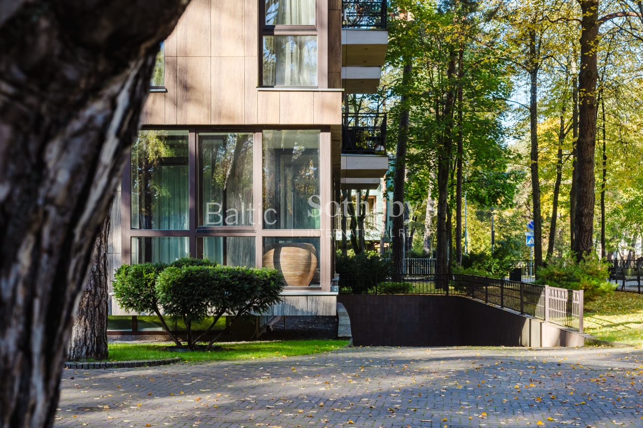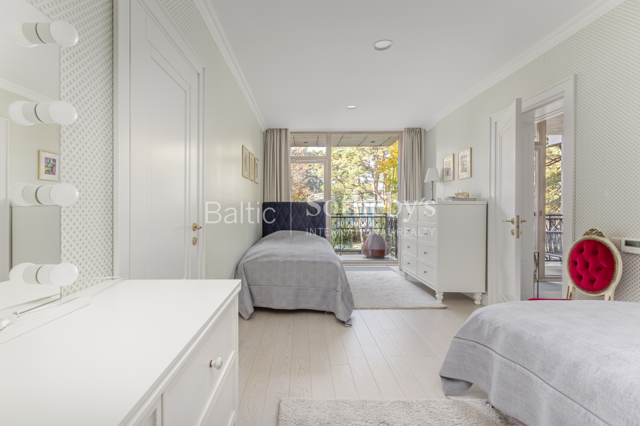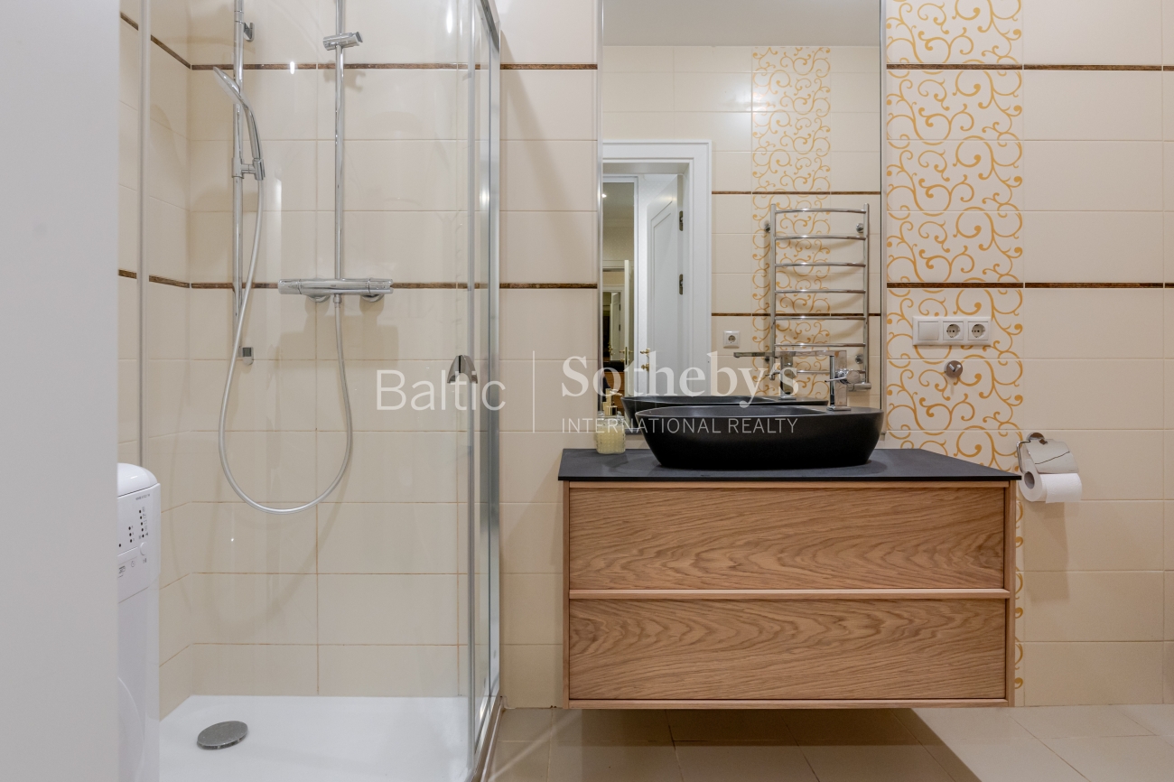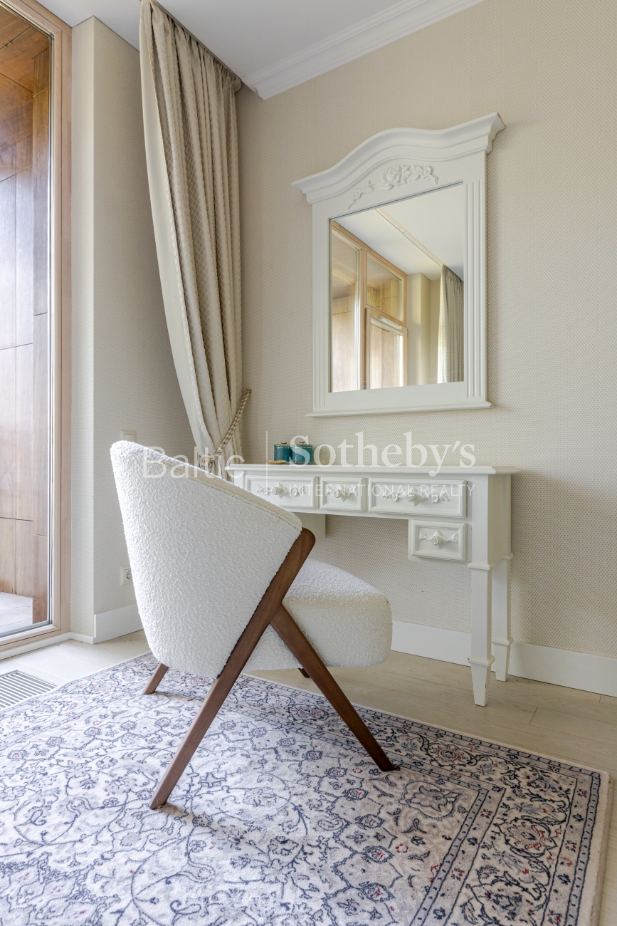 The modern interior of the apartment stands out for its stunning views — from every window, you can enjoy mature pine trees and the refreshing coastal air. Natural sunlight fills the space throughout the day, creating a warm and inviting atmosphere. The apartment features two separate bedrooms, a children’s room, and two bathrooms.