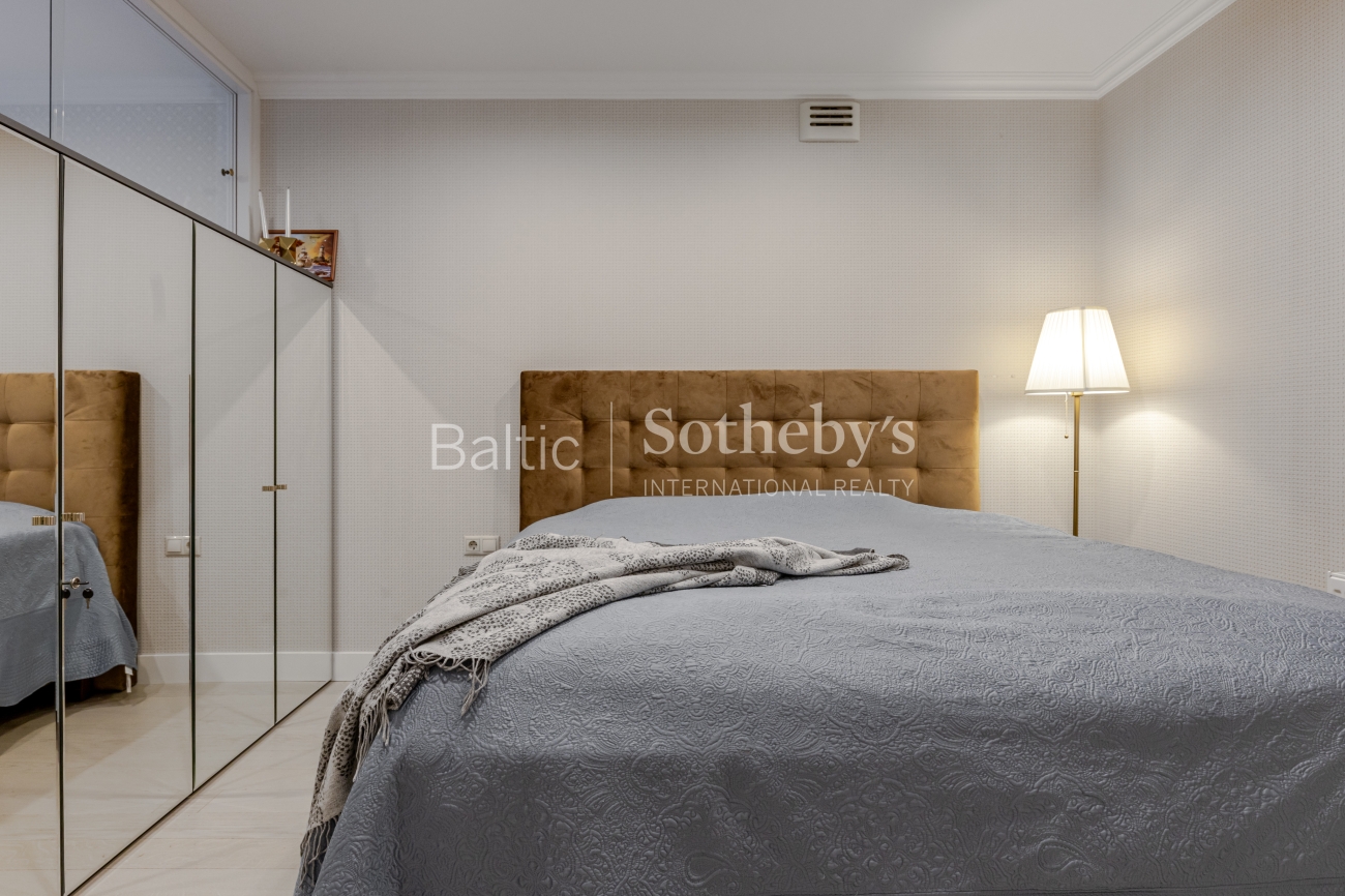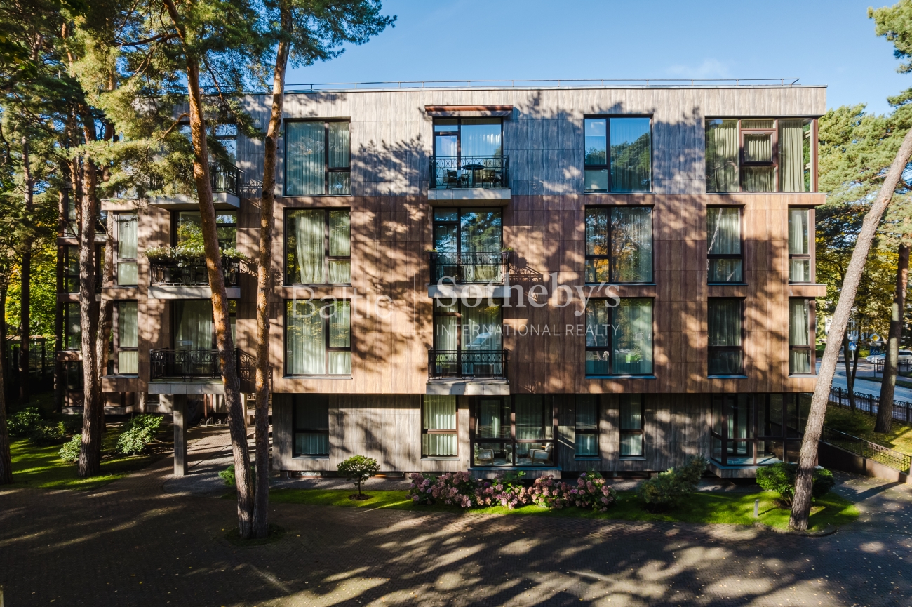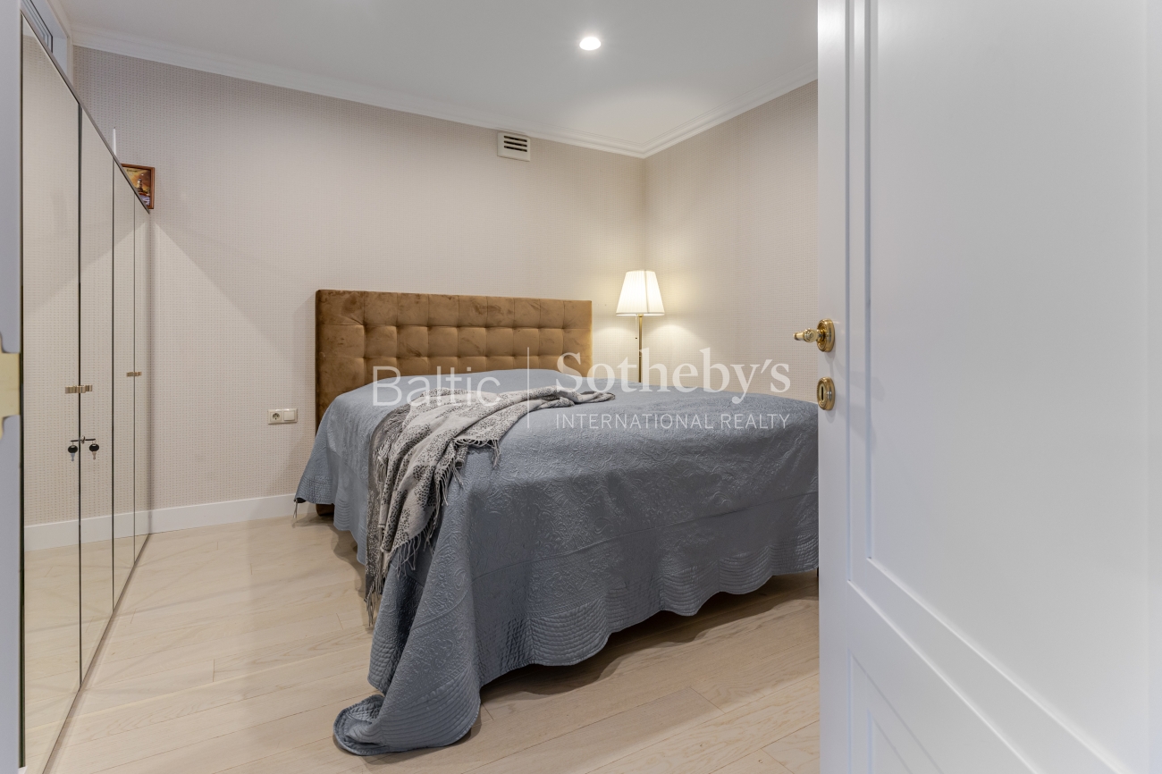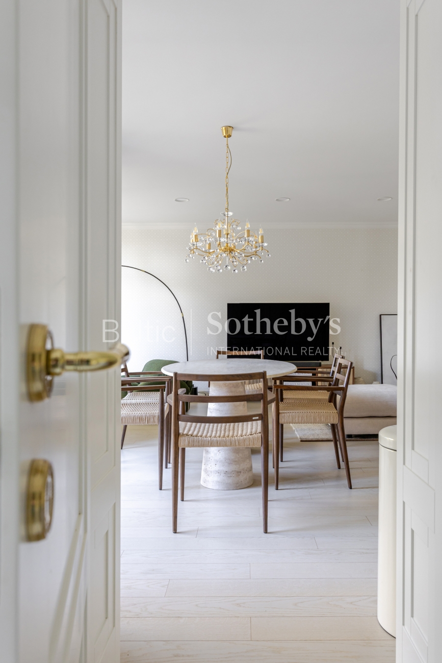 The modern interior of the apartment stands out for its stunning views — from every window, you can enjoy mature pine trees and the refreshing coastal air. Natural sunlight fills the space throughout the day, creating a warm and inviting atmosphere. The apartment features two separate bedrooms, a children’s room, and two bathrooms.
