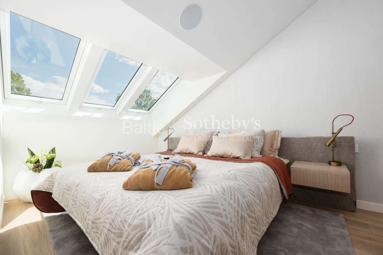 The private level accommodates a serene bedroom environment, enriched by natural light from roof windows and a carefully considered spatial composition. Two bathrooms, finished with premium materials and subtle detailing, provide comfort and functionality in equal measure.