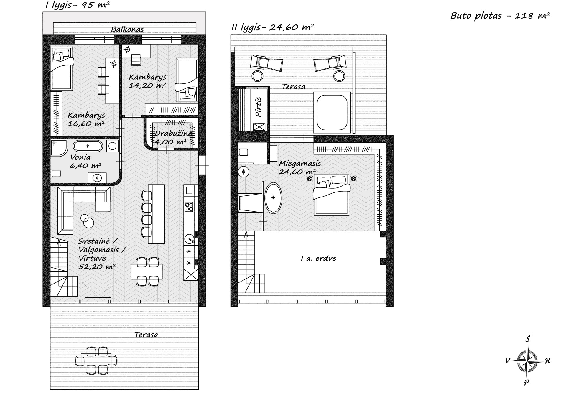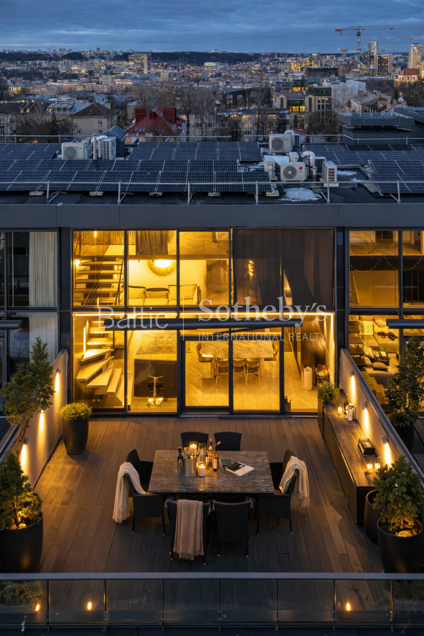 The layout is highly functional. The first floor features a spacious living room with a kitchen, two bedrooms, and a bathroom. On the second floor, the master bedroom is designed with a glass partition that opens up to stunning panoramic views. This level also includes a separate bathroom and a second terrace offering views of the Hill of Three Crosses and Gediminas’ Castle. The terrace is equipped with a jacuzzi and a sauna, creating a private spa area. The apartment is sold together with two parking spaces in the underground garage and a spacious storage room of nearly thirteen square meters.