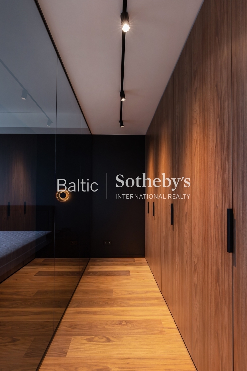 The apartment is distinguished by designer-created aesthetics and a functional three-room layout, ideally suited for those who love space. The living room, kitchen, and dining area merge into one, from which you can directly access the terrace and enjoy views of the Neris River and the Old Town. The apartment also features a secluded workroom. The master bedroom includes a spacious walk-in closet, while the second bedroom has its own balcony.