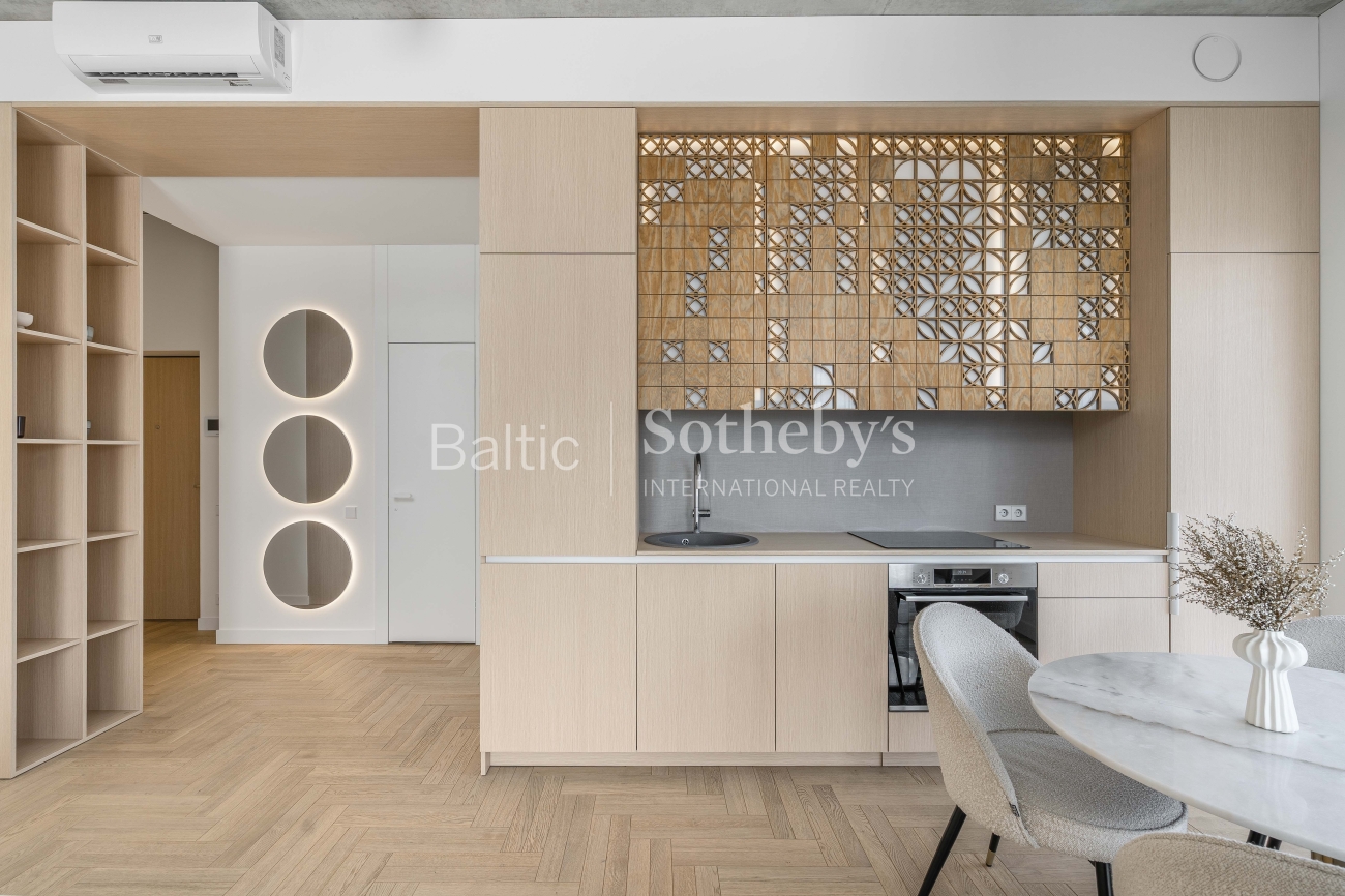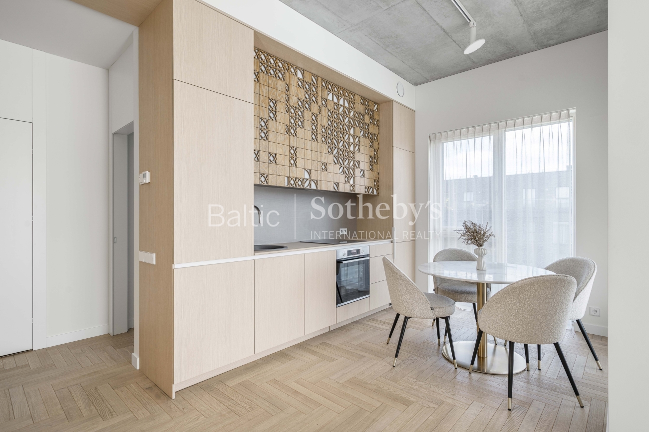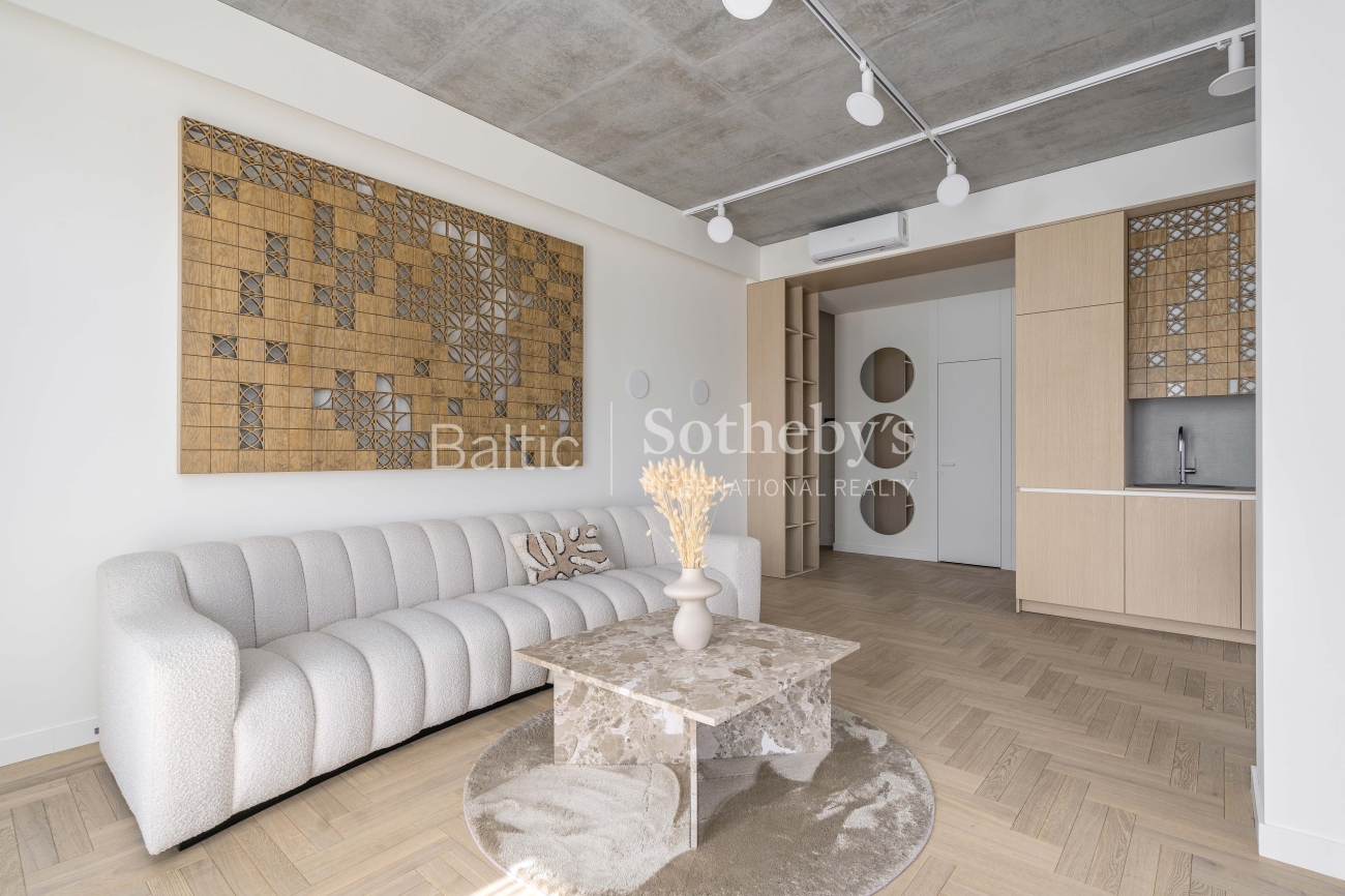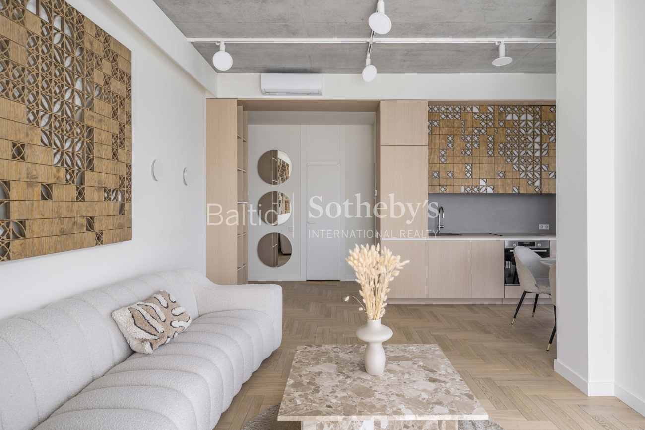 For sale: a designer-furnished, modern two-room apartment in the prestigious “Žvėryno Lapės” project. This is a spacious and bright home where high-quality materials, contemporary design, and functionality harmoniously blend. High ceilings enhance the sense of space, while natural tones and carefully selected furniture create a cozy atmosphere. Large wooden windows provide an abundance of natural light, and access to a spacious 10 sq. m balcony allows for fresh air and tranquility.