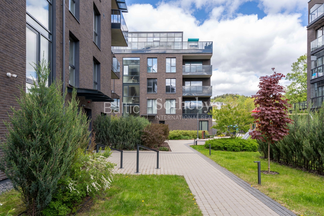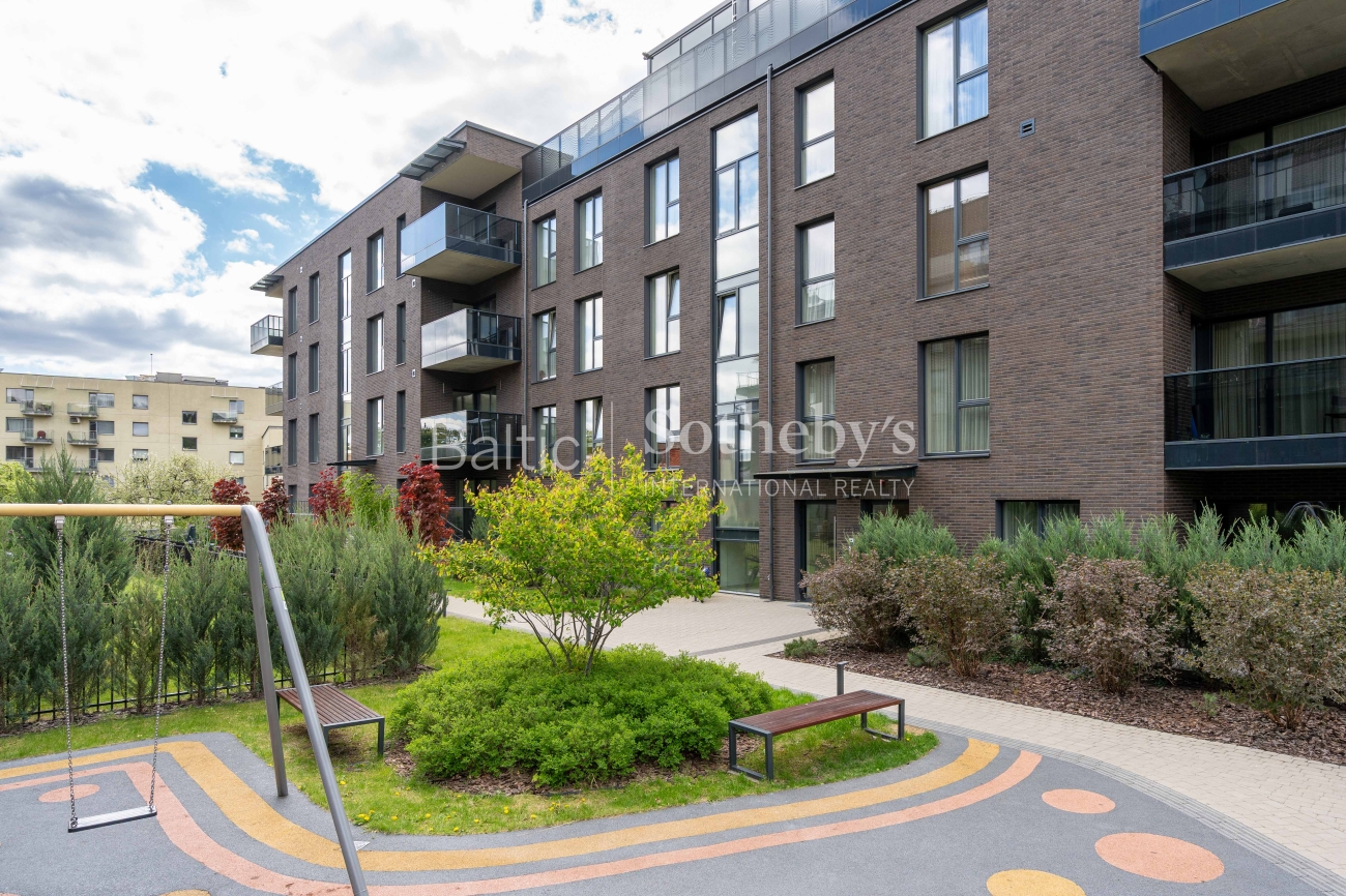 The project was designed by renowned architect Algirdas Kaušpėdas, and the construction was carried out by the reliable real estate development company “Releven.” The building’s facade is made of natural clinker tiles, and the surrounding area is landscaped for residents’ comfort, featuring a children’s playground, a sports area, and cozy relaxation spaces. A gated courtyard with security cameras and controlled access ensures peace and safety. Additionally, underground parking is available for purchase, including charging options for electric vehicles.