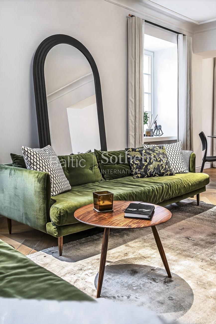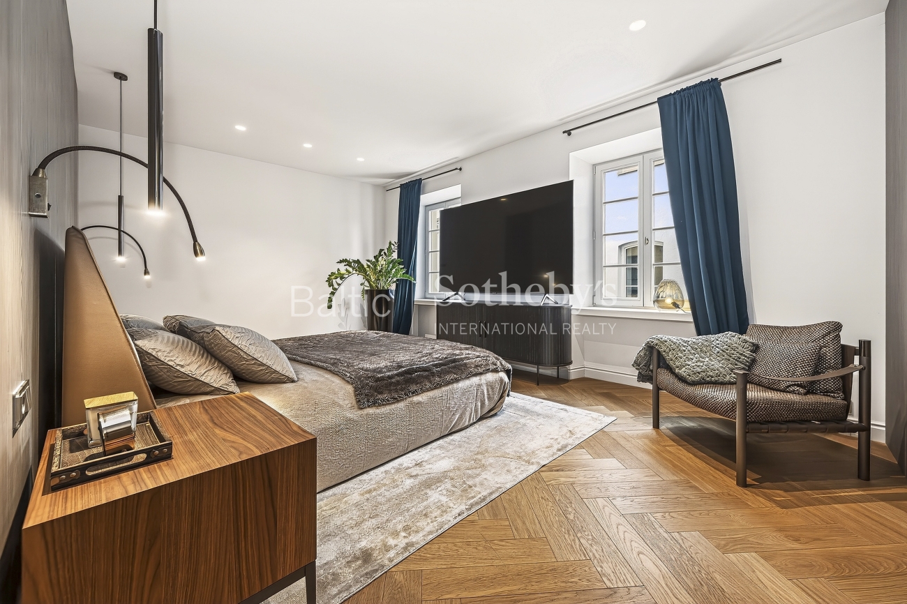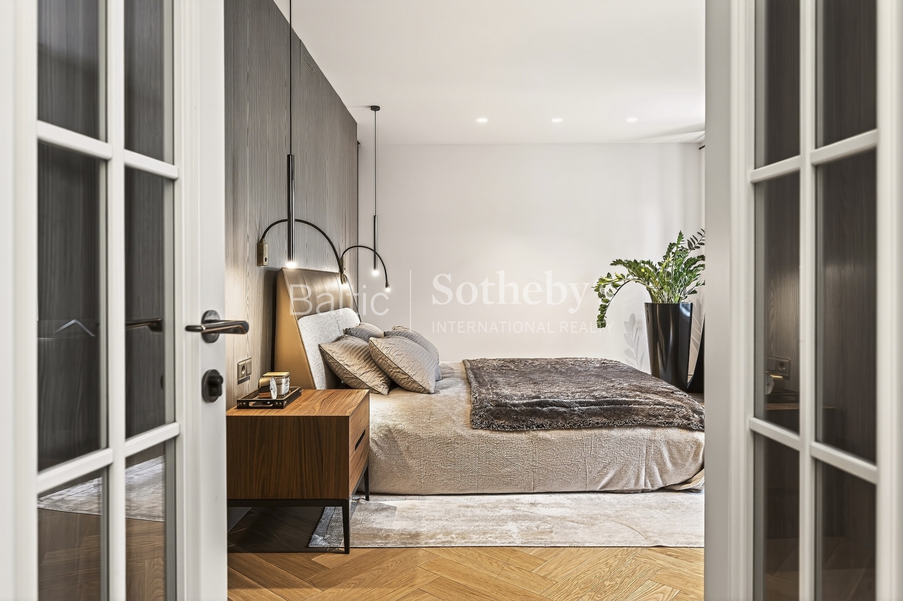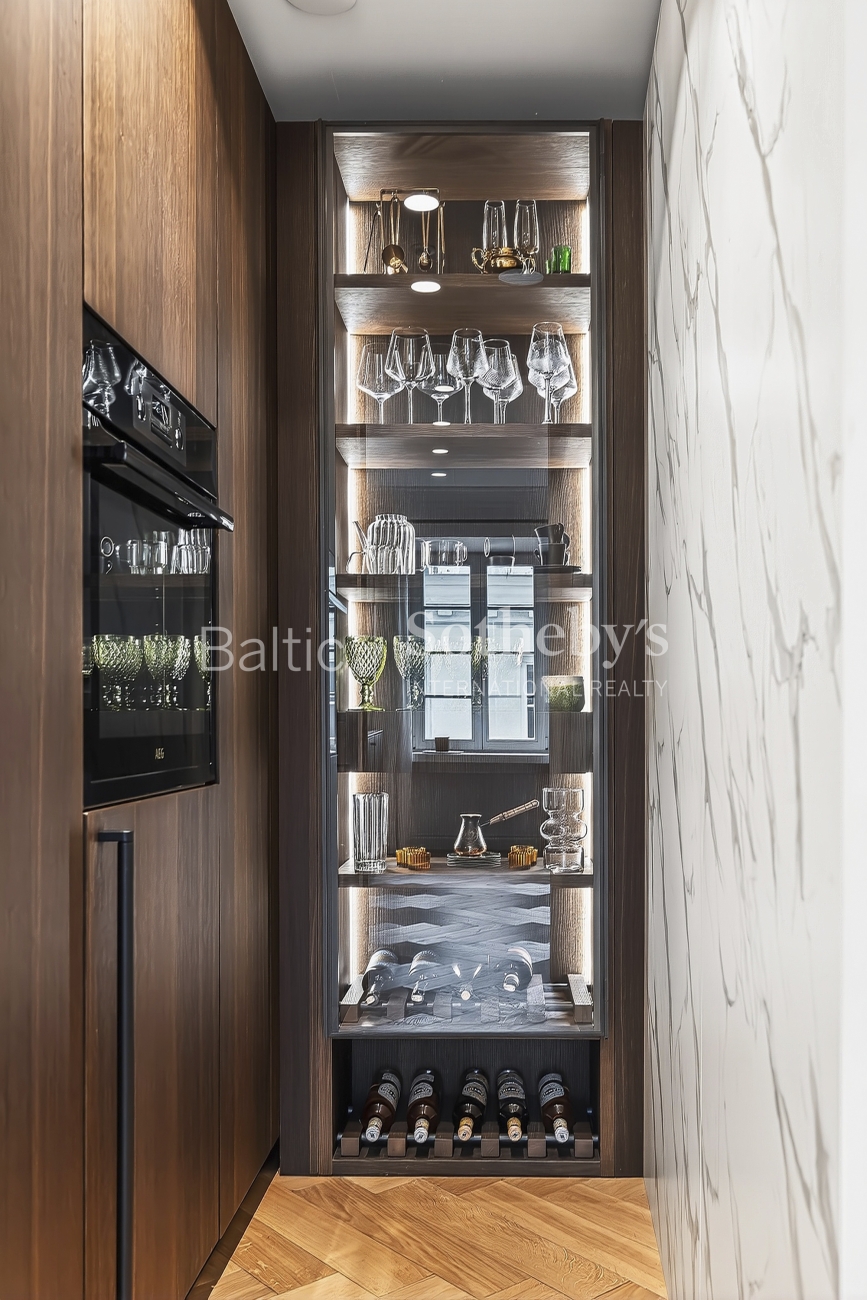 Reflecting the spirit of the Old Town, the apartments are modernly equipped with underfloor heating, a heat recovery ventilation system, new double-glazed wooden windows, and warm oak floors. The luxurious German SieMatic kitchen comes with built-in appliances, an adjacent storage room, and a wine cooler. Italian furniture and lighting, along with other distinctive interior elements, create an elegant and timeless environment. The spacious bedroom features a private bathroom and a large walk-in closet.