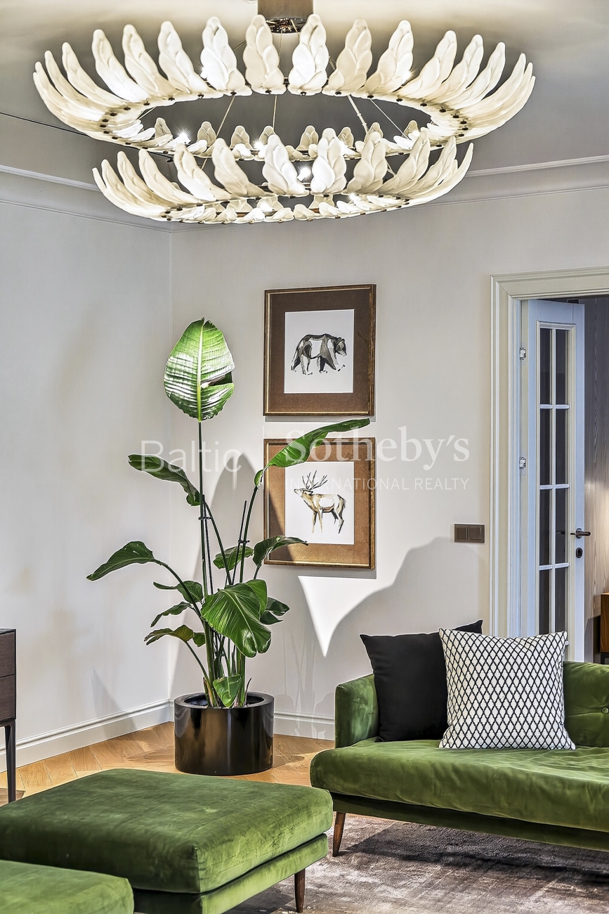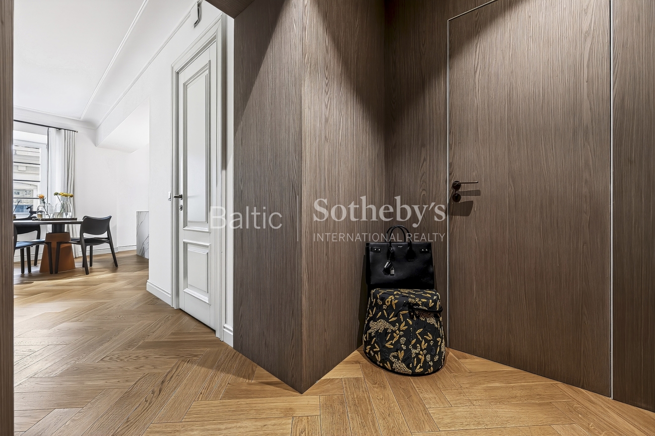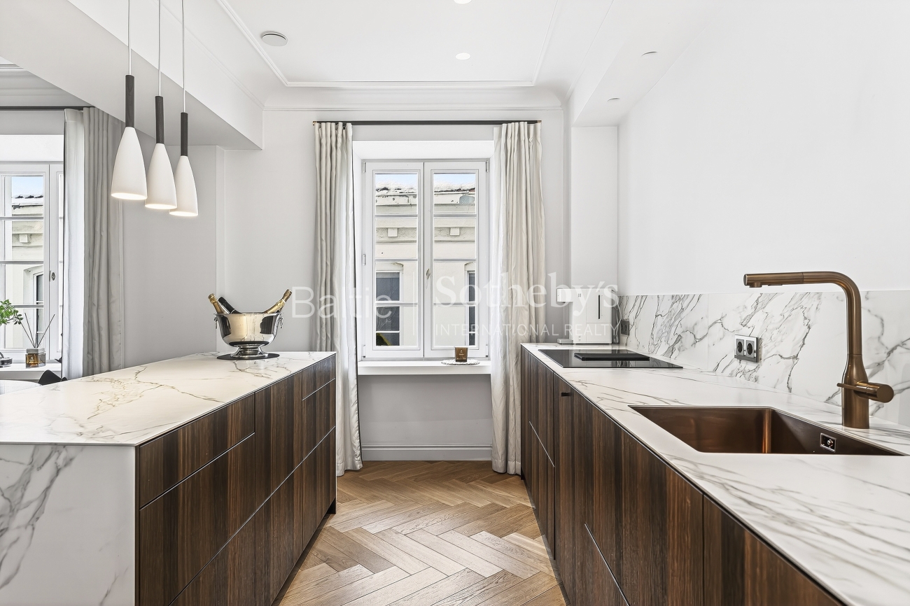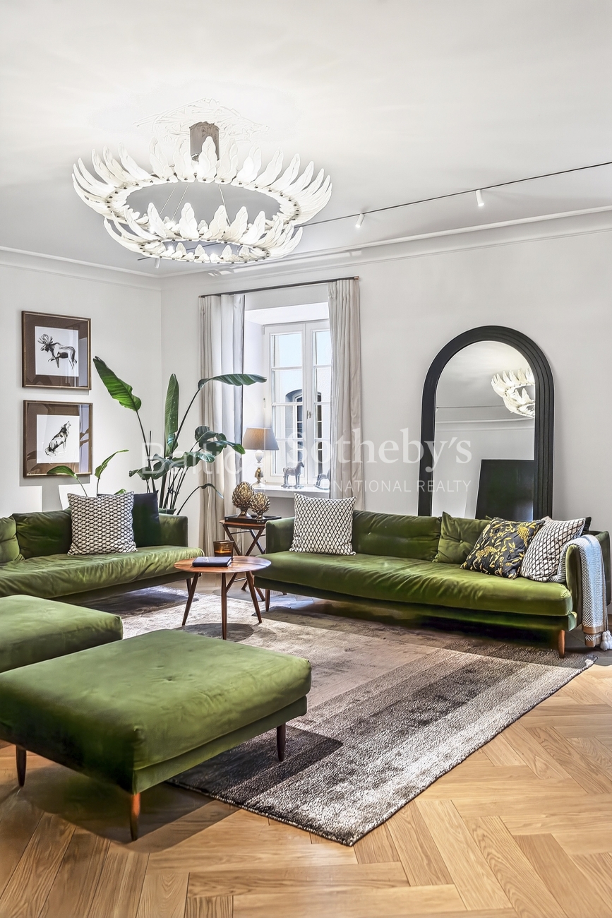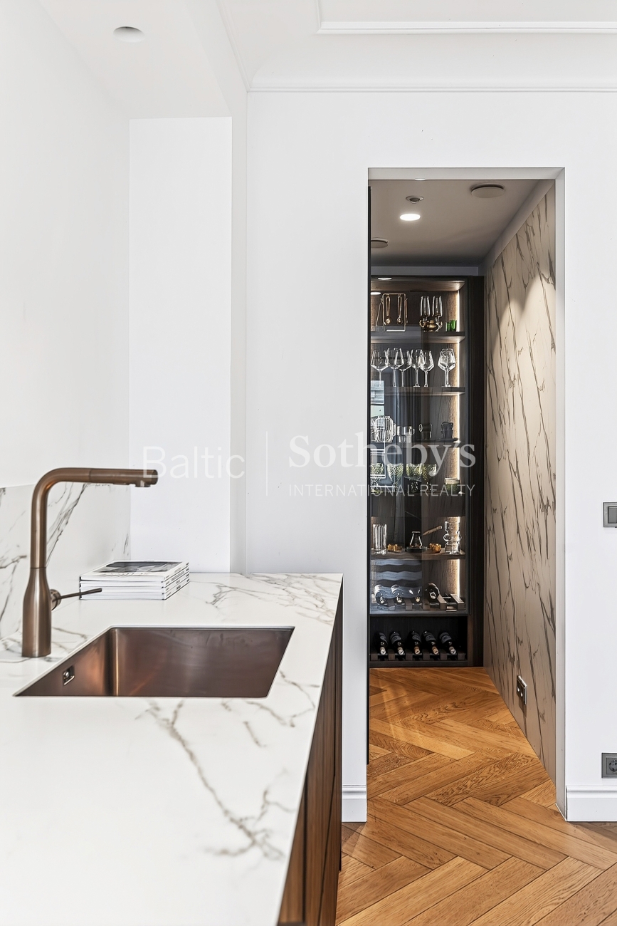 Reflecting the spirit of the Old Town, the apartments are modernly equipped with underfloor heating, a heat recovery ventilation system, new double-glazed wooden windows, and warm oak floors. The luxurious German SieMatic kitchen comes with built-in appliances, an adjacent storage room, and a wine cooler. Italian furniture and lighting, along with other distinctive interior elements, create an elegant and timeless environment. The spacious bedroom features a private bathroom and a large walk-in closet.