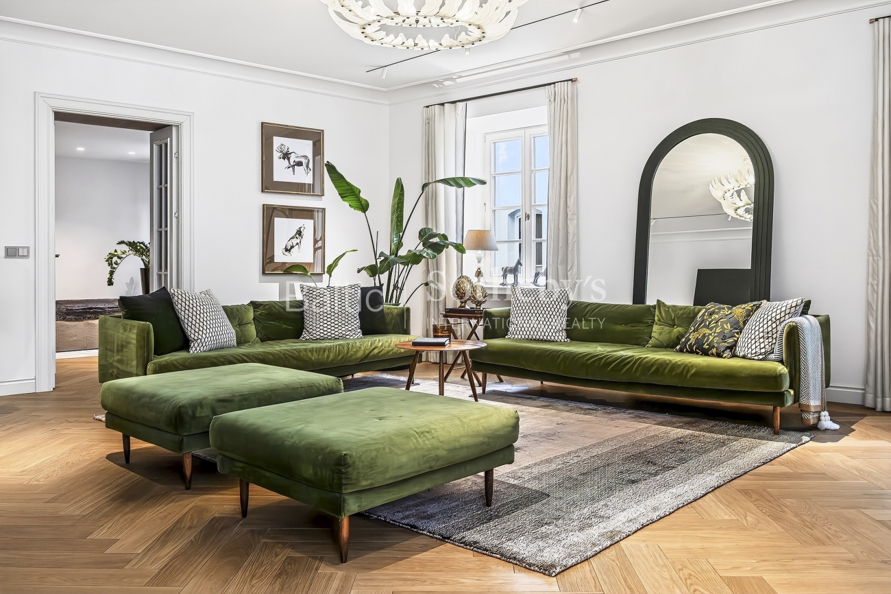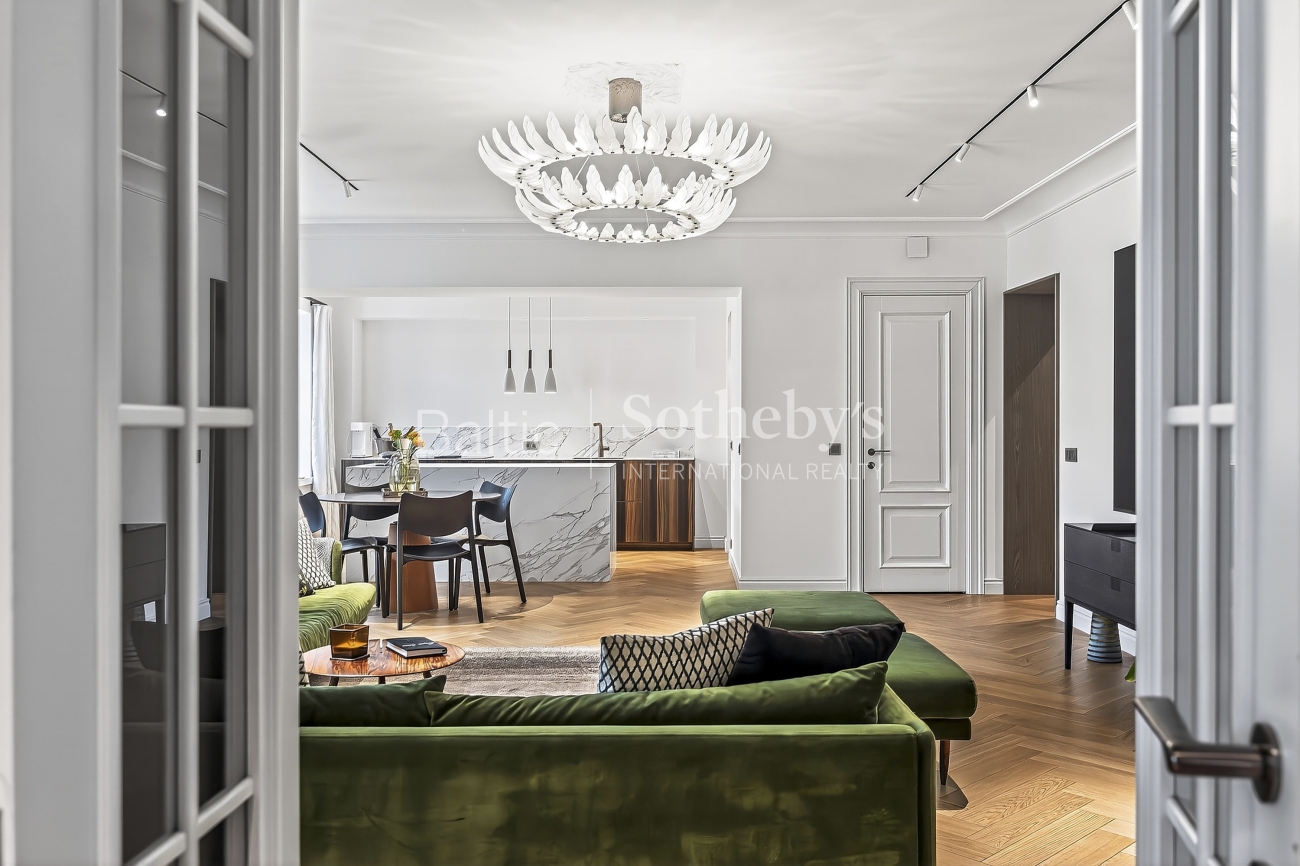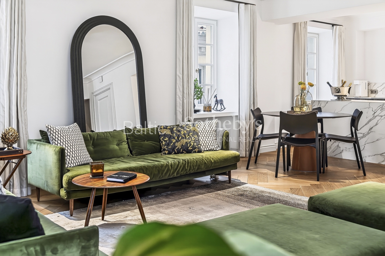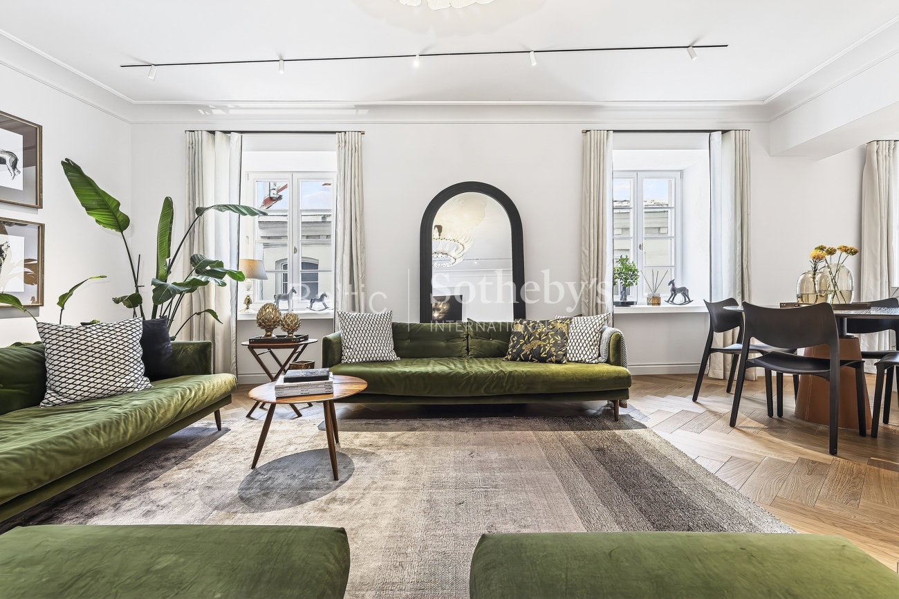 Reflecting the spirit of the Old Town, the apartments are modernly equipped with underfloor heating, a heat recovery ventilation system, new double-glazed wooden windows, and warm oak floors. The luxurious German SieMatic kitchen comes with built-in appliances, an adjacent storage room, and a wine cooler. Italian furniture and lighting, along with other distinctive interior elements, create an elegant and timeless environment. The spacious bedroom features a private bathroom and a large walk-in closet.