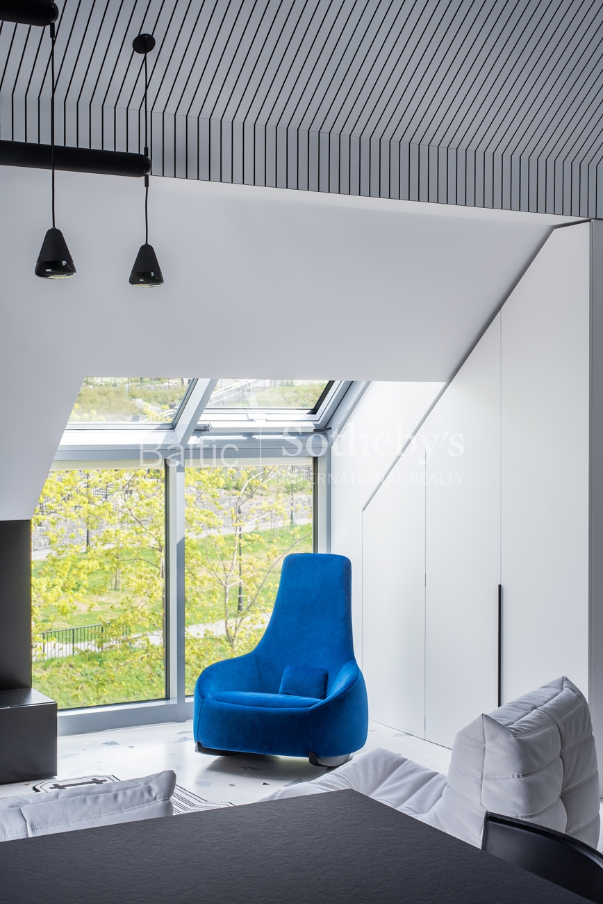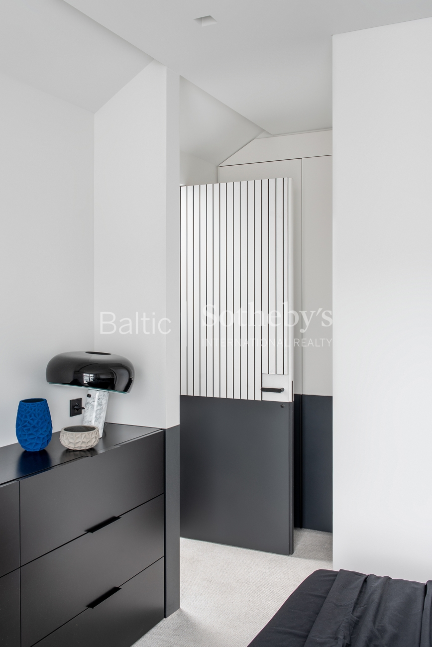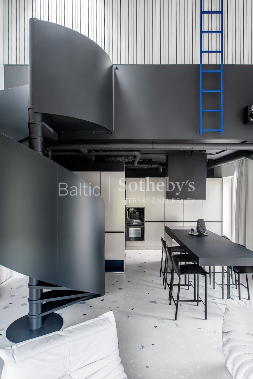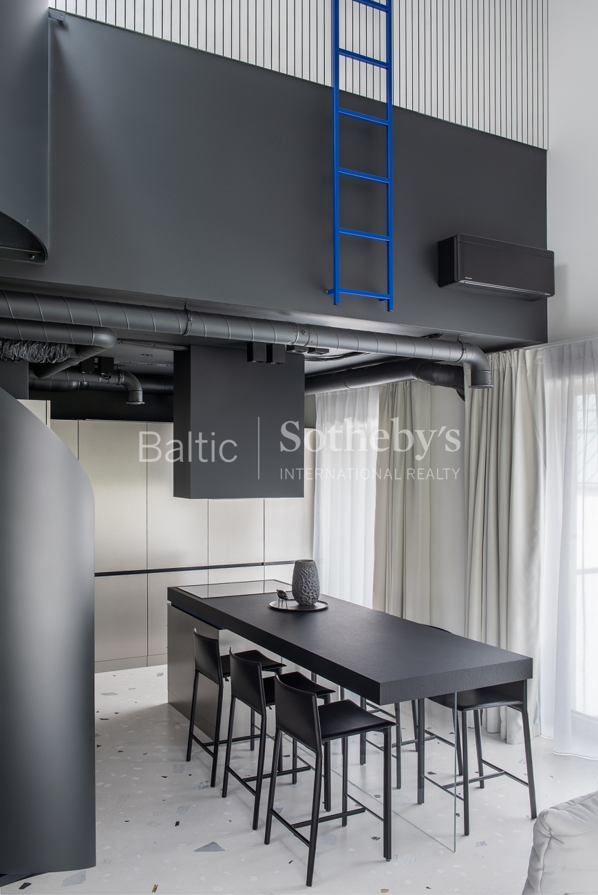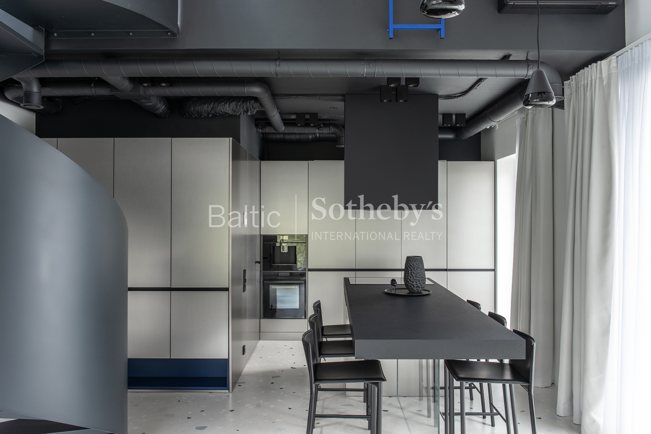 For sale are 60 sq m apartments with an exceptional interior, located in one of Vilnius’ most sought-after neighbourhoods – Paupys. The interior was designed by architect and designer Laura Giržadė. The space is defined by impressive 4.5-metre-high ceilings, allowing the interior to “breathe” and creating a refined loft-style sense of luxury. The design concept is based on a subtle contrast of black and white, boldly complemented by cobalt blue accents in both the furniture and architectural details.