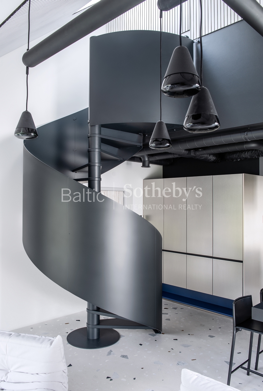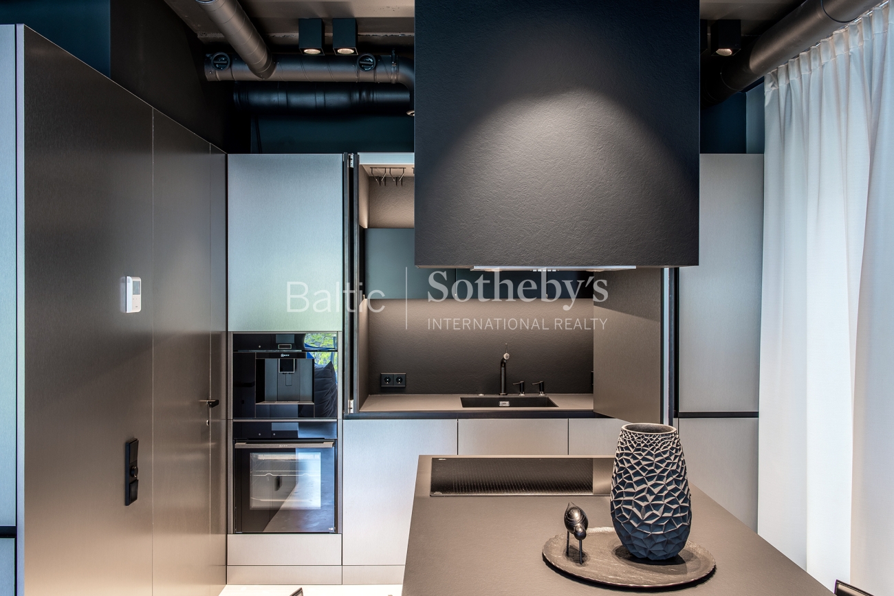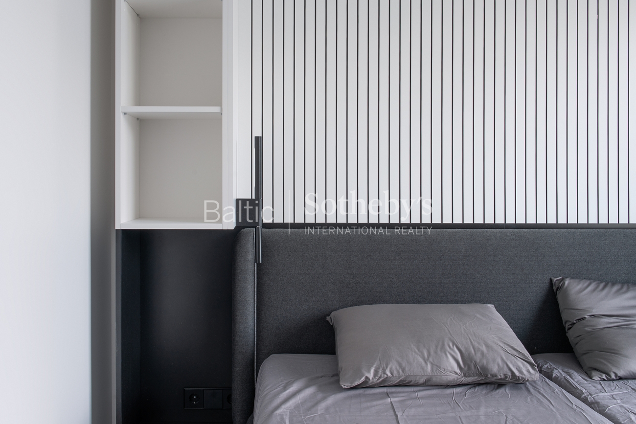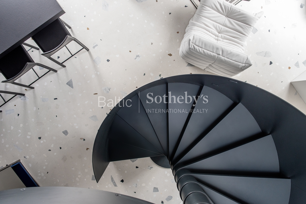 For sale are 60 sq m apartments with an exceptional interior, located in one of Vilnius’ most sought-after neighbourhoods – Paupys. The interior was designed by architect and designer Laura Giržadė. The space is defined by impressive 4.5-metre-high ceilings, allowing the interior to “breathe” and creating a refined loft-style sense of luxury. The design concept is based on a subtle contrast of black and white, boldly complemented by cobalt blue accents in both the furniture and architectural details.
