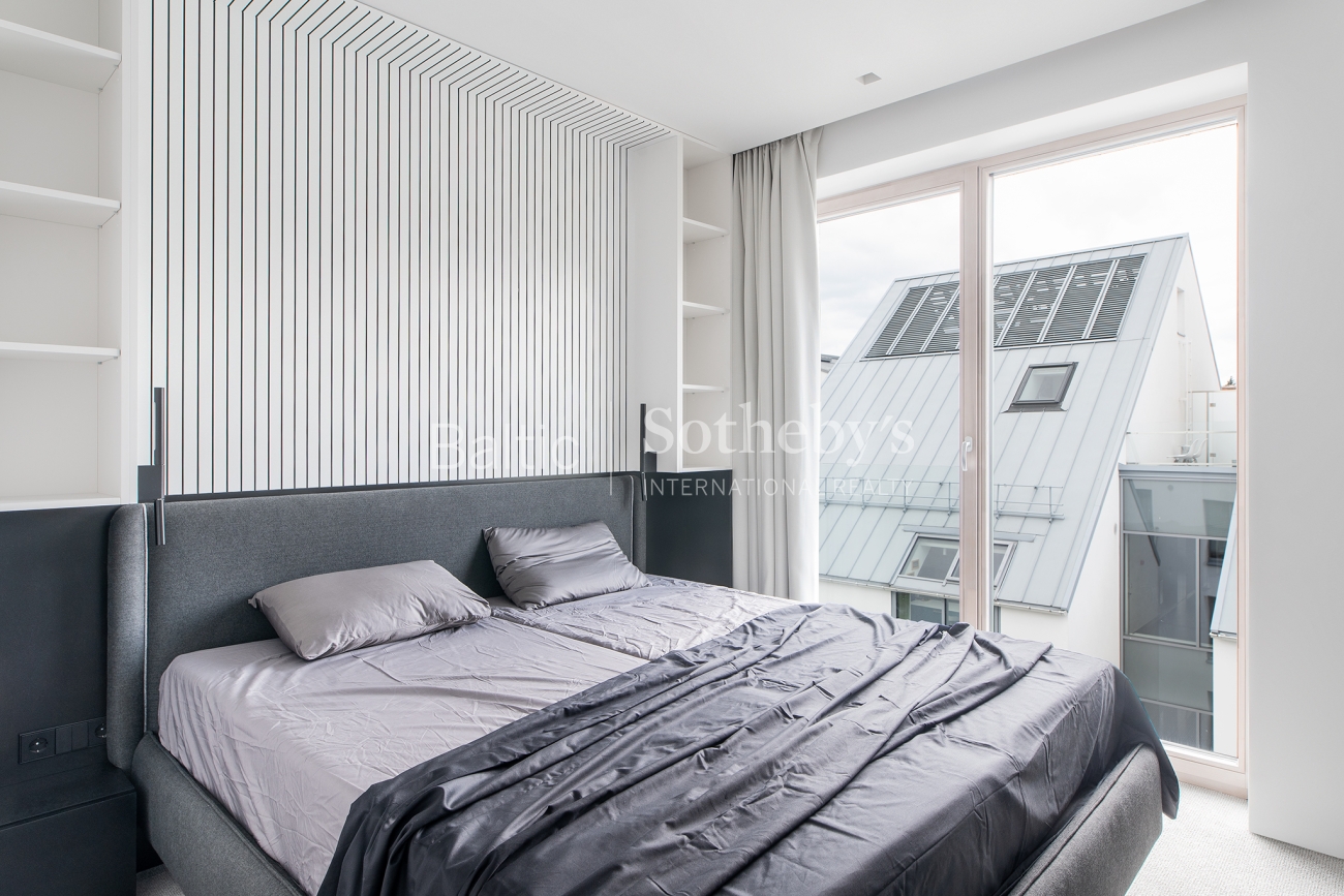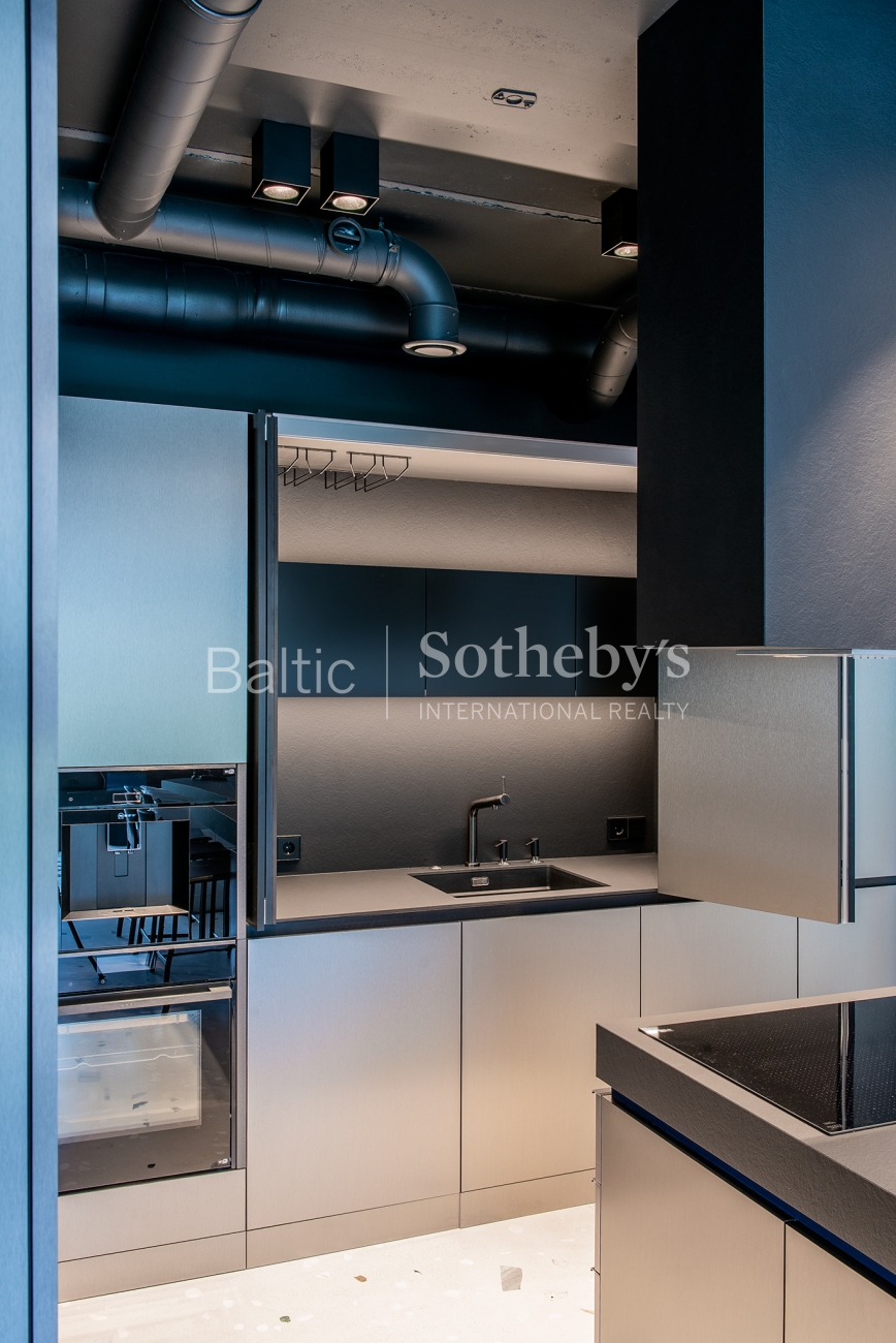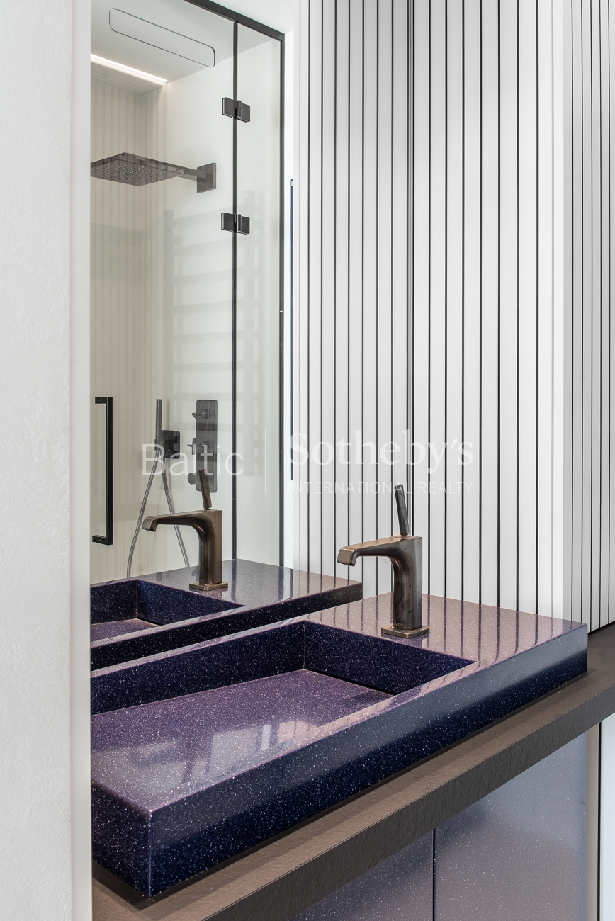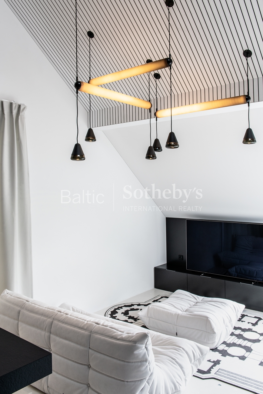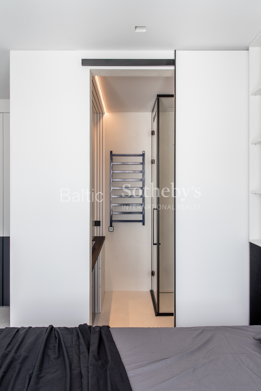For sale are 60 sq m apartments with an exceptional interior, located in one of Vilnius’ most sought-after neighbourhoods – Paupys. The interior was designed by architect and designer Laura Giržadė. The space is defined by impressive 4.5-metre-high ceilings, allowing the interior to “breathe” and creating a refined loft-style sense of luxury. The design concept is based on a subtle contrast of black and white, boldly complemented by cobalt blue accents in both the furniture and architectural details.