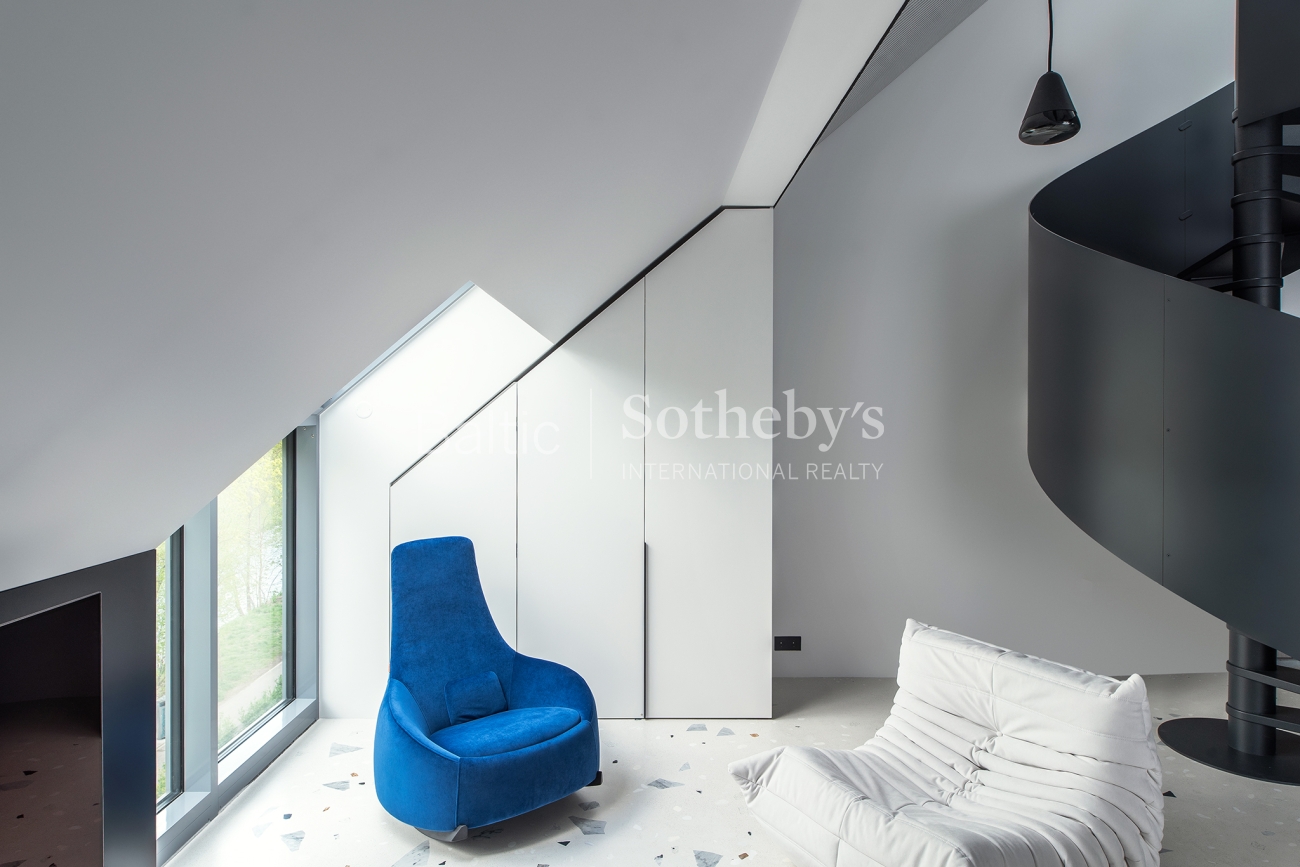 The first level features an open-plan kitchen, dining and living area, perfectly suited both for daily life and entertaining guests. From the living room there is access to a spacious balcony, where during the warmer months one can enjoy views of the flowing Vilnelė River and the surrounding greenery. A dedicated home office area is integrated into the living space and can be discreetly concealed after the working day. This level also includes a practical walk-in wardrobe and a guest WC.