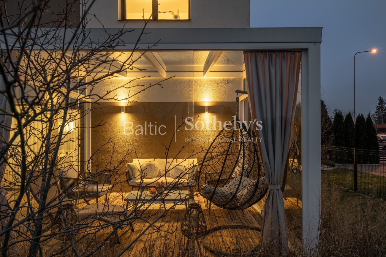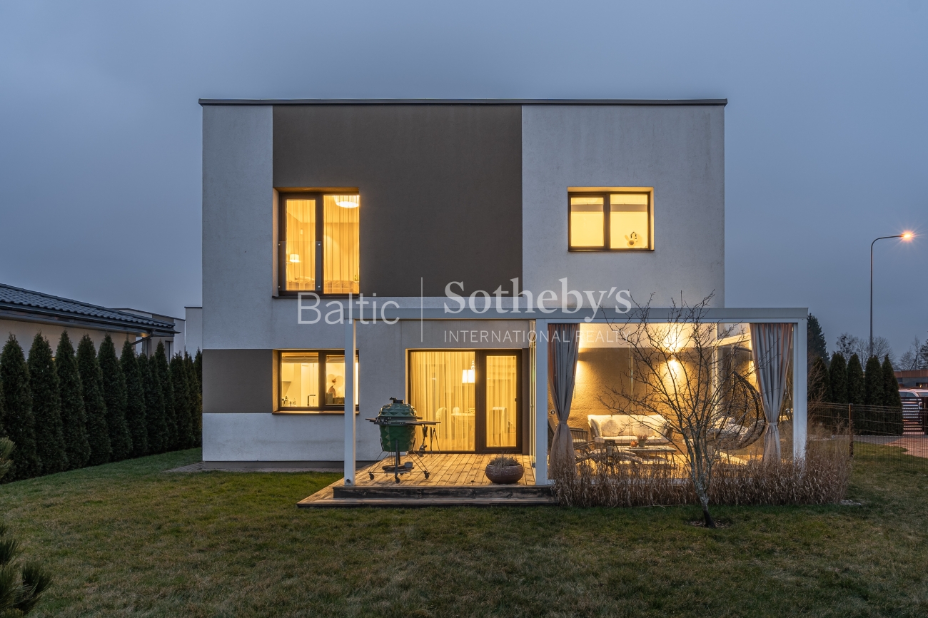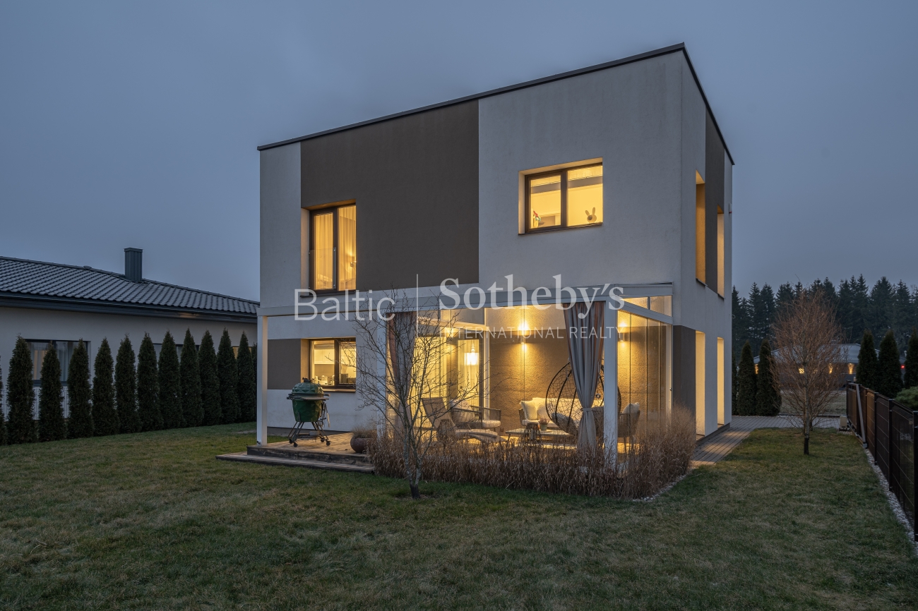 The interior was created in collaboration with a designer, showcasing modern classic style and high-quality materials: two-layer oak parquet, solid oak stairs and doors, custom-made MDF furniture, a kitchen countertop made of Corian solid surface, and a stone resin bathtub. The house is equipped with the smart “Loxone” home system and automatic LED lighting.