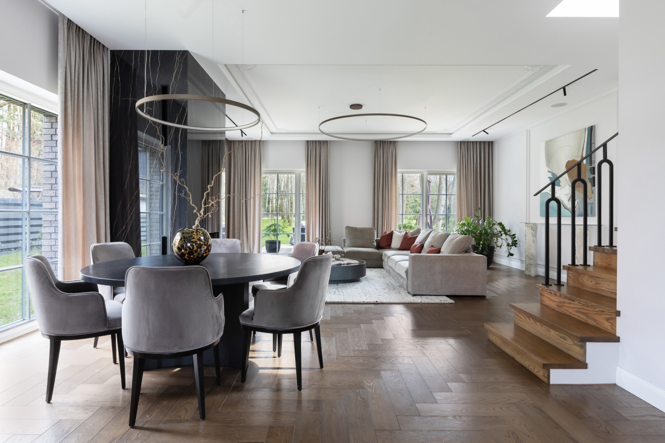 Here's a 187 sqm modern classic home on a 4.5 acre plot, with every detail thought out to the last detail. Taste and aesthetics are at the heart of this home, bursting with harmony, warmth and lasting elegance. The professional design team has furnished the house using only the highest quality materials and time-tested and recognised brands: bespoke furniture, Miele appliances, Gessi sanitary ware and Nagoya parquet flooring.