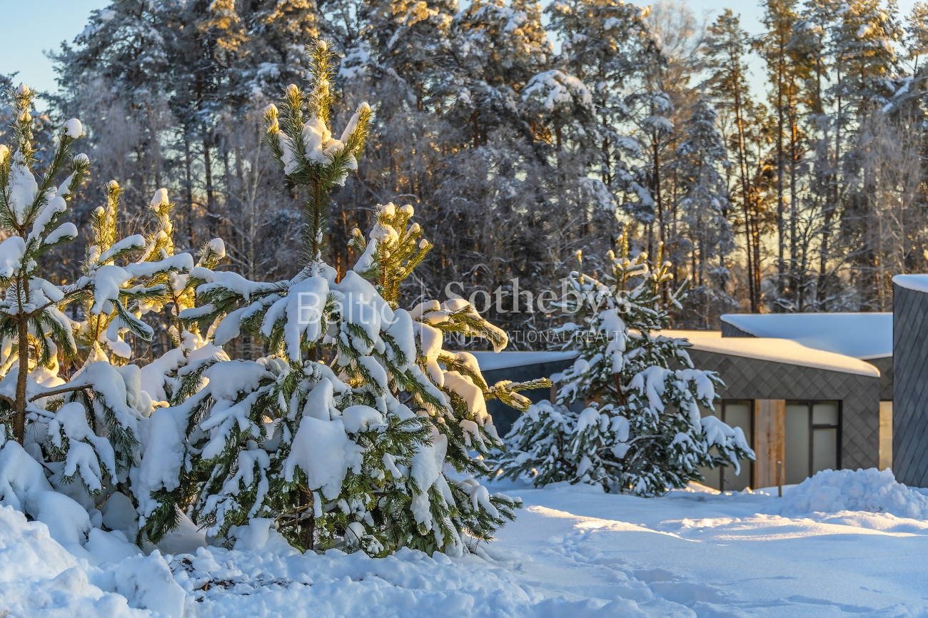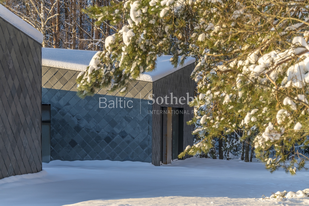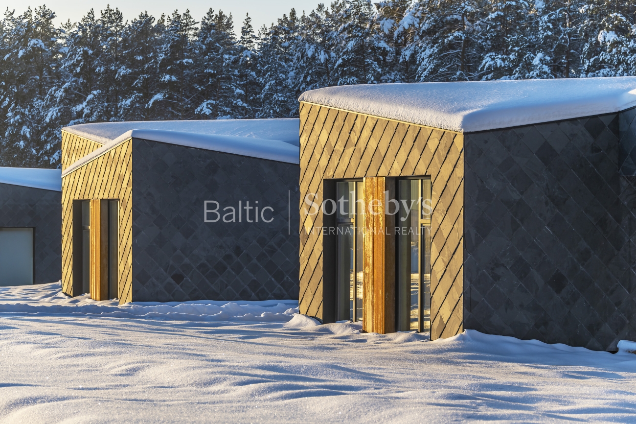 The house is on the edge of the development and borders a pine forest. The total area of the house is 147,43 square meters, and the plot covers 8,59 acres. It has three bedrooms, two bathrooms, and a garage for one car. The single-story layout is designed to subtly separate the living areas of parents and children, ensuring privacy and comfort for every family member. The house has an A++ energy rating.