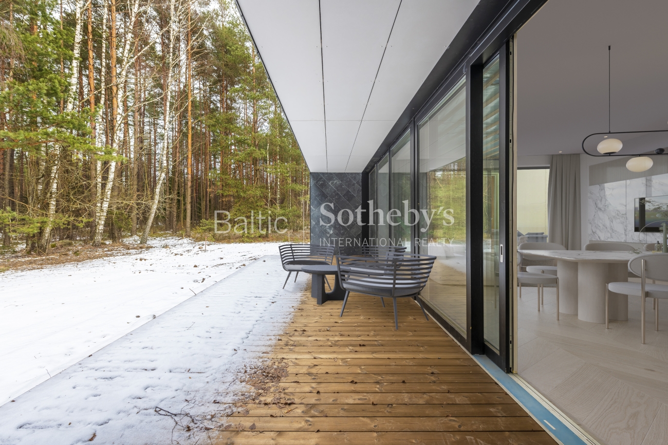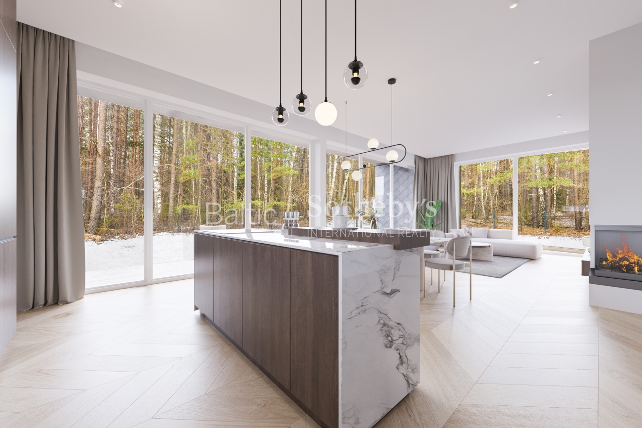 A single-story house is for sale in the prestigious Stirnų giraitės project – an exclusive, gated, and private residential area surrounded on all sides by the mature forests of Sakiškiai. This is a special place for those seeking harmony between modern comfort and an authentic connection with nature.