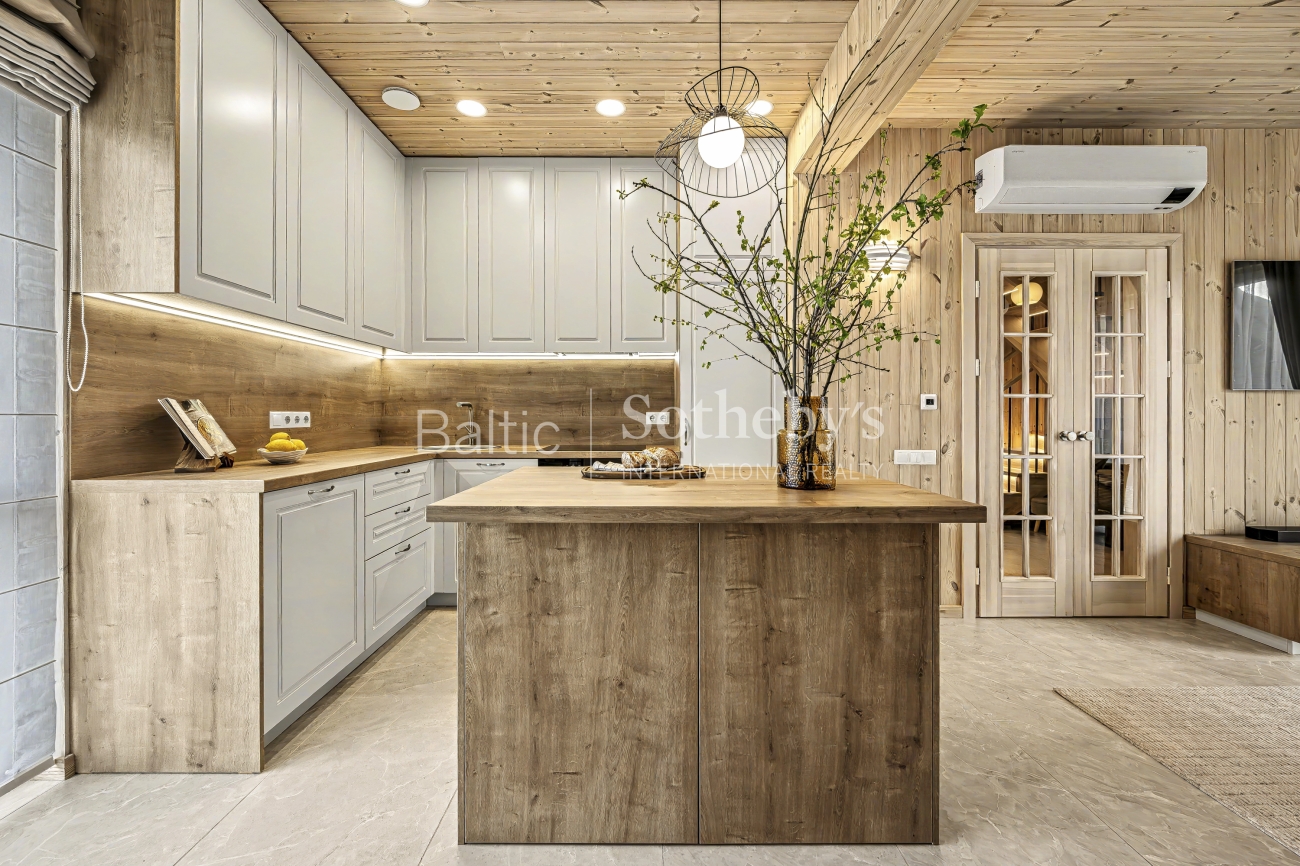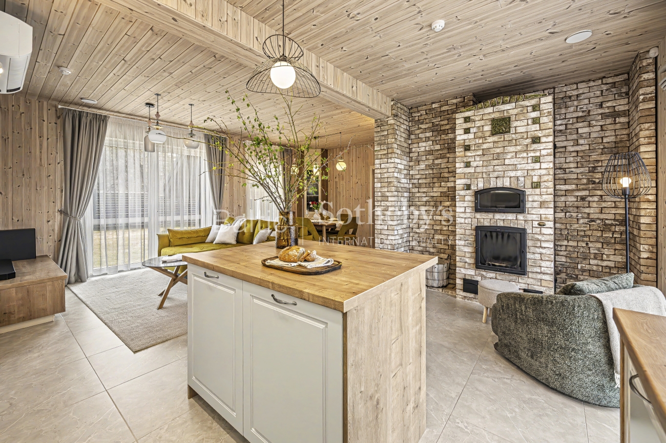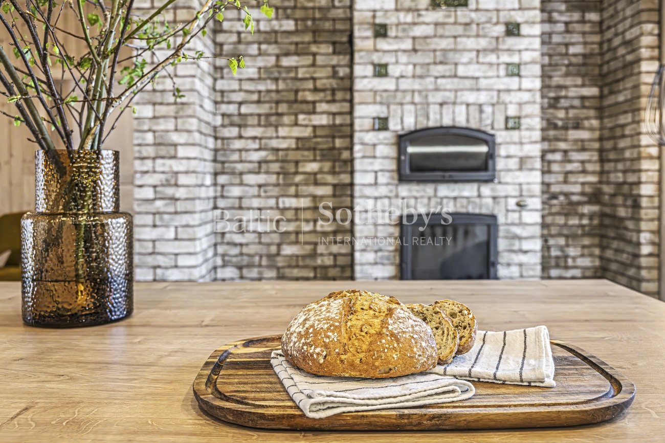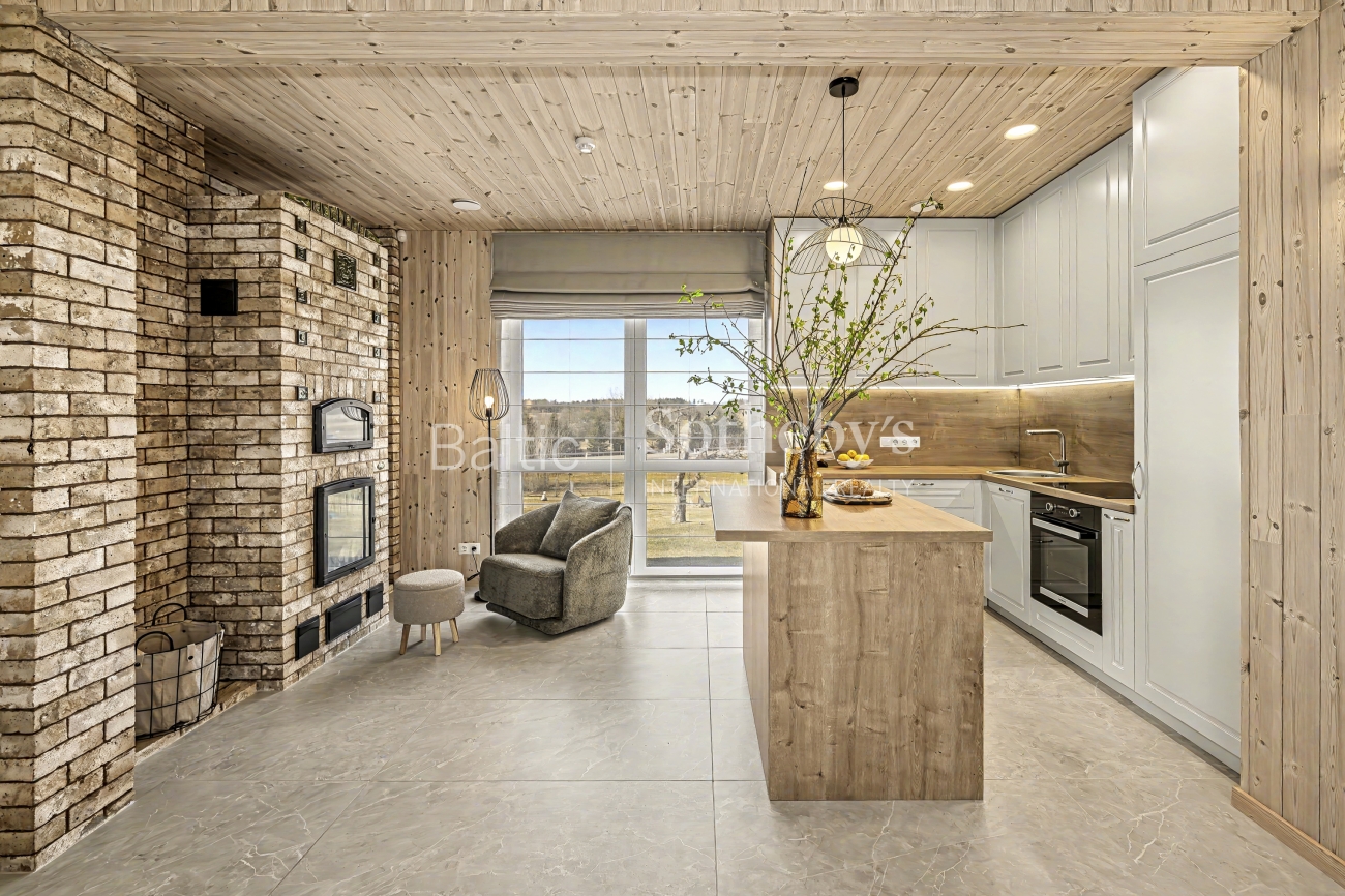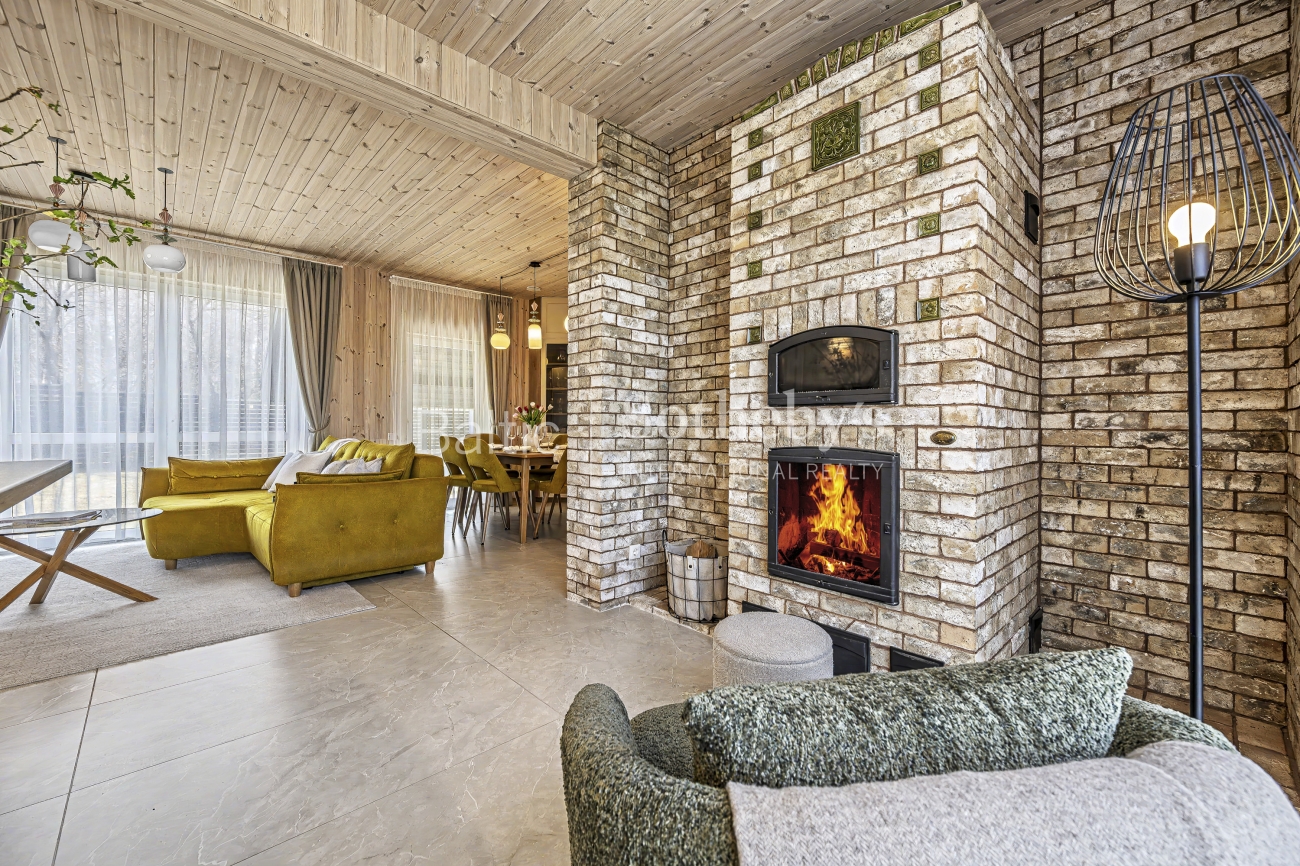 The main house is functionally designed for living: it features two bedrooms, a study, and a bathroom. The interior stands out for its use of natural materials—wood finishes, light colors, and a cohesive design create a lively, cozy, and warm atmosphere. The main living area consists of a combined living room, dining room, and kitchen zone. A unique stove takes center stage in the living room, lending the home a cozy feel and inviting you to spend longer evenings here. This is a distinctive feature of the home that not only provides pleasant warmth but also allows you to prepare authentic homemade food in the bread oven. Antique yellowish-toned bricks give the room a unique visual character, while motifs and symbols of national heritage further adorn it. “Rosettes” are miniature elements recreated based on the ornamentation of the Palace of the Grand Dukes, symbolizing the rebirth of the entire homestead. Large windows ensure abundant natural light and allow you to enjoy the surrounding views. The kitchen with an island blends harmoniously into the overall space and stands out for its functionality—it is suited for daily use, morning coffee, leisurely breakfasts, or evening conversations, as well as for entertaining guests.
