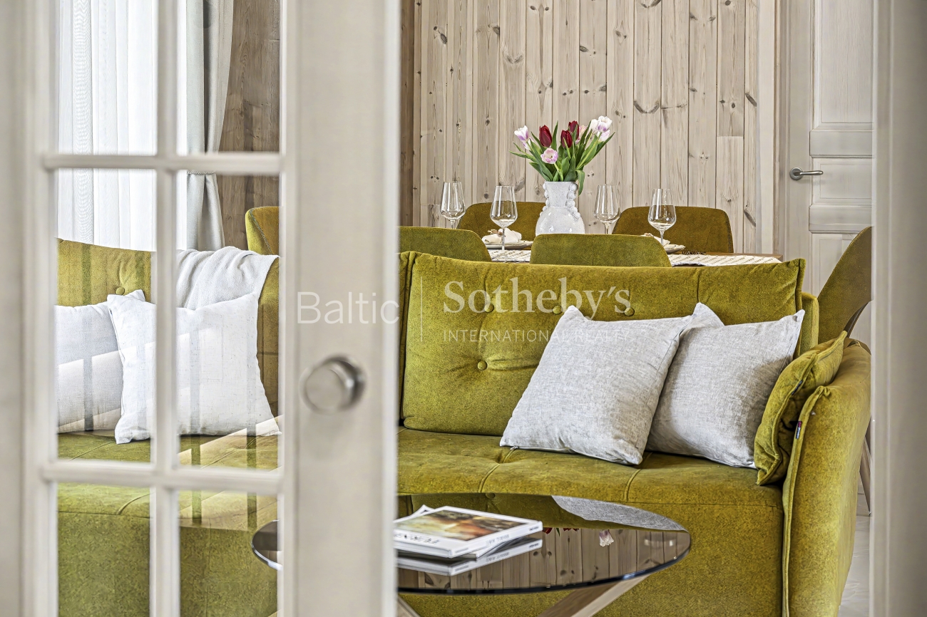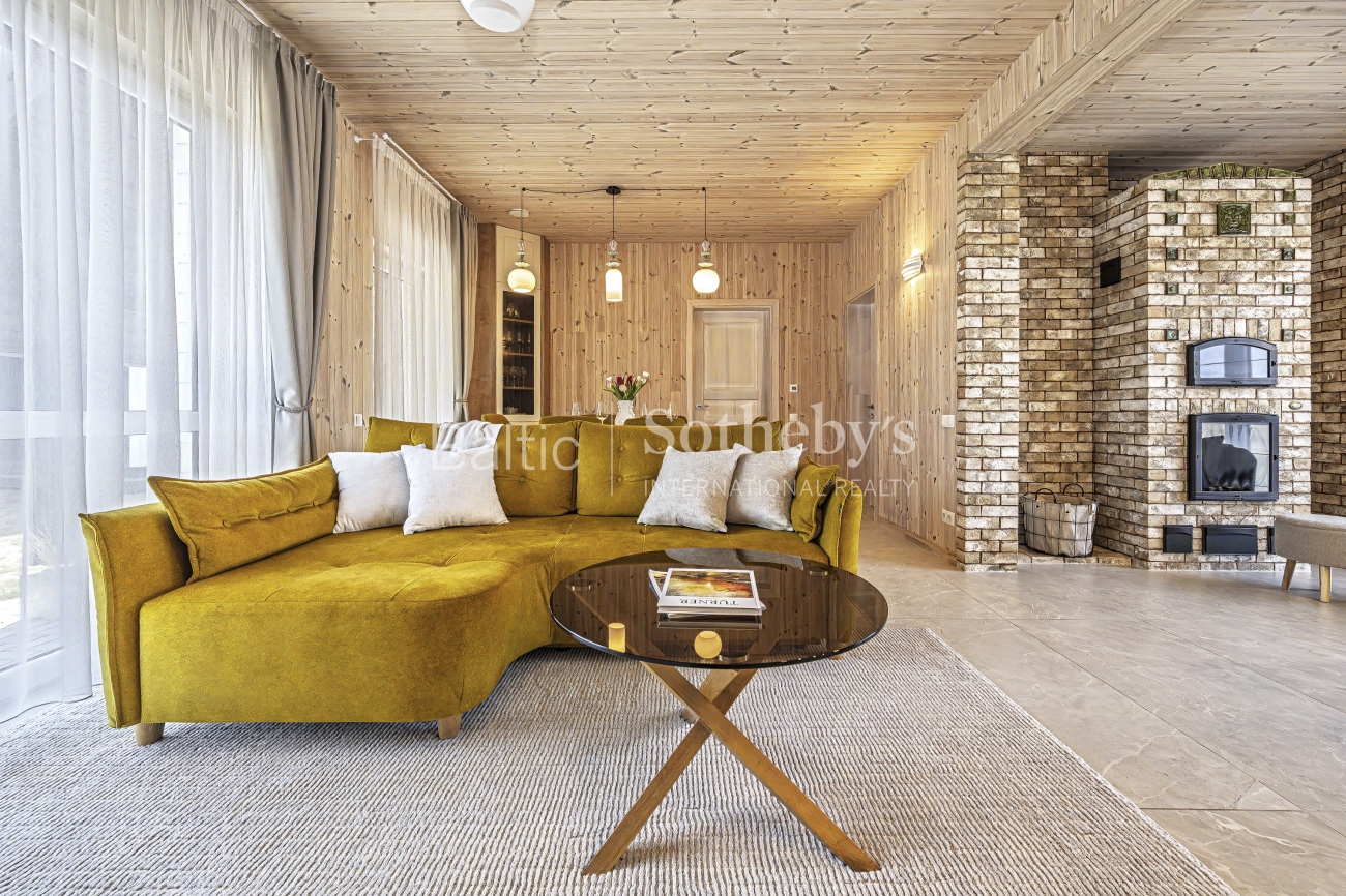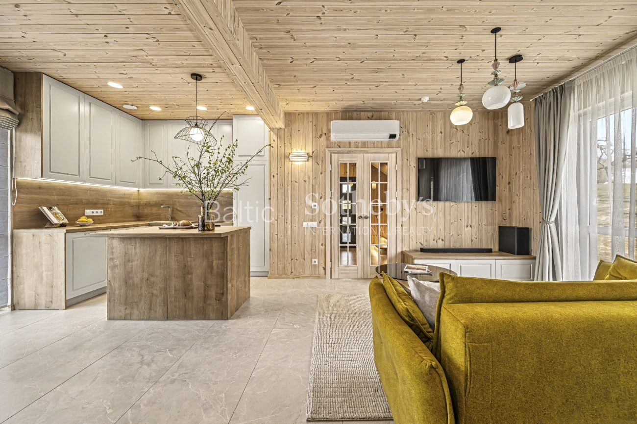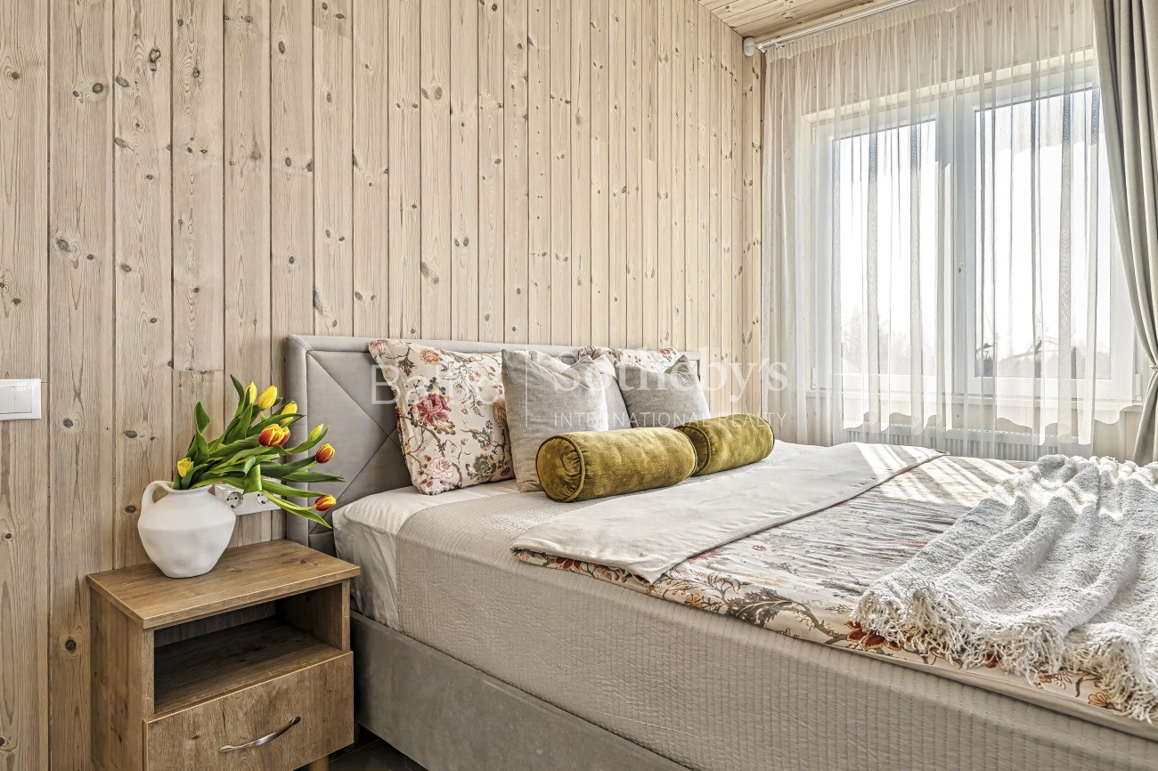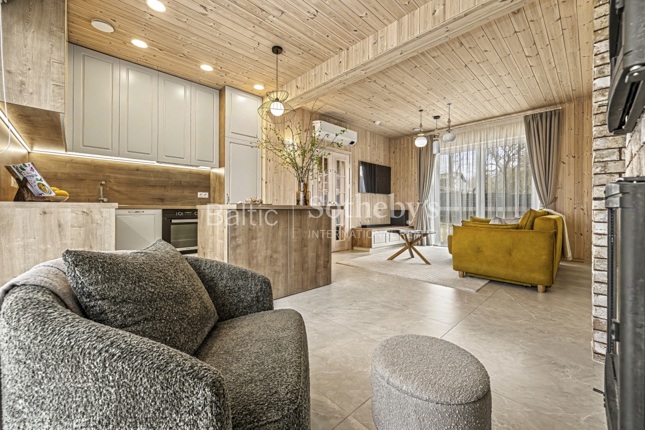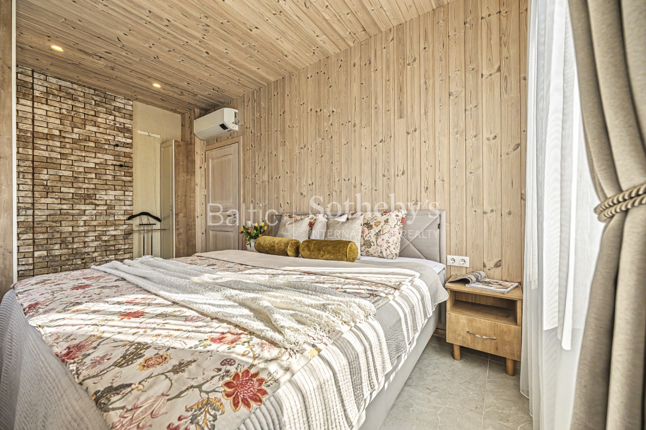 The main house is functionally designed for living: it features two bedrooms, a study, and a bathroom. The interior stands out for its use of natural materials—wood finishes, light colors, and a cohesive design create a lively, cozy, and warm atmosphere. The main living area consists of a combined living room, dining room, and kitchen zone. A unique stove takes center stage in the living room, lending the home a cozy feel and inviting you to spend longer evenings here. This is a distinctive feature of the home that not only provides pleasant warmth but also allows you to prepare authentic homemade food in the bread oven. Antique yellowish-toned bricks give the room a unique visual character, while motifs and symbols of national heritage further adorn it. “Rosettes” are miniature elements recreated based on the ornamentation of the Palace of the Grand Dukes, symbolizing the rebirth of the entire homestead. Large windows ensure abundant natural light and allow you to enjoy the surrounding views. The kitchen with an island blends harmoniously into the overall space and stands out for its functionality—it is suited for daily use, morning coffee, leisurely breakfasts, or evening conversations, as well as for entertaining guests.