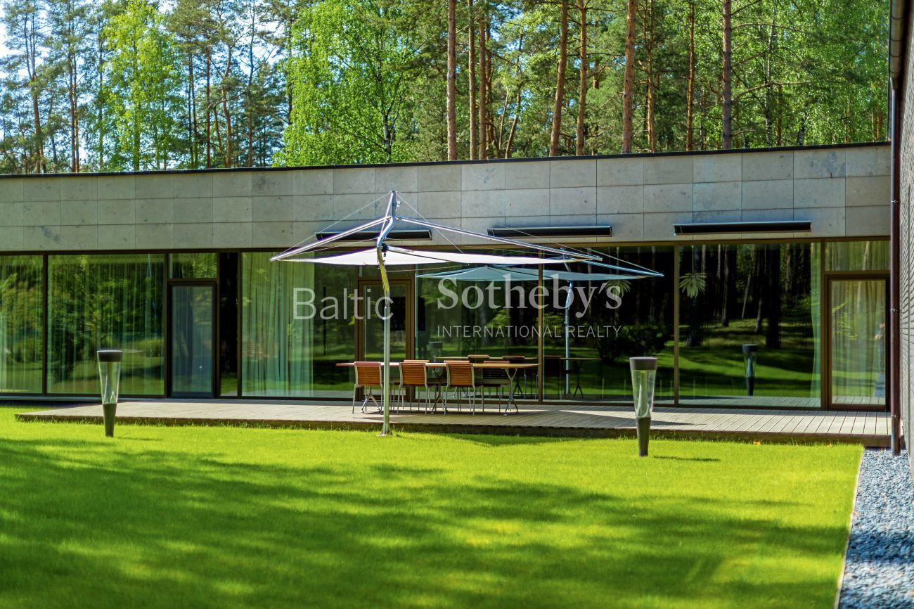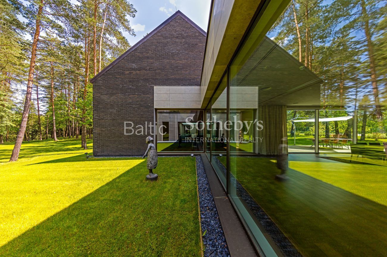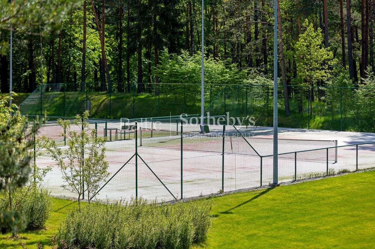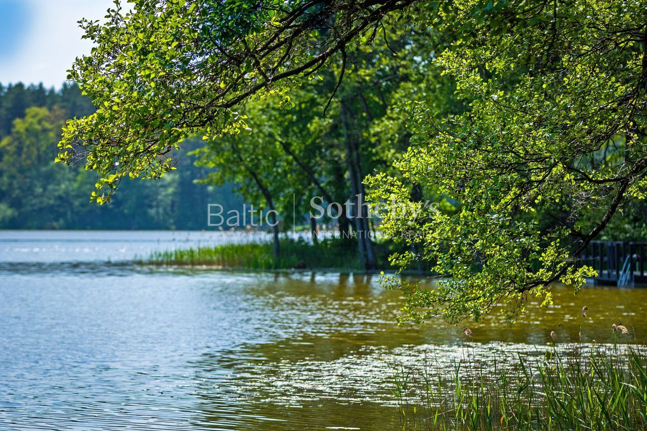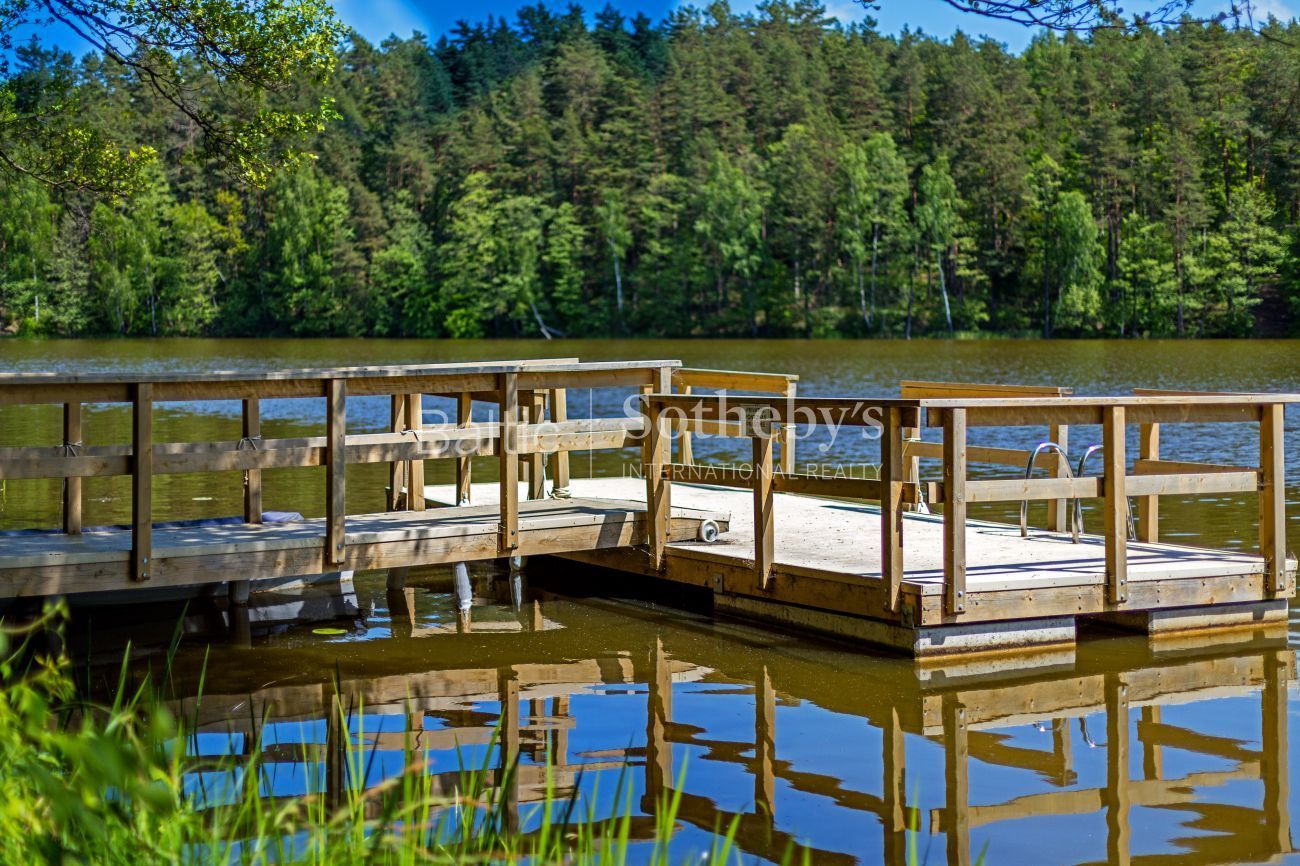 Impeccable yard surrounding the house, which covers almost 100 ares, the evergreen pine trees and original sculptures seen through large windows complement the interior of the house. Spacious terraces surround the house inviting to take a minute to rest outside. There is a basketball and a tennis court in the territory for active leisure enthusiasts, and a playground for little ones. There are 5 parking spaces. An exceptional advantage of this house is its direct access to Gulbinai lake, which has a pontoon bridge.