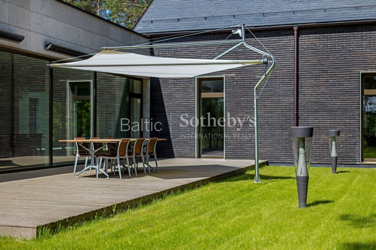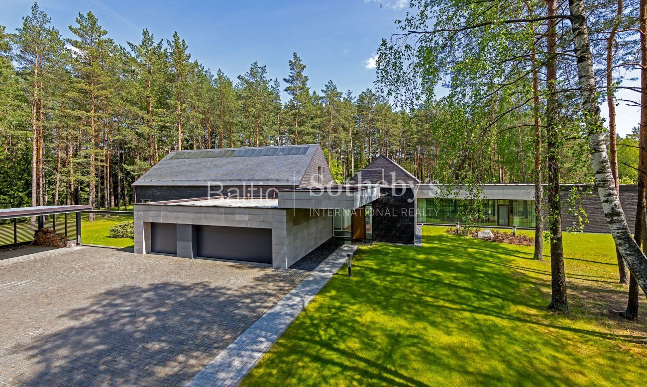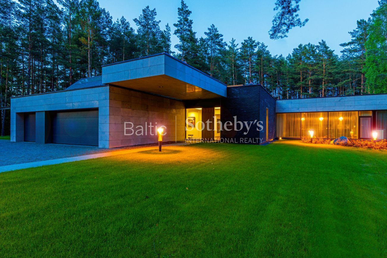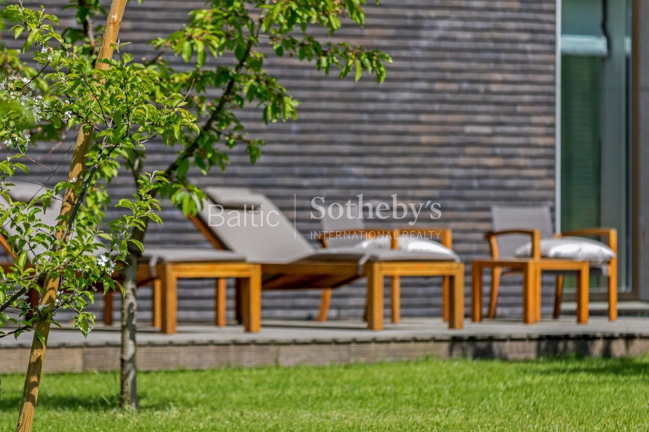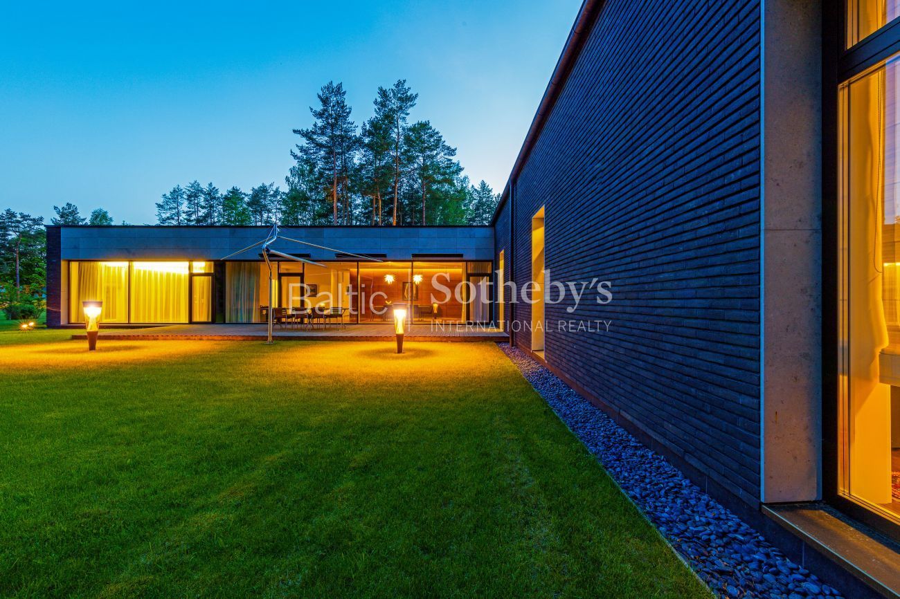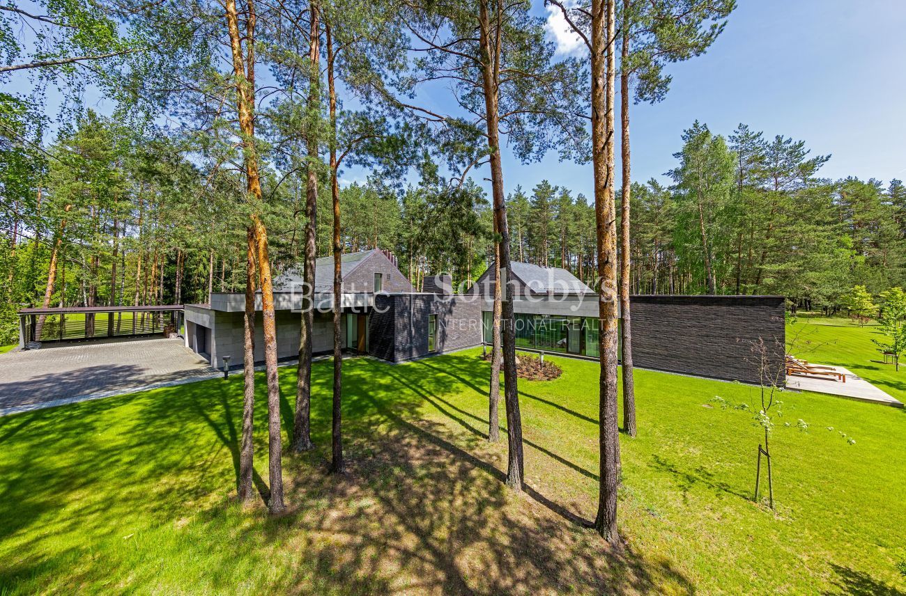 Impeccable yard surrounding the house, which covers almost 100 ares, the evergreen pine trees and original sculptures seen through large windows complement the interior of the house. Spacious terraces surround the house inviting to take a minute to rest outside. There is a basketball and a tennis court in the territory for active leisure enthusiasts, and a playground for little ones. There are 5 parking spaces. An exceptional advantage of this house is its direct access to Gulbinai lake, which has a pontoon bridge.