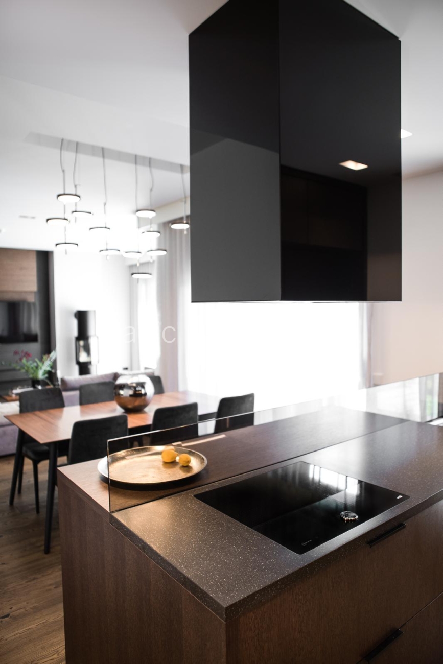 The interior features a cohesive design concept, defined by natural materials, dark wood finishes, architectural lighting, and carefully considered details throughout. The spacious living area creates a warm yet representative atmosphere, ideal for both everyday family life and entertaining guests. The kitchen and dining area are seamlessly integrated into the main living space, combining functionality with refined aesthetics.