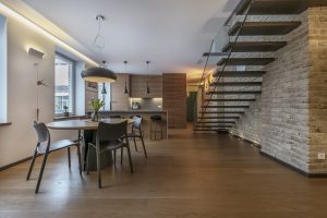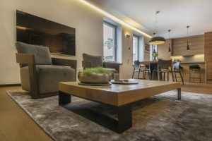 Rafinuotų apartamentų įrengimui naudotos itin kokybiškos ir prabangios medžiagos: Karelijos ąžuolo grindys, riešutmedis, oksiduotas metalas, stiklas, restauruotas autentiškas XIX a. plytų mūras.