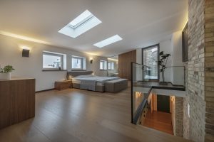 Prabangus butas itin funkcionaliai suplanuotas per du aukštus, o kiekviena erdvė kruopščiai apgalvota. Pirmajame aukšte rasite holą su integruotomis spintomis, vonios kambarį, erdvią svetainę su valgomojo zona bei virtuvę su sala. Pagrindiniai svetainės akcentai – židinys ir stiklinis liukas lubose, per kurį skverbiasi šviesa, krintanti iš antrajame aukšte esančių stoglangių.