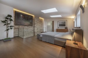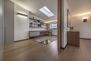 Antrajame parduodamų apartamentų aukšte – didelė erdvė, skirta poilsiui ir darbui. Miegamąjį nuo darbo kambario skiria stumdomos durys, o vonios kambarys atskirtas stikline siena, tad erdvės pojūtis dar labiau sustiprintas.