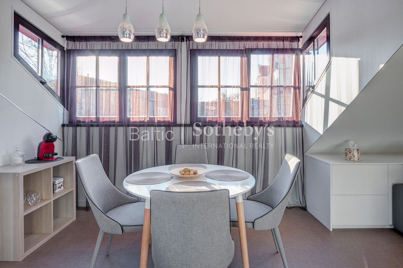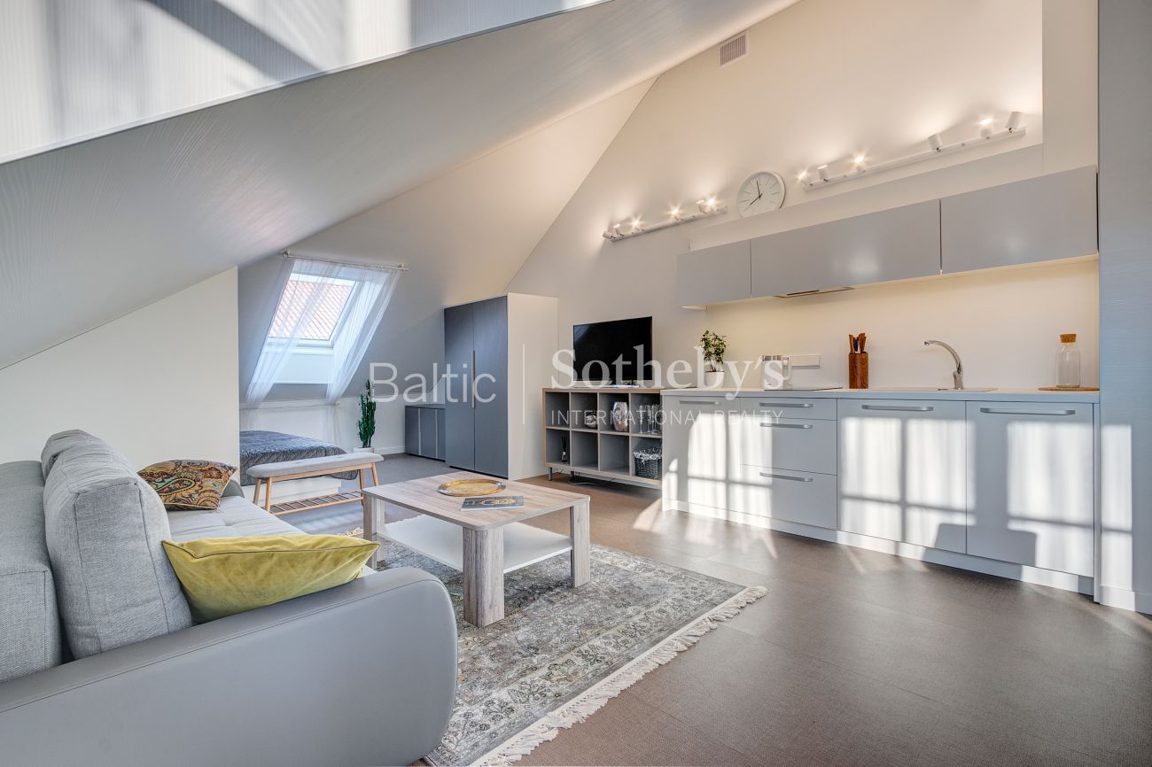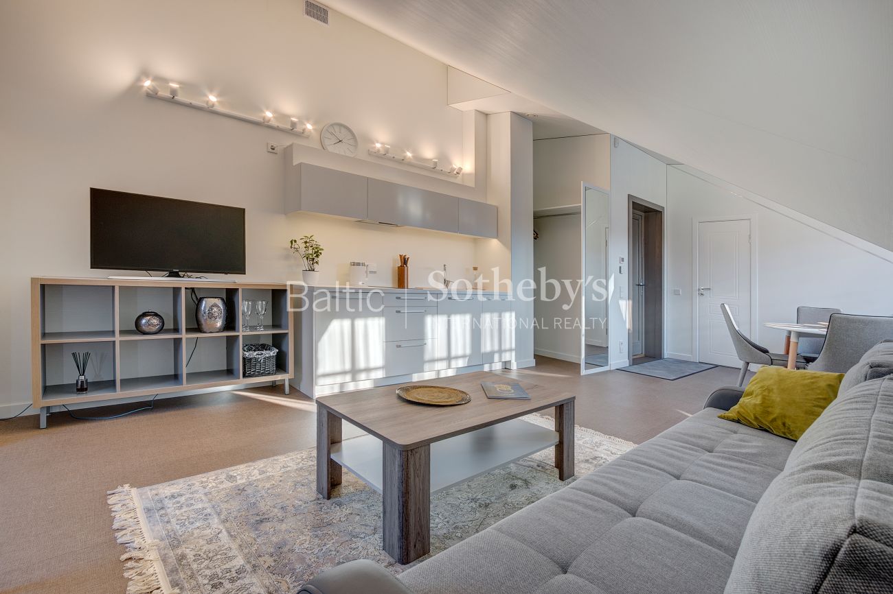 Apartamentų erdvė suzonuota į miegamojo, svetainės su virtuve ir valgomojo zonas. Aukštos palėpinės lubos suteikia apartamentams charakteringo savitumo, o šviesūs pasteliniai interjero atspalviai – lengvumo ir nepriekaištingos tvarkos jausmą.