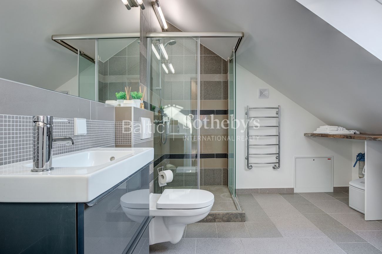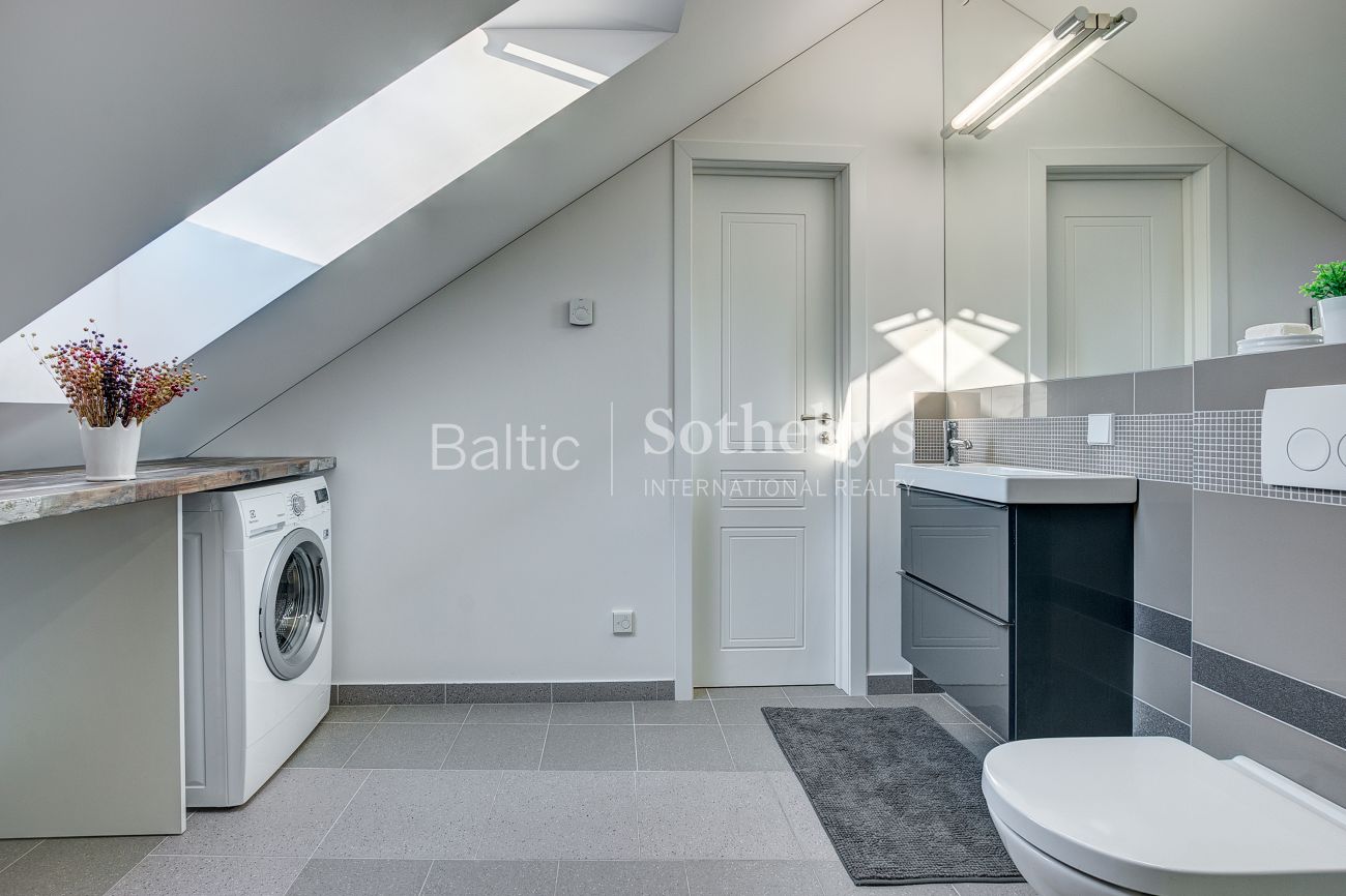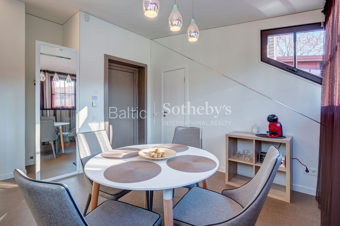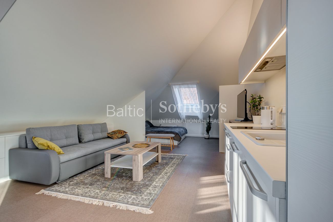Apartamentų erdvė suzonuota į miegamojo, svetainės su virtuve ir valgomojo zonas. Aukštos palėpinės lubos suteikia apartamentams charakteringo savitumo, o šviesūs pasteliniai interjero atspalviai – lengvumo ir nepriekaištingos tvarkos jausmą.