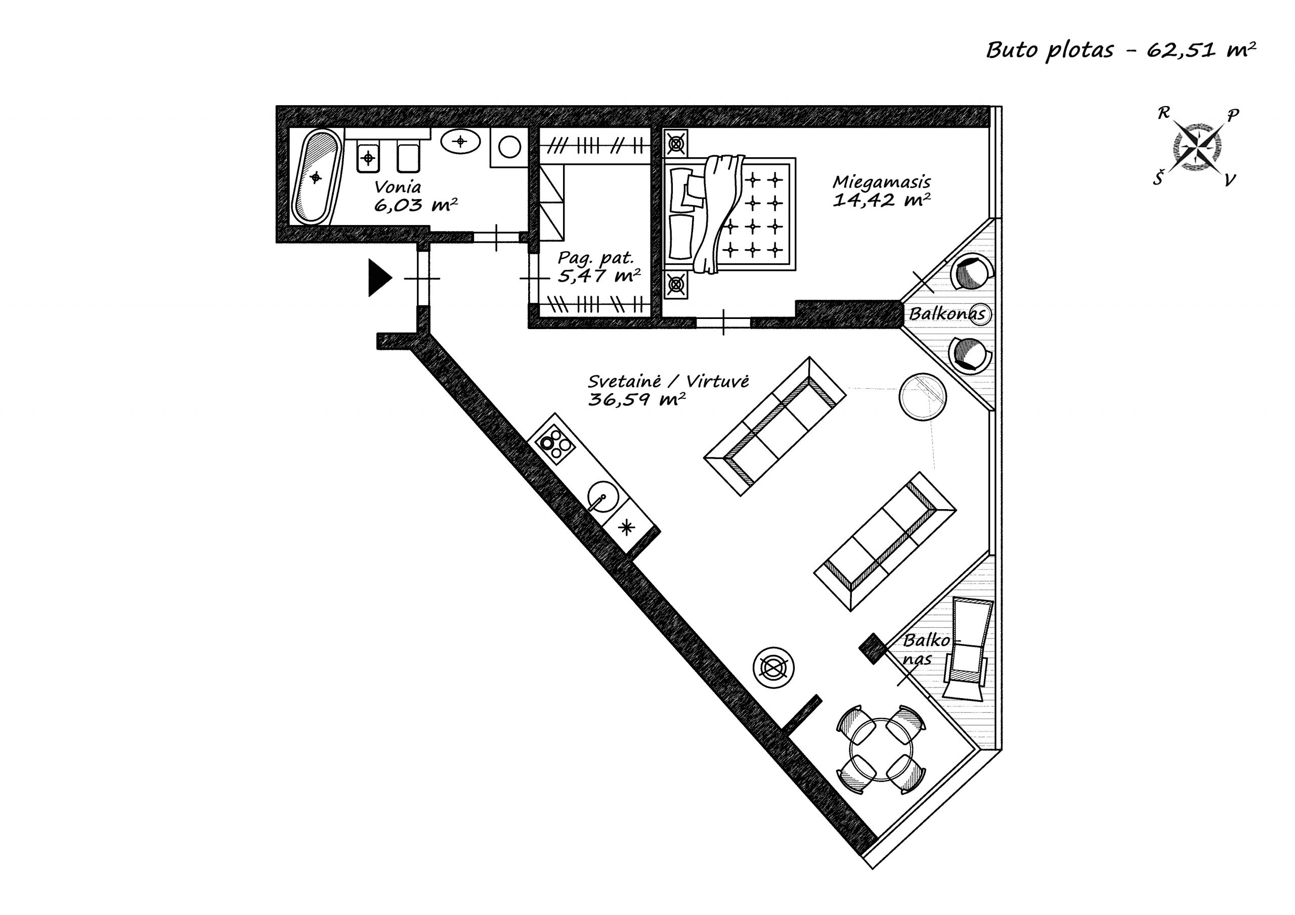 •Kambariai: 2 (3) + drabužinė (5,47 kv. m)