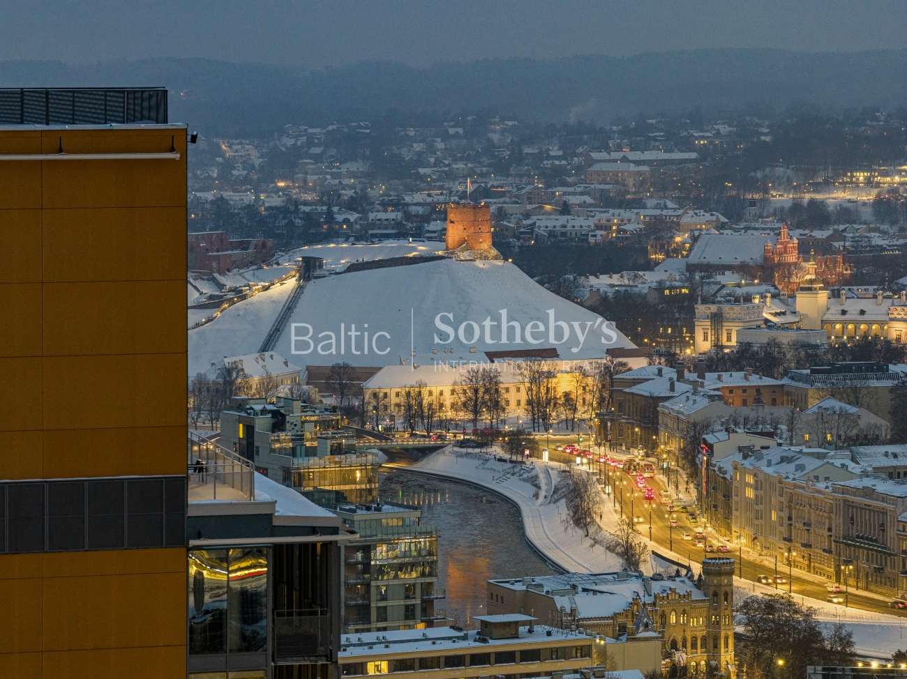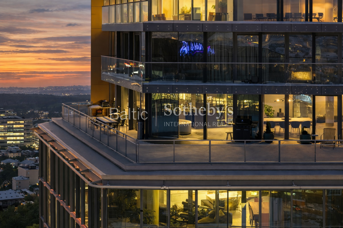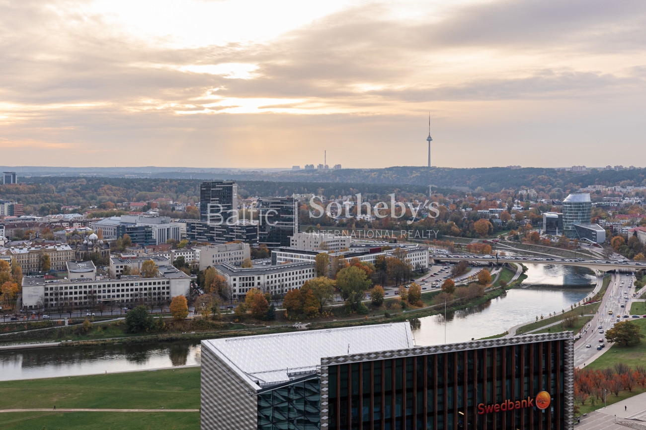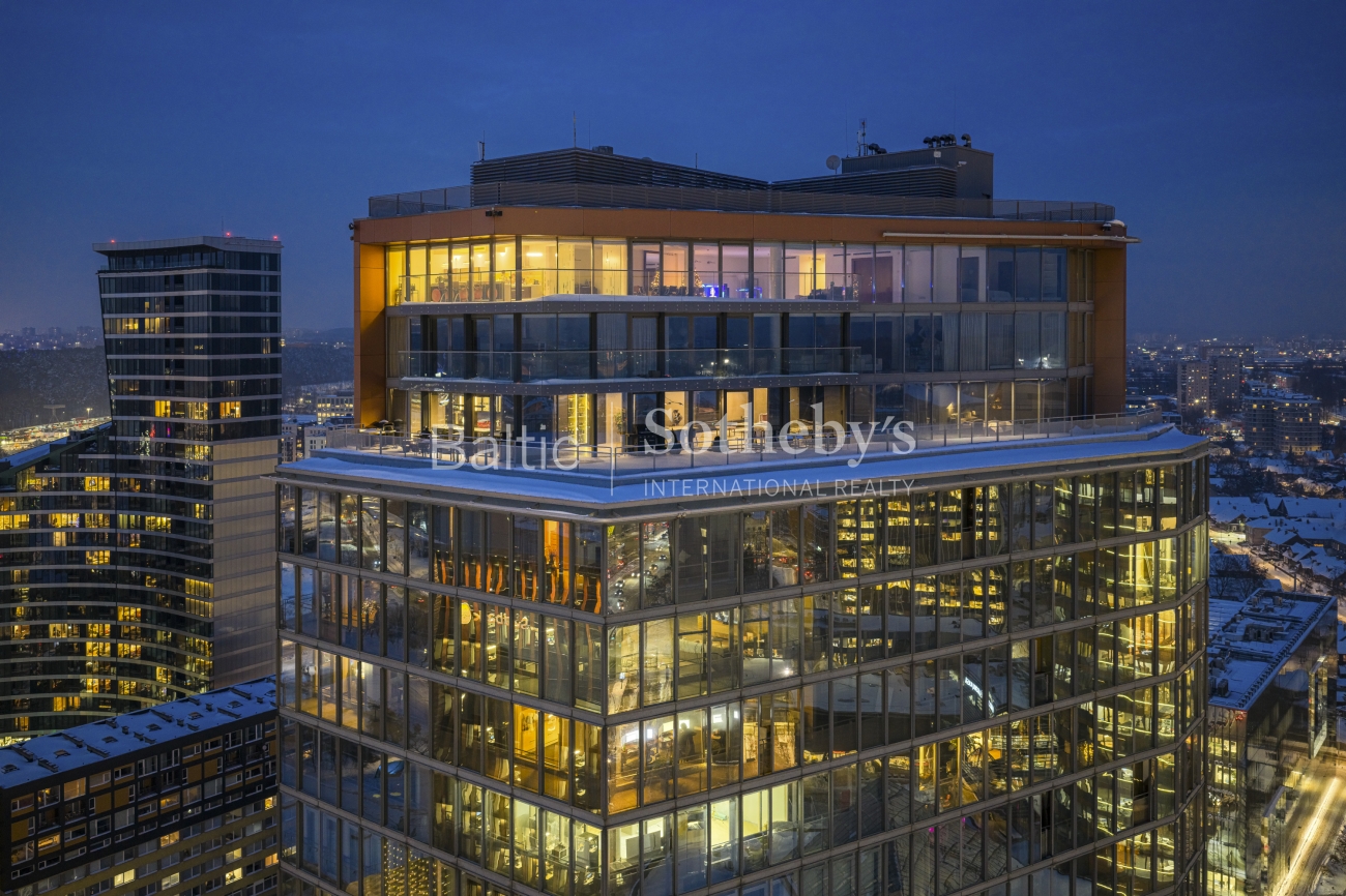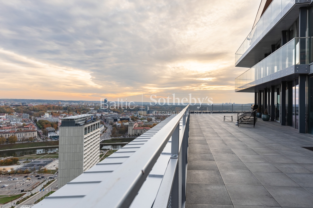 Šie išskirtiniai 312 kv.m prabangūs apartamentai su 220 kv.m terasa, atveria nepakartojamus miesto vaizdus. Čia kasdien matysite kaip kyla ir leidžiasi saulė, kaip bunda miestas ir vakare įsižiebia miesto žiburiai. Pagrindinė net 160 kv.m erdvė sujungia svetainę, valgomąjį ir virtuvę, sukurta galvojant apie modernų komfortą ir rafinuotumą. Vitrininiai langai leidžia natūraliai šviesai užtvindyti erdvę bei pabrėžia miesto grožį kiekviename apartamentų kampe.