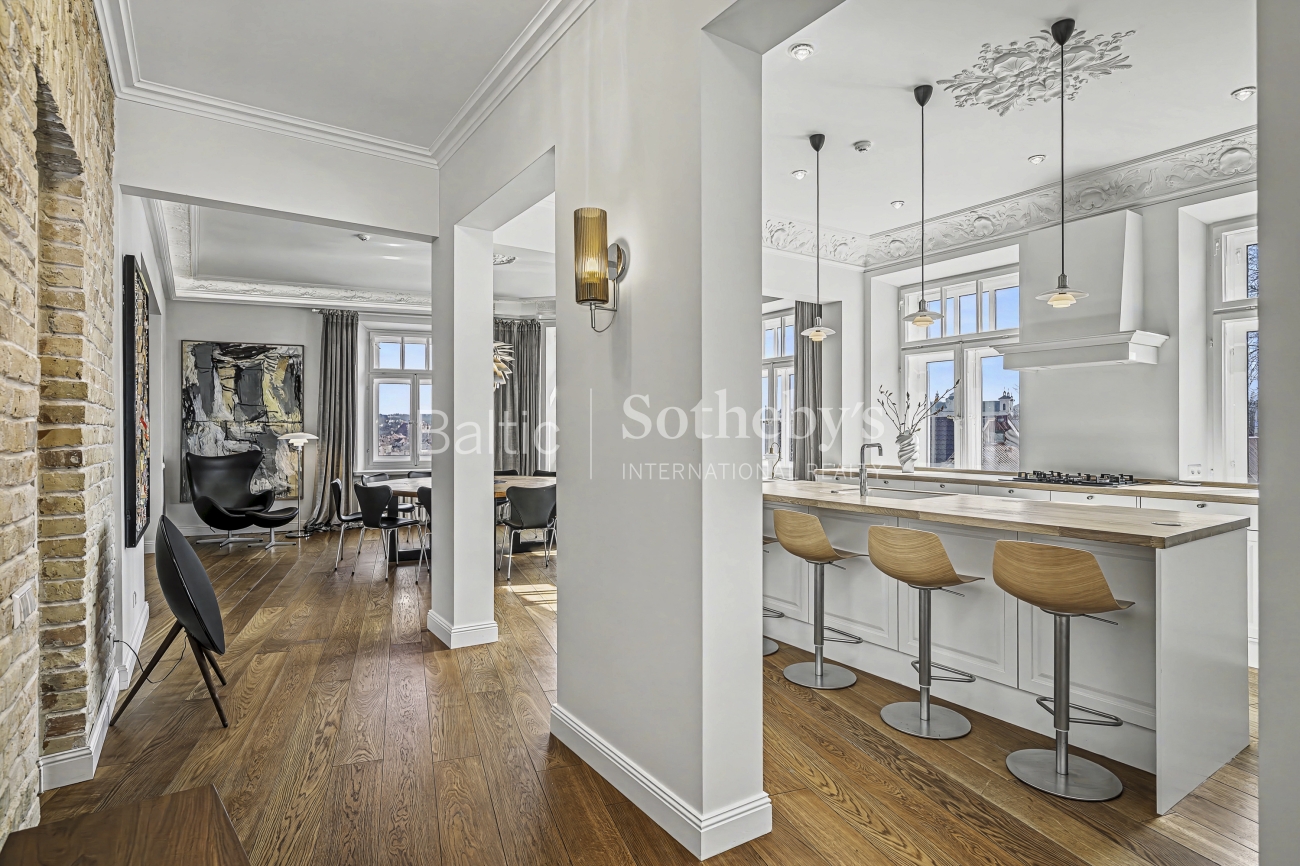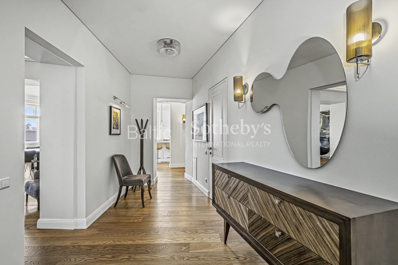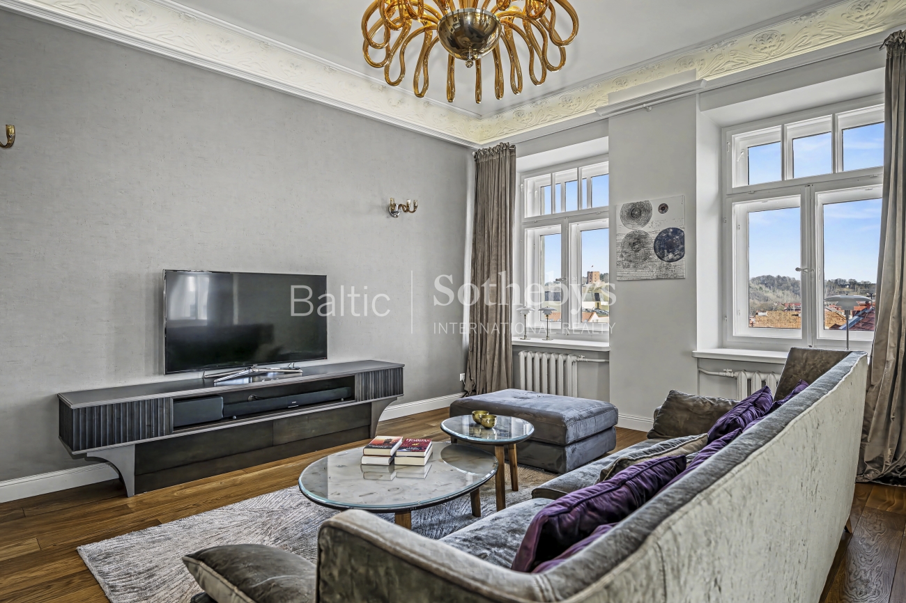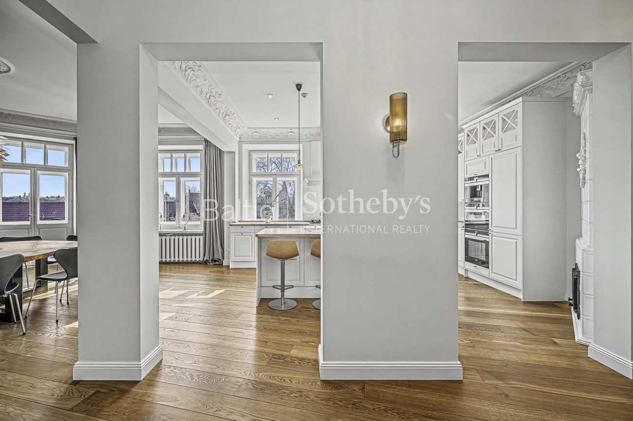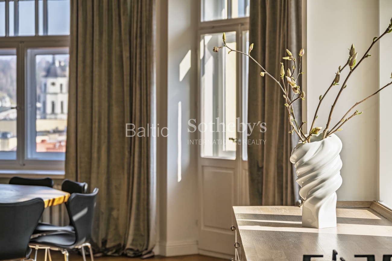 Aukštos lubos, autentiški gipso lipdiniai, plačios dvivėrės durys, židinys ir natūralaus medžio grindys išsaugo senamiesčio architektūrinį charakterį. Dideli langai pripildo erdves šviesa, o pro juos atsiveriantys miesto vaizdai – tarsi gyvas meno kūrinys.