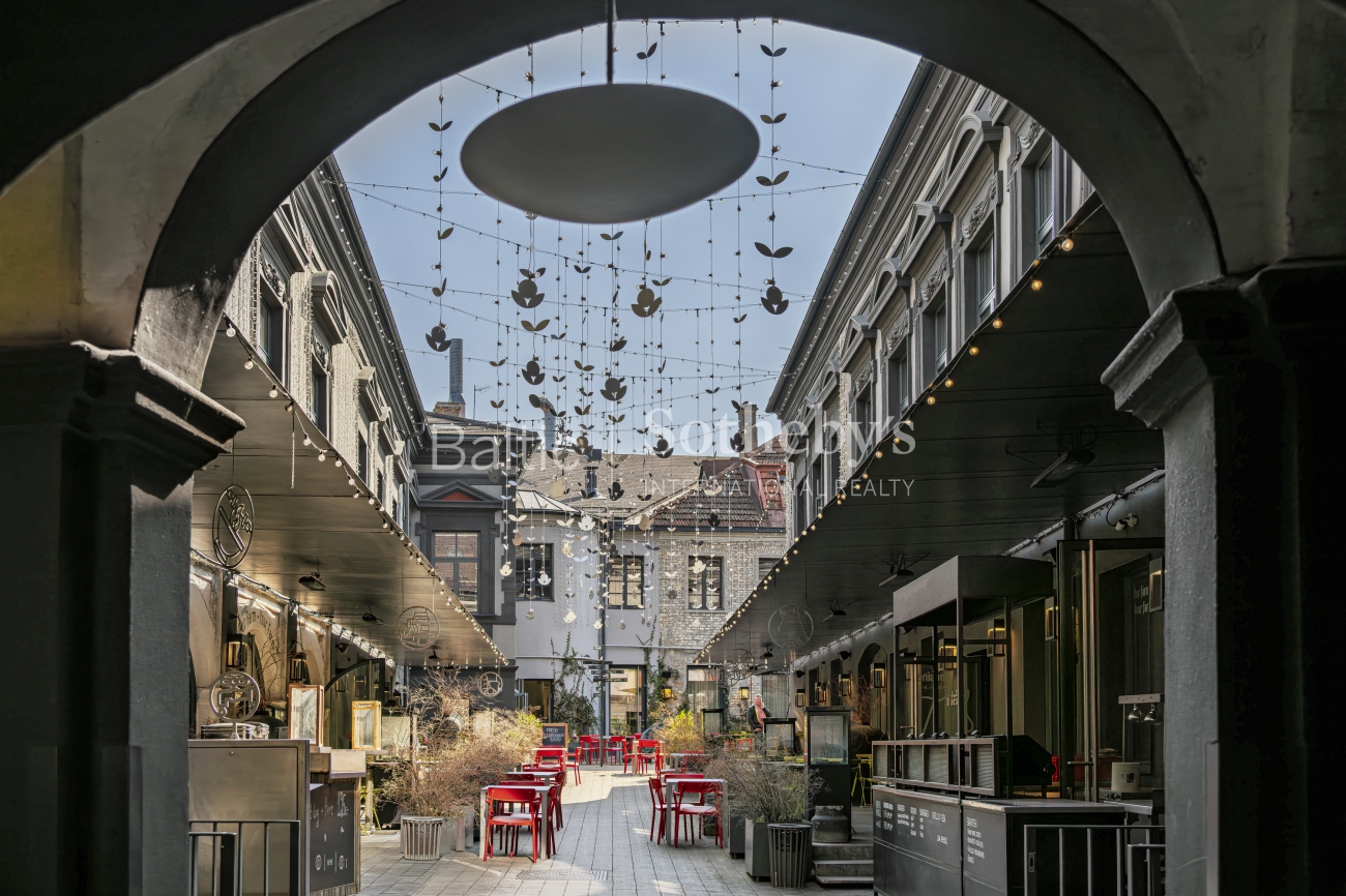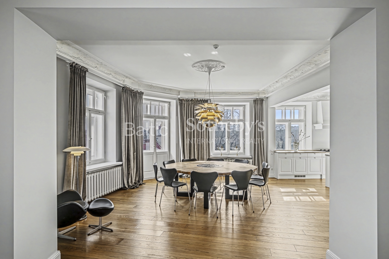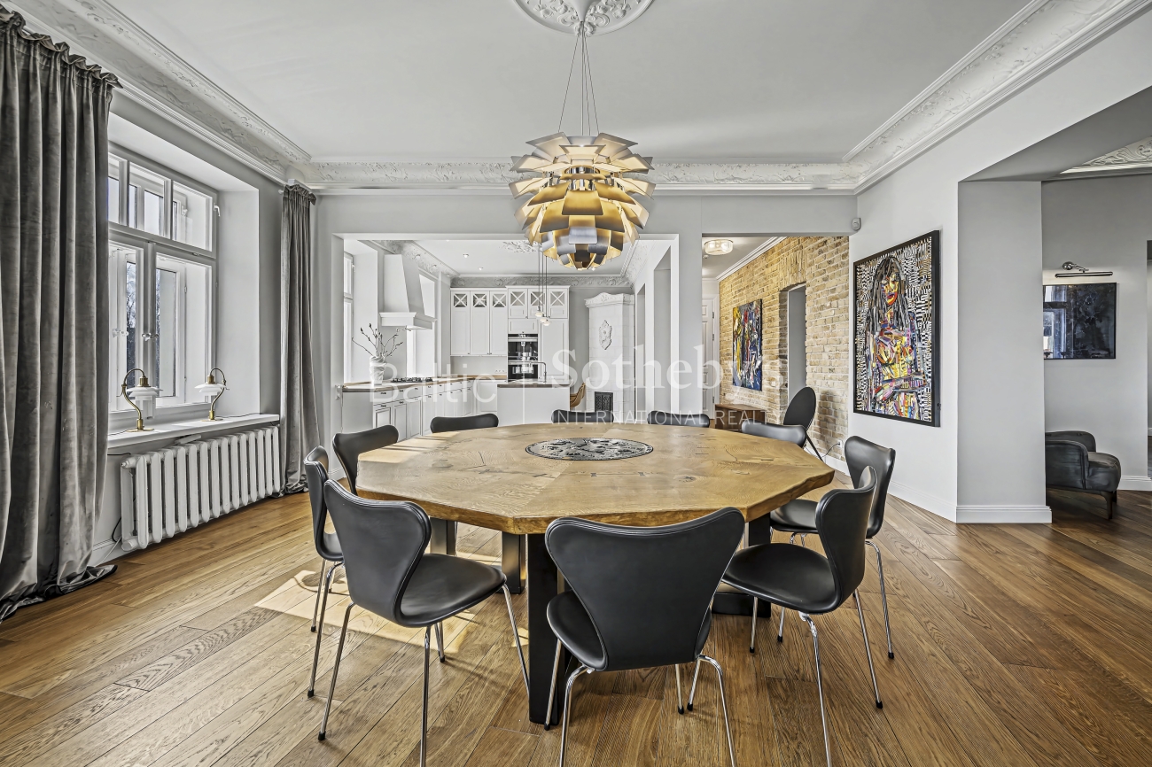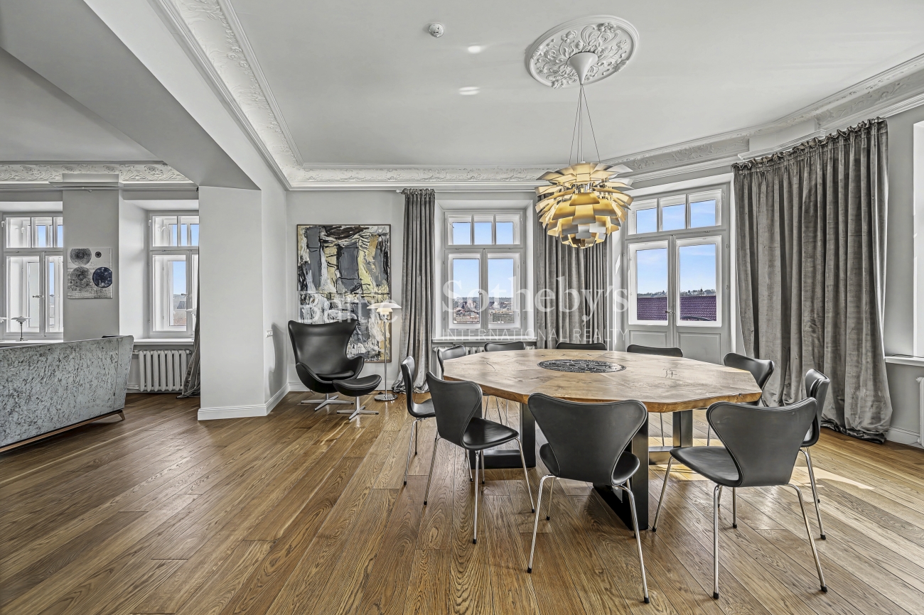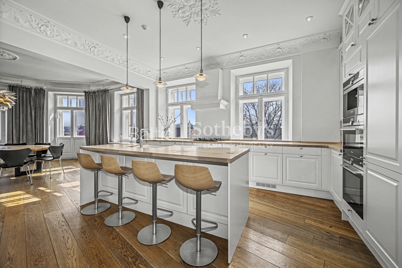 Aukštos lubos, autentiški gipso lipdiniai, plačios dvivėrės durys, židinys ir natūralaus medžio grindys išsaugo senamiesčio architektūrinį charakterį. Dideli langai pripildo erdves šviesa, o pro juos atsiveriantys miesto vaizdai – tarsi gyvas meno kūrinys.