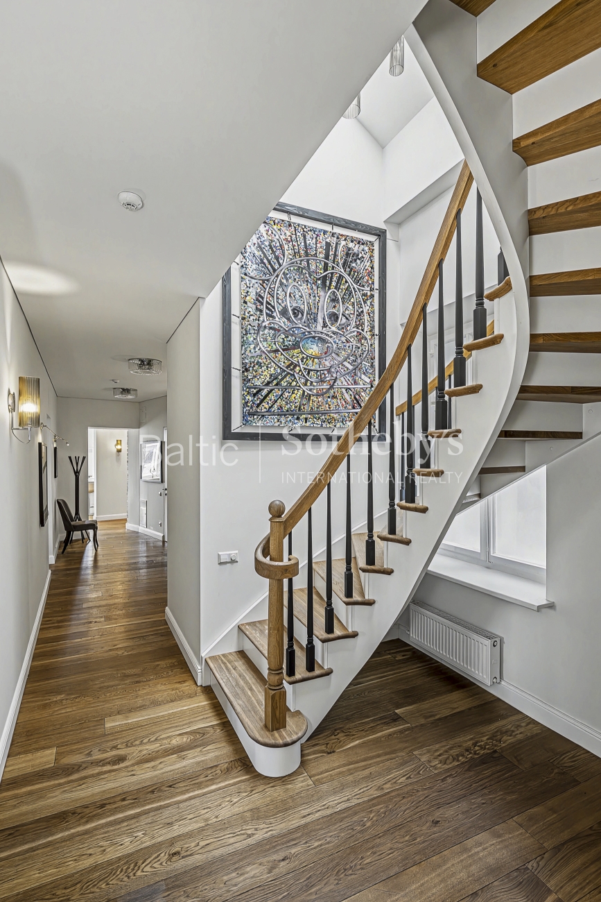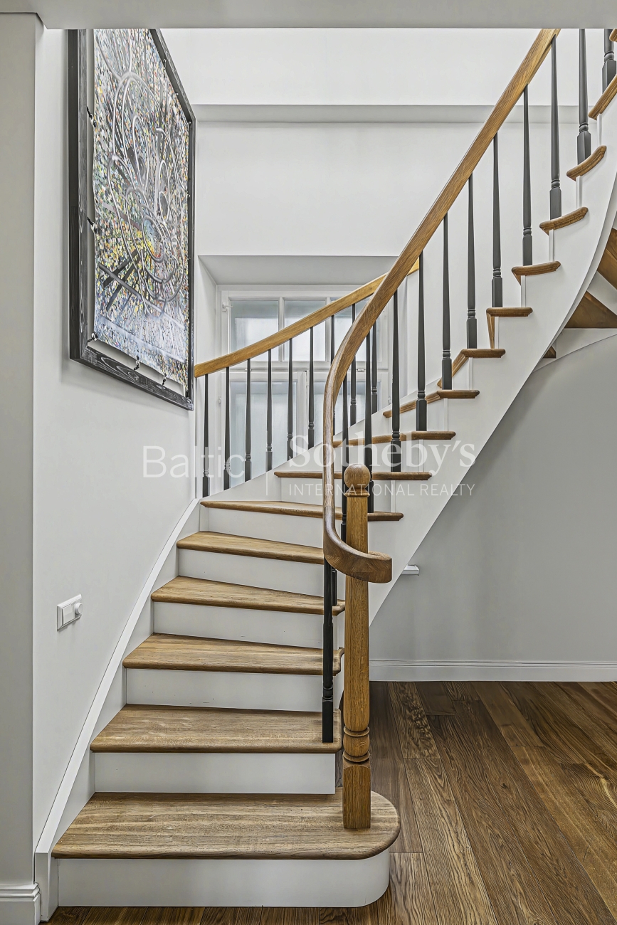 Interjeras išlaikytas nesenstantis – klasikinės linijos čia subtiliai dera su moderniais elementais, kuriančiais laiko nepaveikiamą eleganciją. Kiekviena detalė čia apgalvota – nuo apšvietimo iki medžiagų, kurios sustiprina šios rezidencijos autentiškumą.