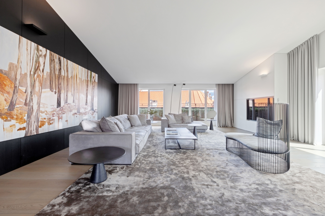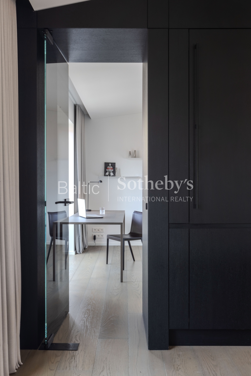 Interjeras ne mažiau įspūdingas nei pati erdvė. Įrengimui naudotos tik aukščiausios kokybės medžiagos: Rimadesio spintos ir pertvaros, Baxter baldai, Davide Groppi ir Flos šviestuvai, Gessi ir Agape santechnika bei keramika. Kiekviena detalė – nuo šviestuvo iki sienų apdailos – parinkta preciziškai, siekiant sukurti unikalią, rafinuotą atmosferą. Daug dėmesio skirta meno kūriniams, kurie subtiliai papildo erdvės konceptualumą. Penthousas parduodamas su visais prabangiais, individualiai pritaikytais baldais, kurie neatsiejami nuo šios erdvės charakterio.