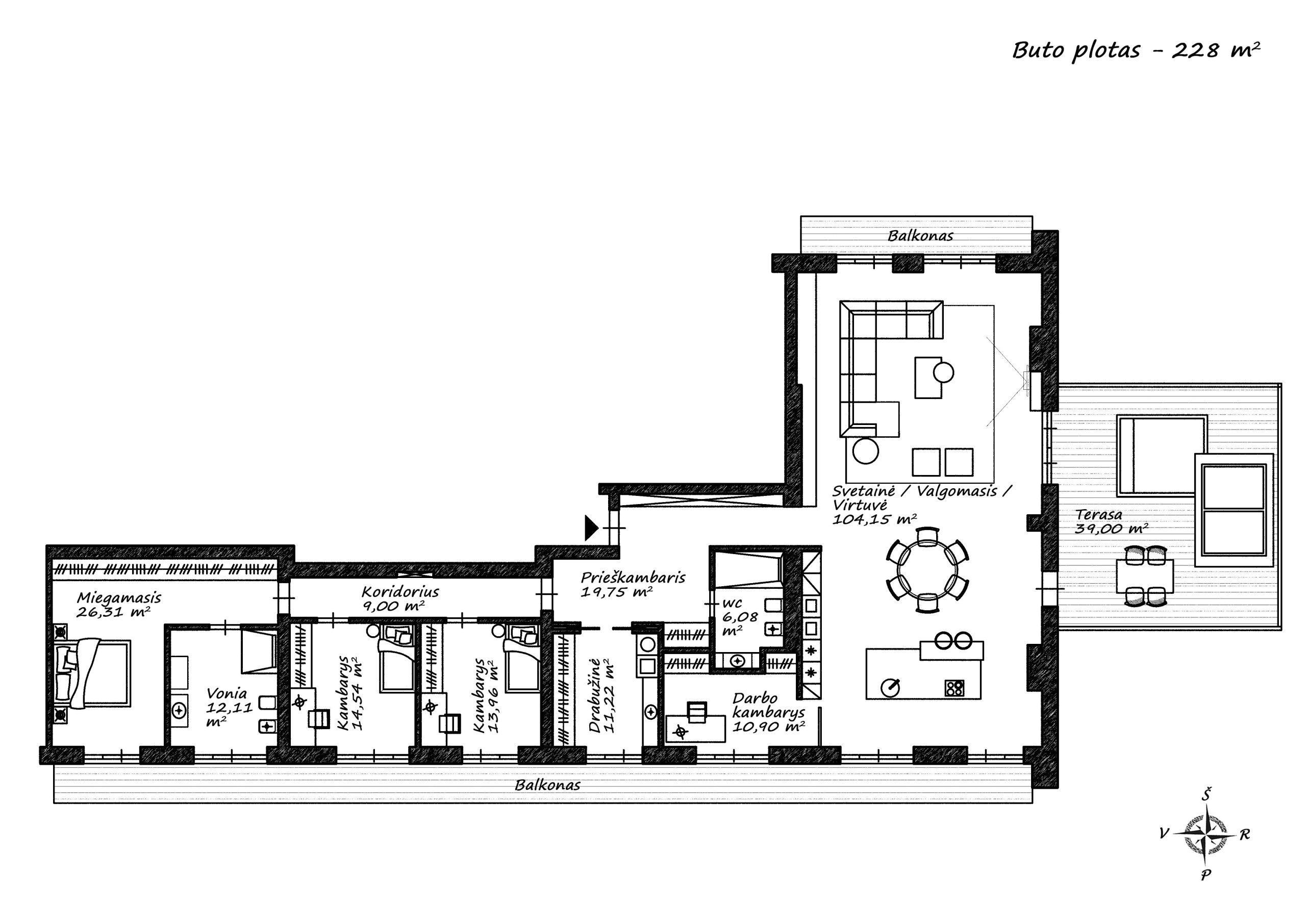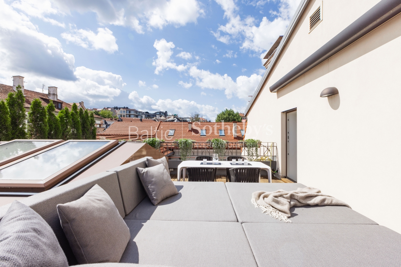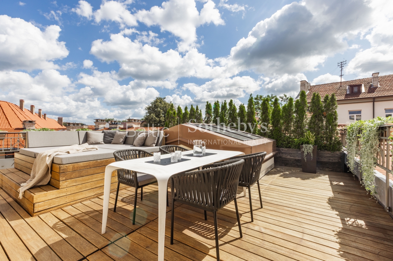 Iš svetainės galima patekti į erdvią privačią terasą, juosiančią visą penthousą. Tai ideali vieta mėgautis ramybe, saule ir tylos kupinomis akimirkomis, vis dar būnant miesto šurmulyje, kuris čia tarytum išnyksta. Į terasą galima patekti ir tiesiai iš miegamųjų kambarių, tad kiekviena diena prasideda su ryto saule ir miesto istorija. Visą namų perimetrą juosiantys balkonai suteikia dar daugiau privatumo, žalumos ir galimybę mėgautis grynu oru neišeinant iš namų.