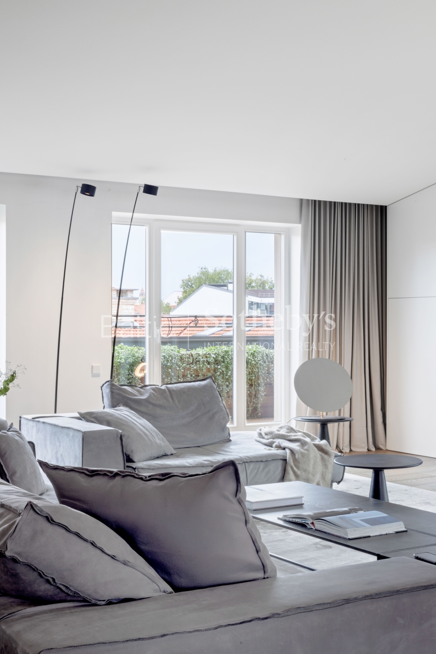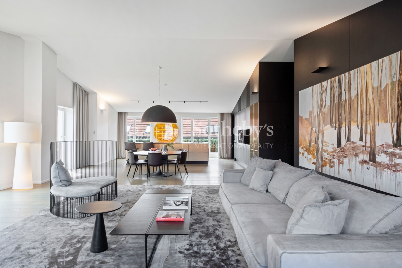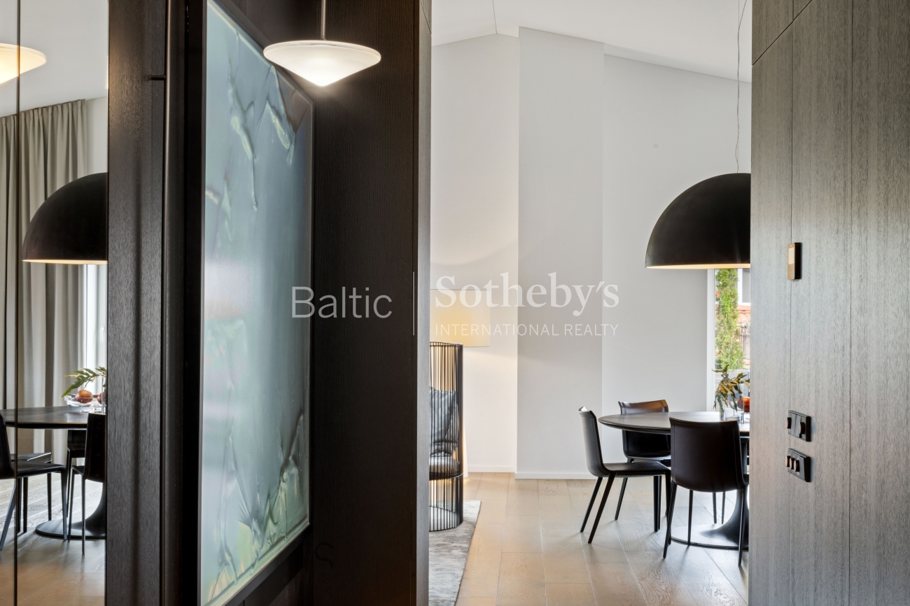 Apartamentai įrengti viršutiniame trečiajame pastato aukšte. Vos pravėrus duris pasitinka erdvus holas, vedantis tiesiai į įspūdingo dydžio svetainę. Ją supa beveik keturių metrų aukščio lubos ir didžiuliai vitrininiai langai, pro kuriuos sklinda gausi natūrali šviesa ir atsiveria urbanistiniai miesto centro vaizdai. Svetainė sklandžiai sujungta su modernia virtuvės zona, kurioje įrengta aukščiausios klasės „Siematic“ virtuvė su „Gaggenau“ ir „Miele“ buitine technika bei ilga, funkcionali sala – ne tik maisto ruošimui, bet ir jaukiems susitikimams su šeima ar draugais.