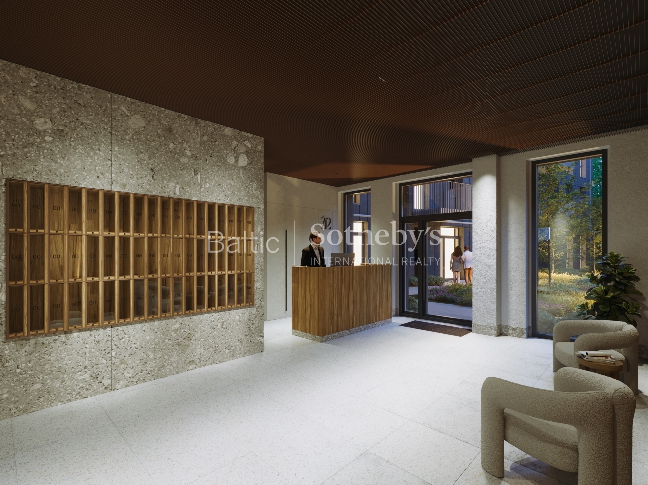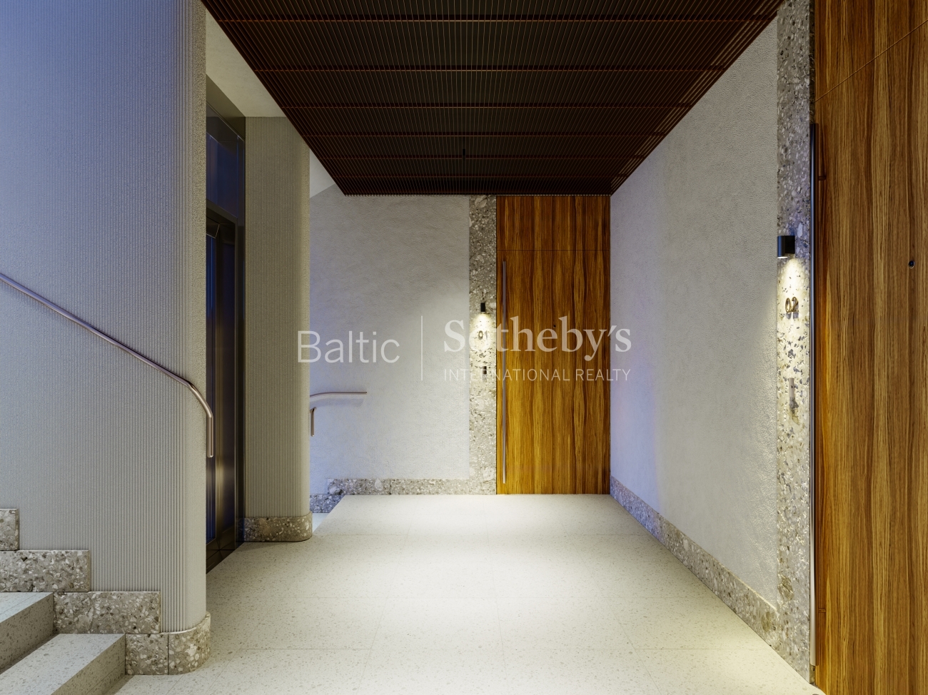 Vos įžengus iš išpuoselėto, žaliuojančio vidinio kiemo į pastato holą, gyventojus pasitinka konsjeržas, subtilus dizainas ir ilgaamžiai sprendimai: žalvario durų rankenos ir porankiai, klasikinės durys, natūralios medienos – eukalipto ir alyvmedžio – raštai.