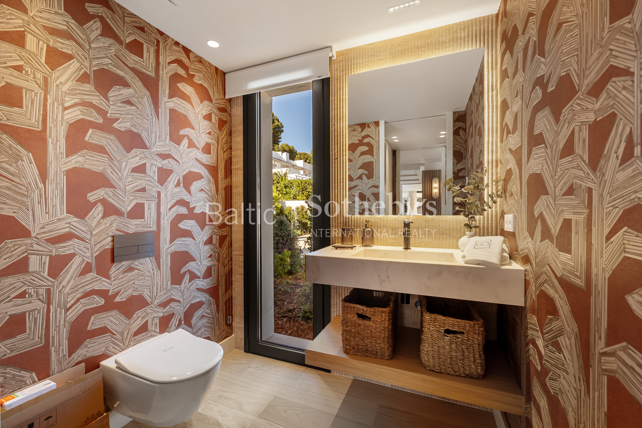 Ši išskirtinė vila išsiskiria įspūdinga architektūra, kuri harmoningai sujungia natūralias medžiagas ir modernius dizaino elementus. Nuo simetriškos fasado kompozicijos iki vešlios žalumos prie įėjimo – vilos eksterjeras spinduliuoja eleganciją ir rafinuotumą. Tikslios linijos ir dideli langai suteikia šiuolaikiško stiliaus pojūtį, o tradicinės čerpės subtiliai primena vietos kultūrą ir architektūros paveldą.