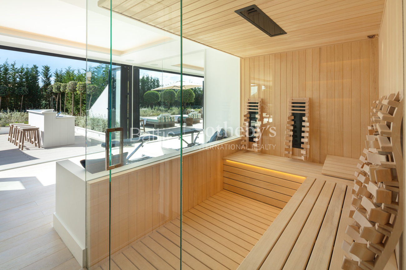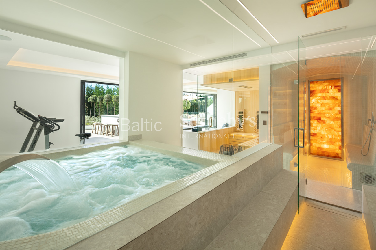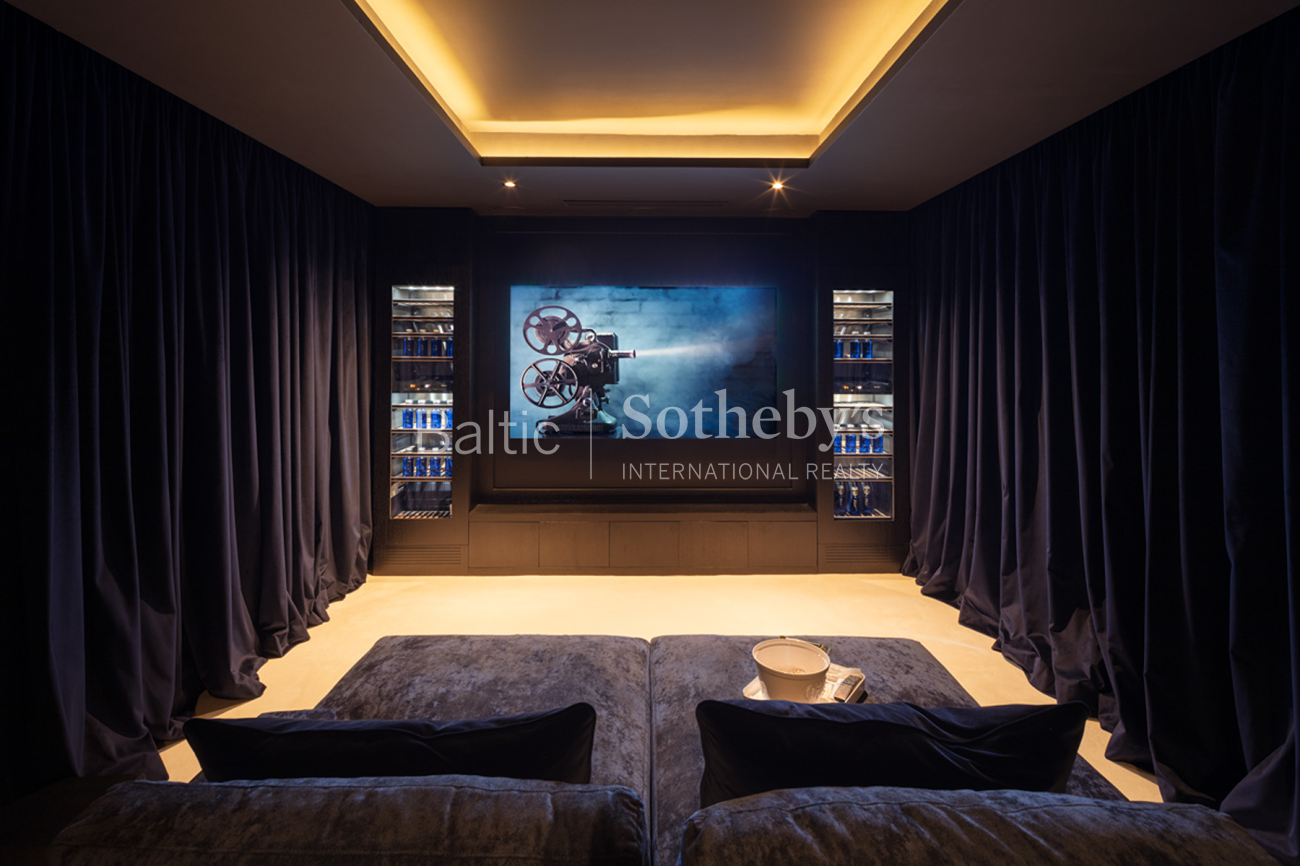 Tarp papildomų patogumų – kino salė, SPA zona su sūkurine vonia, sauna ir turkiška pirtimi, taip pat masažo/procedūrų kambarys. Taip pat įrengtas privatūs padelio kortas – puikus pasirinkimas mėgstantiems sportuoti neišeinant iš namų.