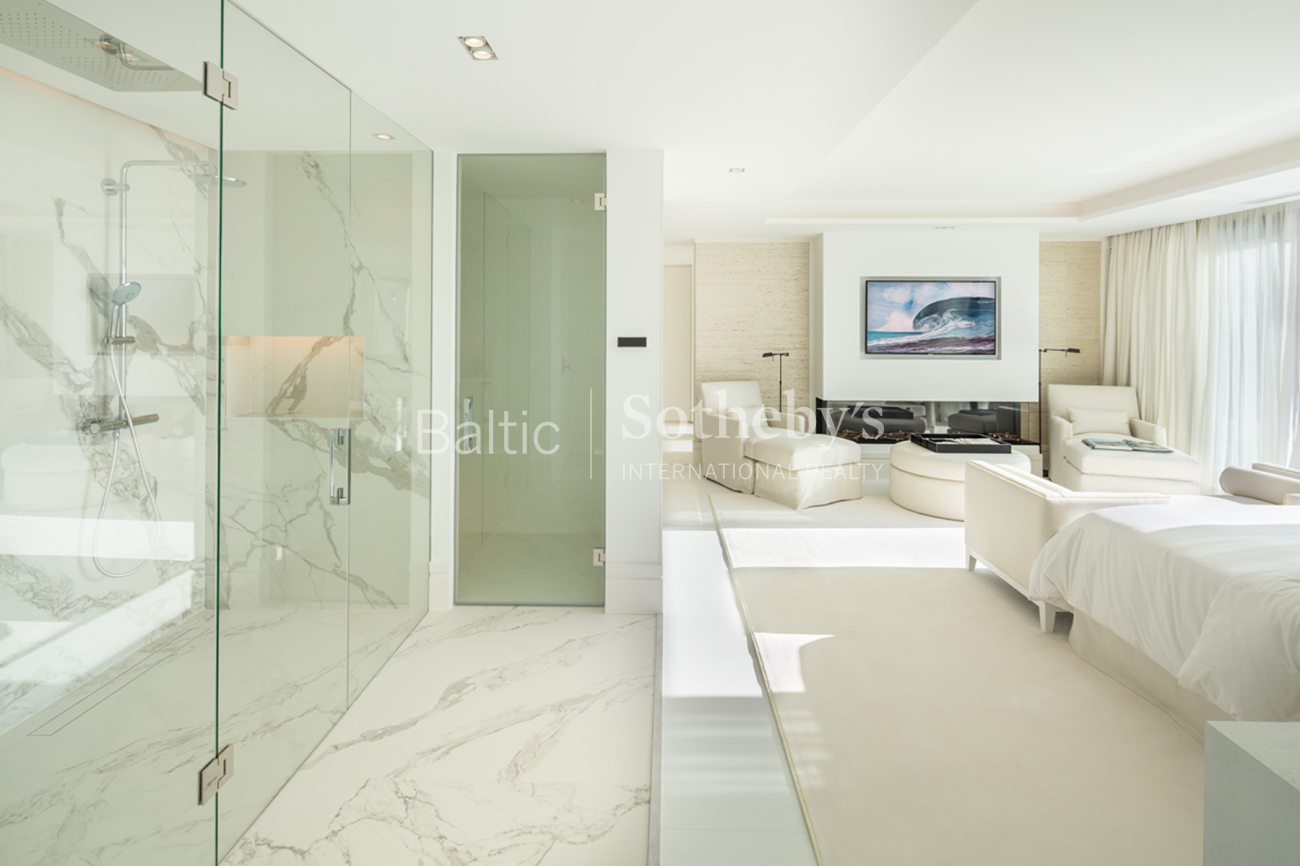 Pagrindiniame aukšte įrengta atvira svetainės, valgomojo ir virtuvės erdvė. Ši zona sukurta tiek kasdieniam gyvenimui, tiek ypatingoms progoms – su tiesioginiu išėjimu į lauką ir panoraminiais vaizdais. Virtuvė aprūpinta šiuolaikinėmis technologijomis ir aukštos kokybės apdaila. Pagrindinis miegamasis su jūros panorama turi erdvią drabužinę ir privačią vonios zoną.