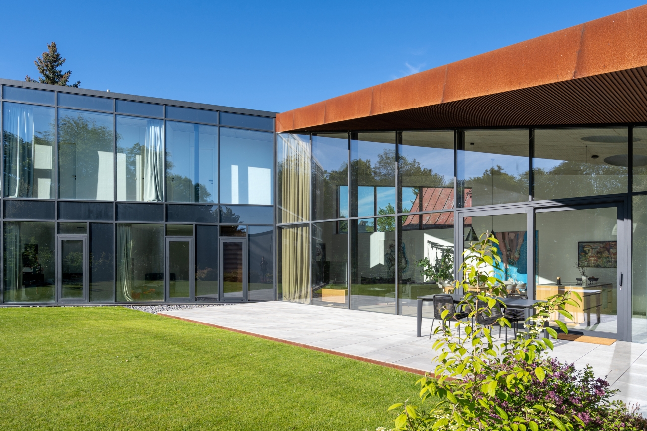 Architekto G. Natkevičiaus 290 kv. m kūrinys įsikūręs 10 arų sklype ant šlaito Fredos rajone, Kaune. Žymaus architekto suprojektuotas namas išsiskiria dideliais aliuminio langais, kurie į vidų įleidžia gausybę natūralios šviesos dienos metu. Vakare, įjungus apšvietimą, pastatas įgauna išskirtinį prabangos įspūdį. Langų gausa skoningai dera su betoniniu ir sendinto metalo fasadu, sukuriančiu urbanistinį architektūrinį vientisumą.