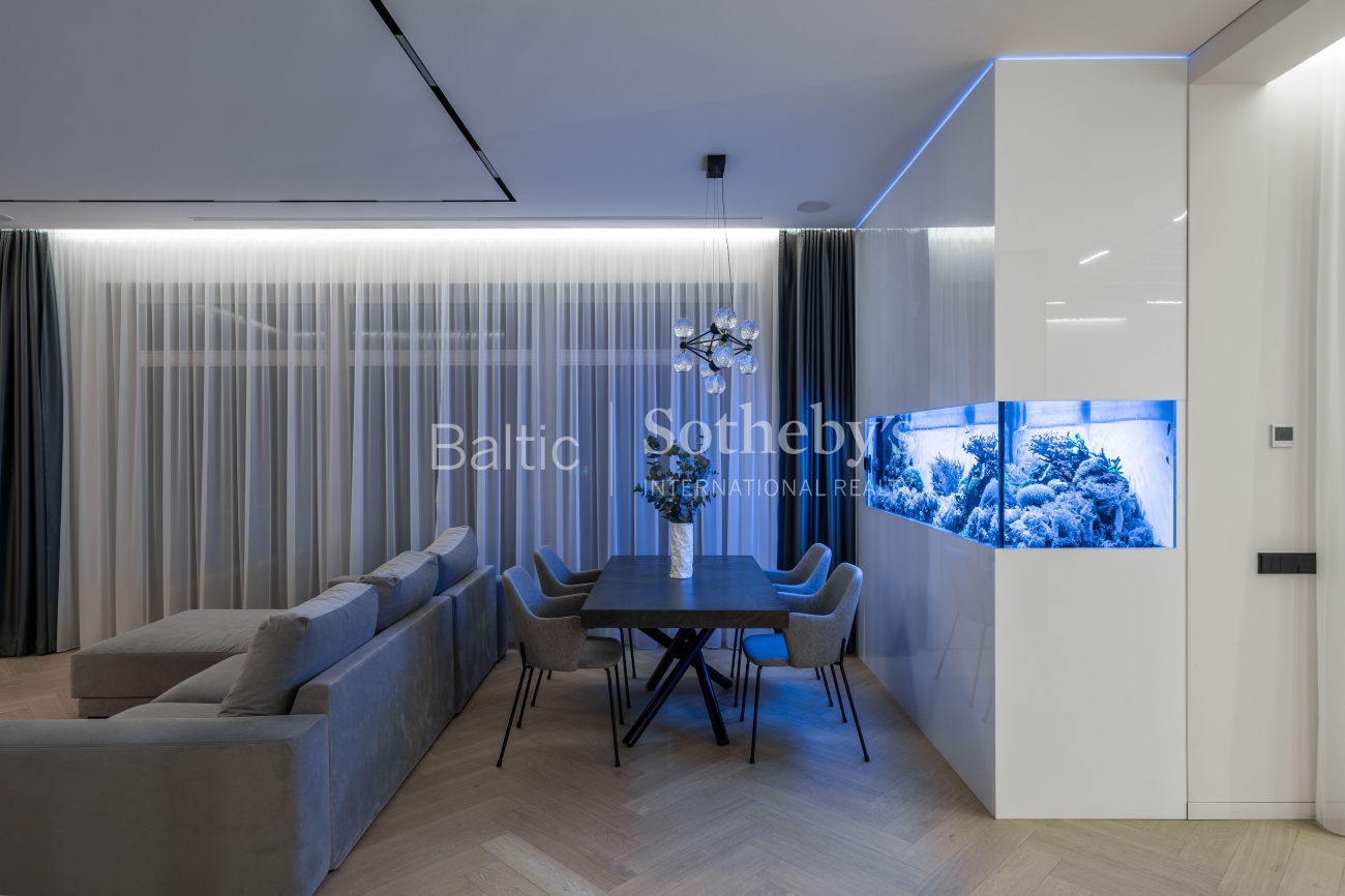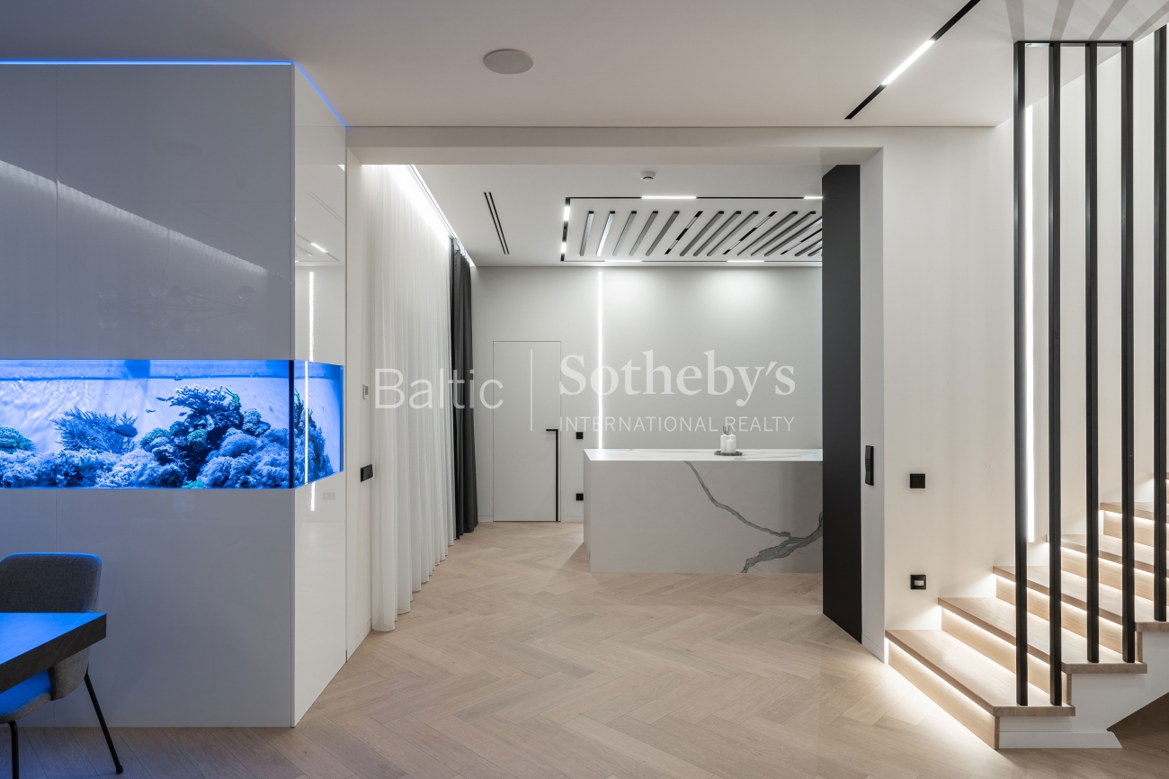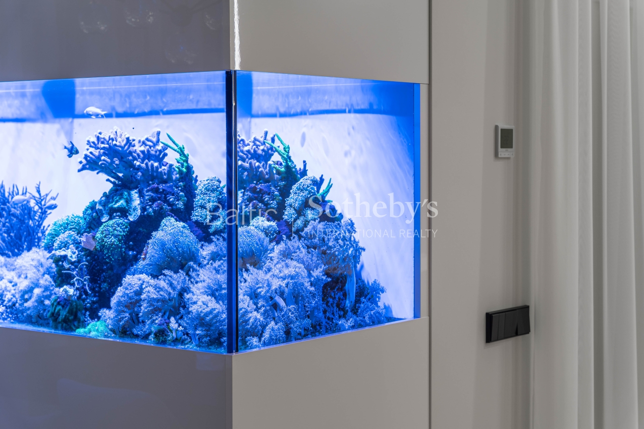 Abejingų nepalieka ir šių namų svetainės puošmena - 1100 litrų jūrinis akvariumas su įspūdingais koralais ir žuvimis bei atkartojantis Ramiojo vandenyno apšvietimą. Viso namo interjeras yra šviesus ir harmoningas, atviros erdvės užtikrina jaukią, modernią atmosferą, o dideli langai ir aukštos lubos - natūralios šviesos gausą visą dieną.