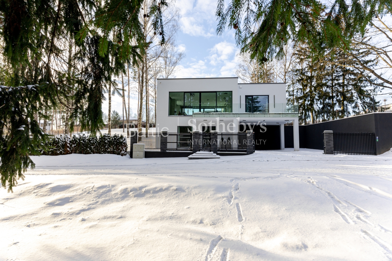 Namo interjere vyraujantis spalvų bei daiktų minimalizmas tarsi atsvara šiandieninei dominuojačiai vartotojiškai kultūrai. Mažiau yra daugiau bei kokybiškiau – taip būtų galima trumpai apibūdinti namo šeimininkų filosofiją. Namo grindis puošia balinto ąžuolo parketlentės bei ypač didelio formato plytelės. Virtuvėje rasime italų gamintojo keramikinį stalą. Vonios kambariuose - lieto akmens kriauklės. Vidaus durys su paslėptais vyriais bei modernios į sieną įleistos grindjuostės. Ypatingas dėmesys skirtas šviestuvams - svetainėje panaudoti išskirtinių geometrinių formų pakabinami šviestuvai “Nova Luce”. Solidumo suteikia natūralios odos sofa.