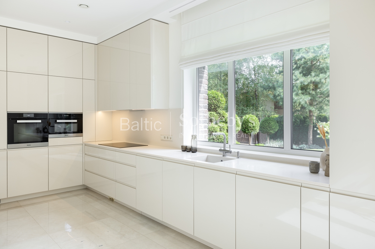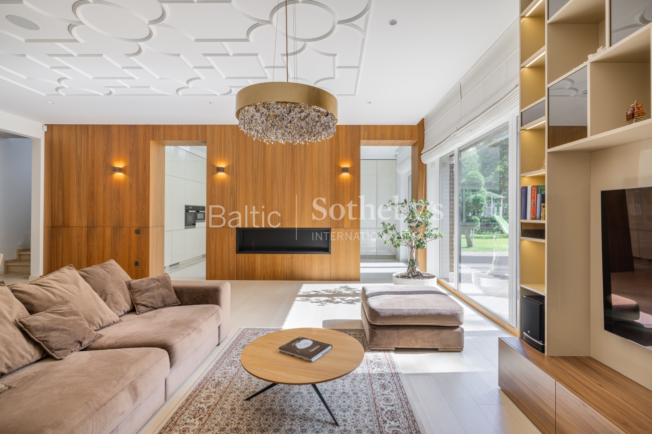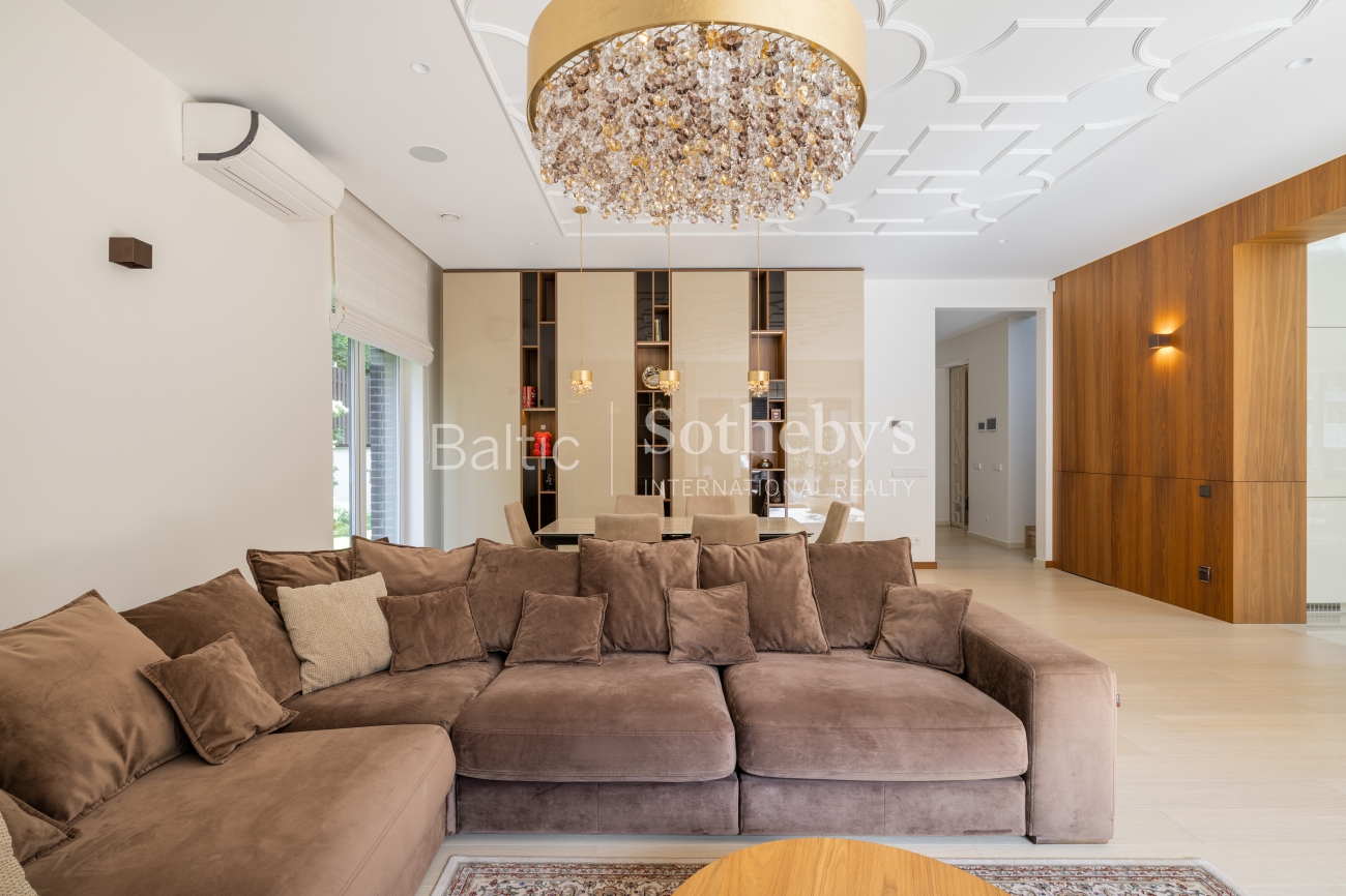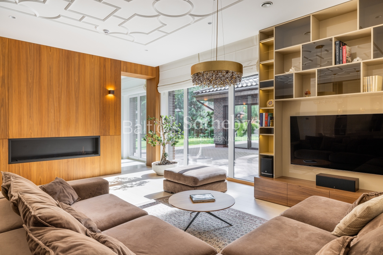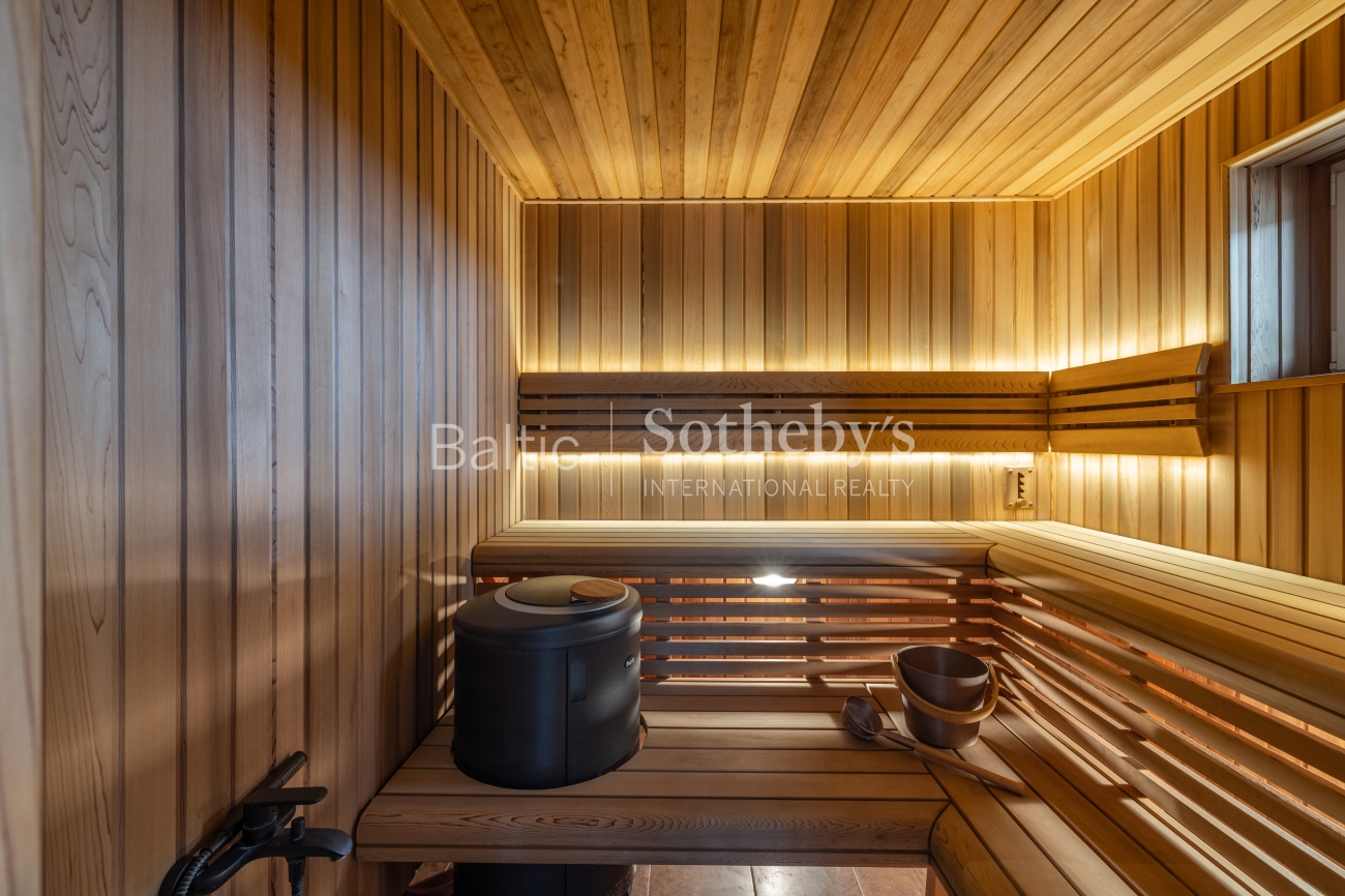 Vidaus erdvės kurtos su išskirtiniu dėmesiu detalėms. Aukštos lubos ir specialiai gamintos frezuotos durys su aukso patina suteikia prabangos pojūtį. Svetainėje interjerą papildo natūralaus riešutmedžio sienų apdaila ir biožidinys. Išskirtinumo namams suteikia rankų darbo lubų ornamentai, belgiški „Omexco Shalimar“ sienų apmušalai su auksiniu siūlu ir prabangūs apšvietimo sprendimai – „Masiero“ bei „Studio Italia“ šviestuvai. Visame name sudėtos itališkos grindų plytelės ir parketlentės. Namas aprūpintas išmaniosiomis technologijomis, kurios leidžia iš vienos programos kontroliuoti vidaus ir lauko apšvietimą, šildymą, vėsinimą, kameras, signalizaciją bei vartus. Papildomam patogumui sumontuotas centrinis dulkių siurblys bei grindų siurbimo robotai. Įspūdingą garso kokybę užtikrina centrinė garso sistema, veikianti tiek name, tiek terasoje ar pirties namuke.