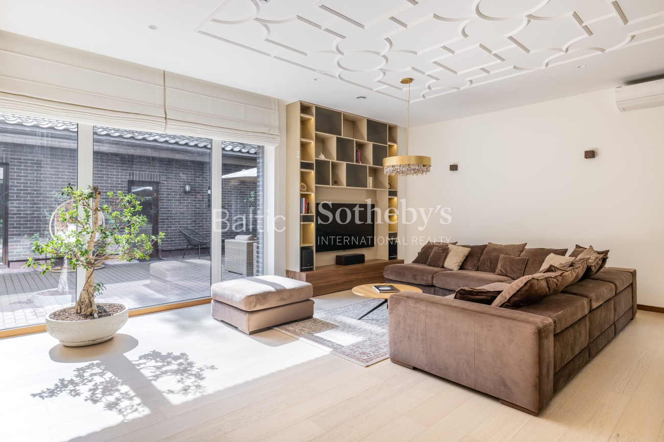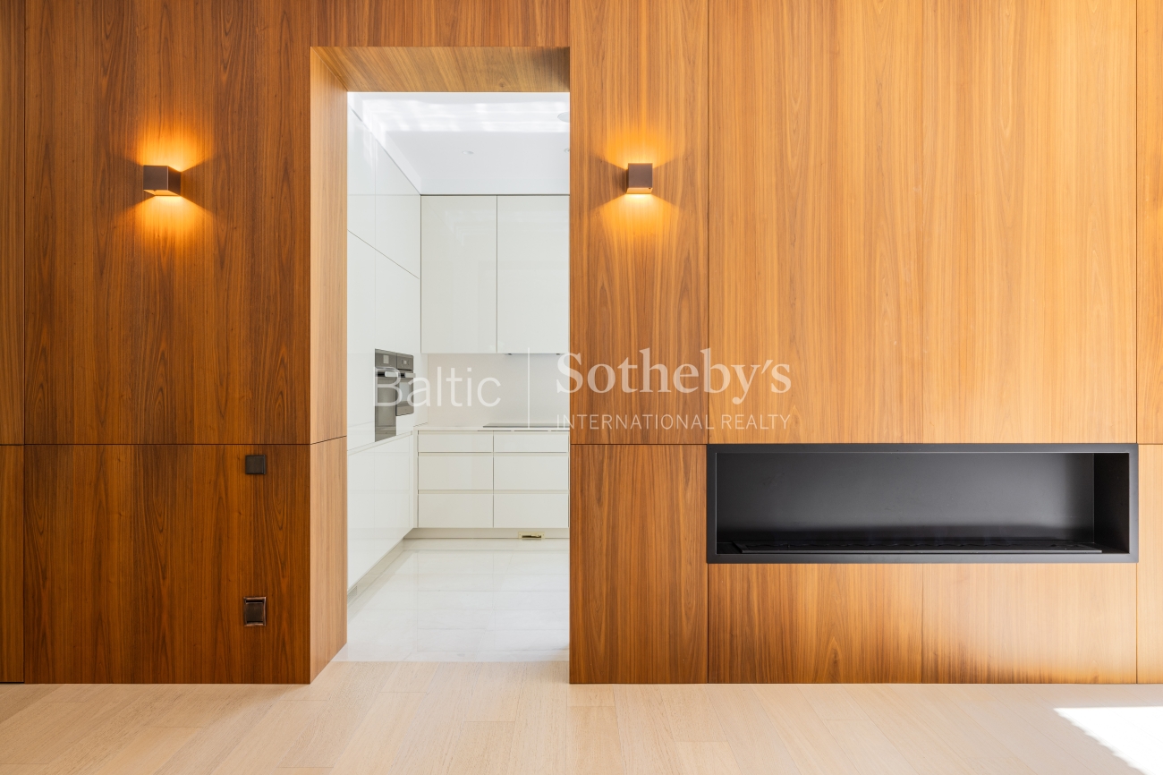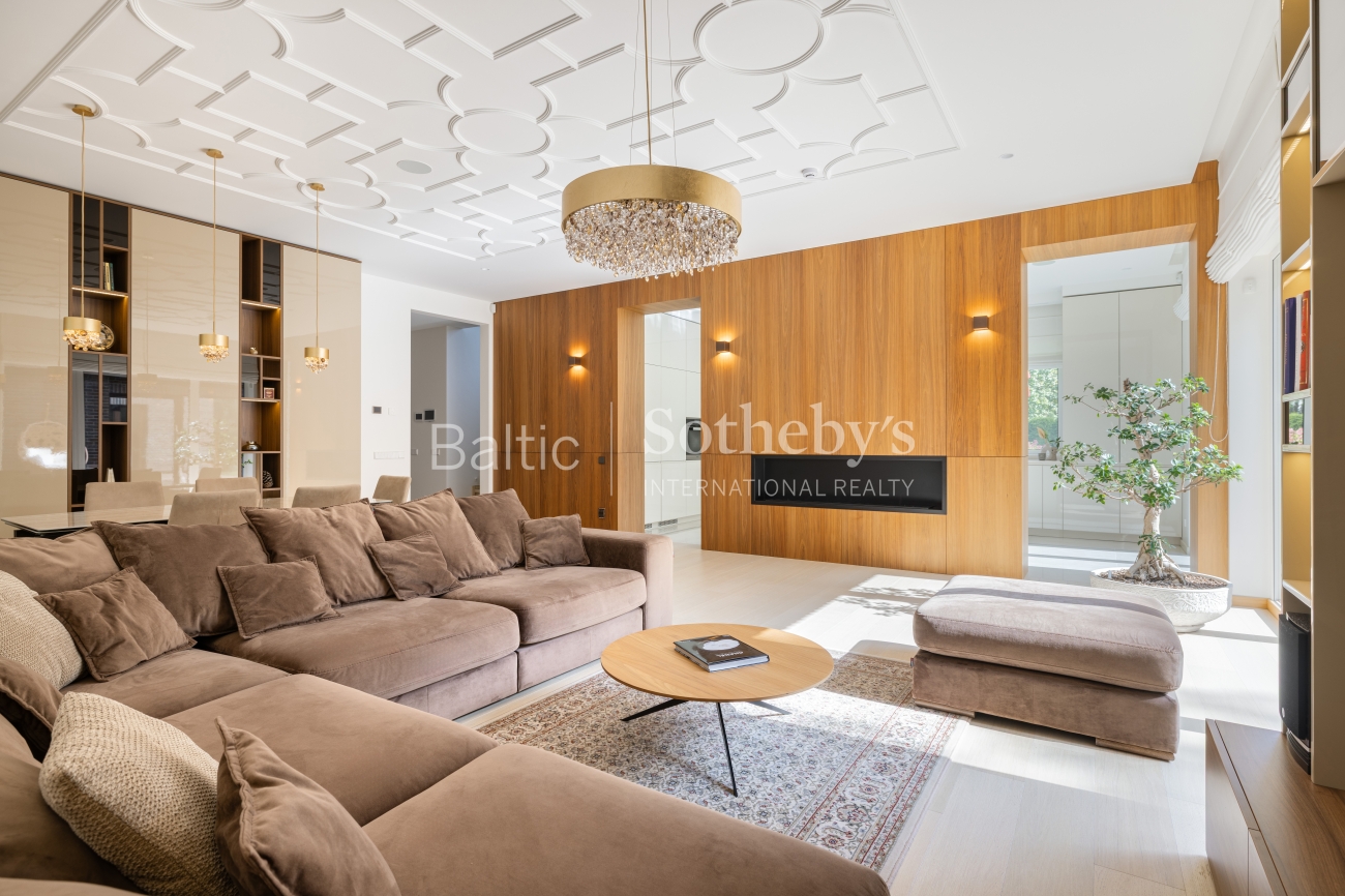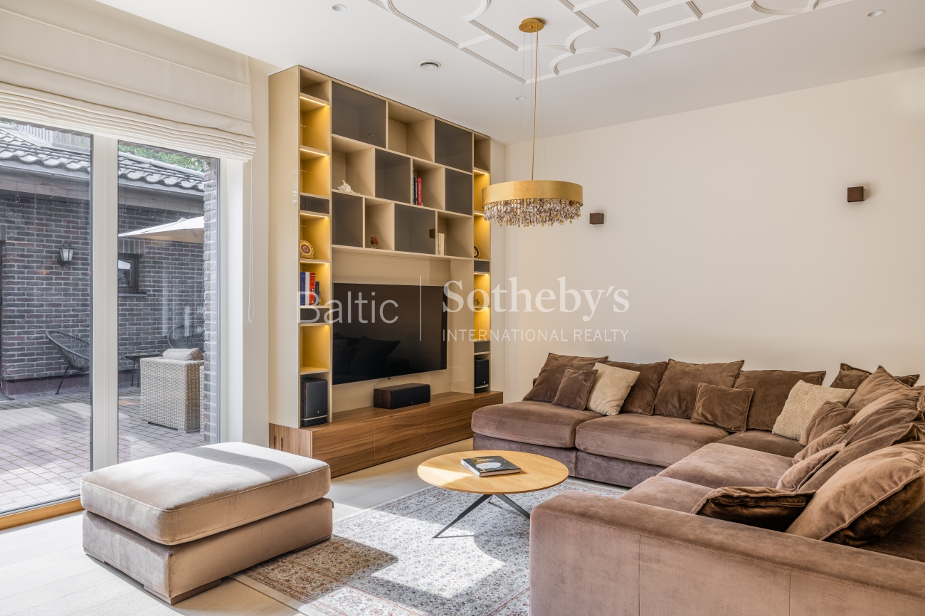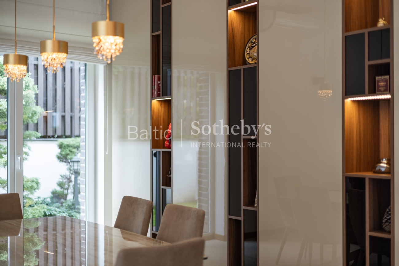 Vidaus erdvės kurtos su išskirtiniu dėmesiu detalėms. Aukštos lubos ir specialiai gamintos frezuotos durys su aukso patina suteikia prabangos pojūtį. Svetainėje interjerą papildo natūralaus riešutmedžio sienų apdaila ir biožidinys. Išskirtinumo namams suteikia rankų darbo lubų ornamentai, belgiški „Omexco Shalimar“ sienų apmušalai su auksiniu siūlu ir prabangūs apšvietimo sprendimai – „Masiero“ bei „Studio Italia“ šviestuvai. Visame name sudėtos itališkos grindų plytelės ir parketlentės. Namas aprūpintas išmaniosiomis technologijomis, kurios leidžia iš vienos programos kontroliuoti vidaus ir lauko apšvietimą, šildymą, vėsinimą, kameras, signalizaciją bei vartus. Papildomam patogumui sumontuotas centrinis dulkių siurblys bei grindų siurbimo robotai. Įspūdingą garso kokybę užtikrina centrinė garso sistema, veikianti tiek name, tiek terasoje ar pirties namuke.