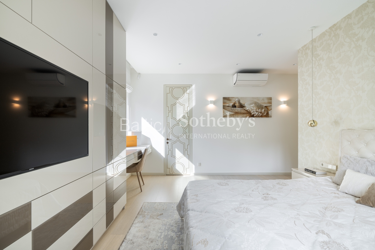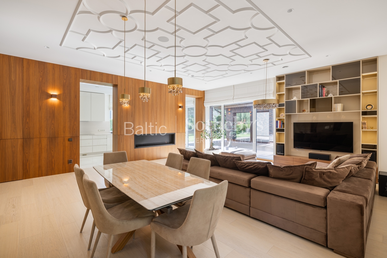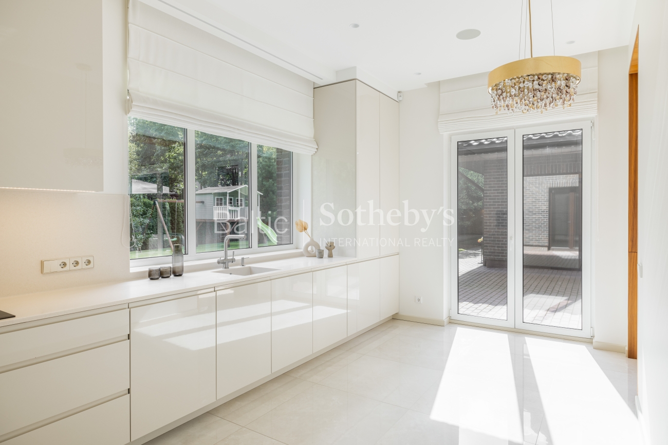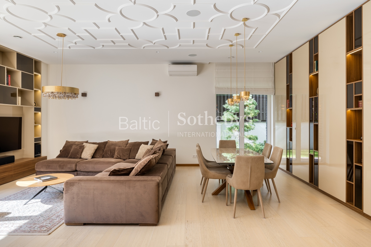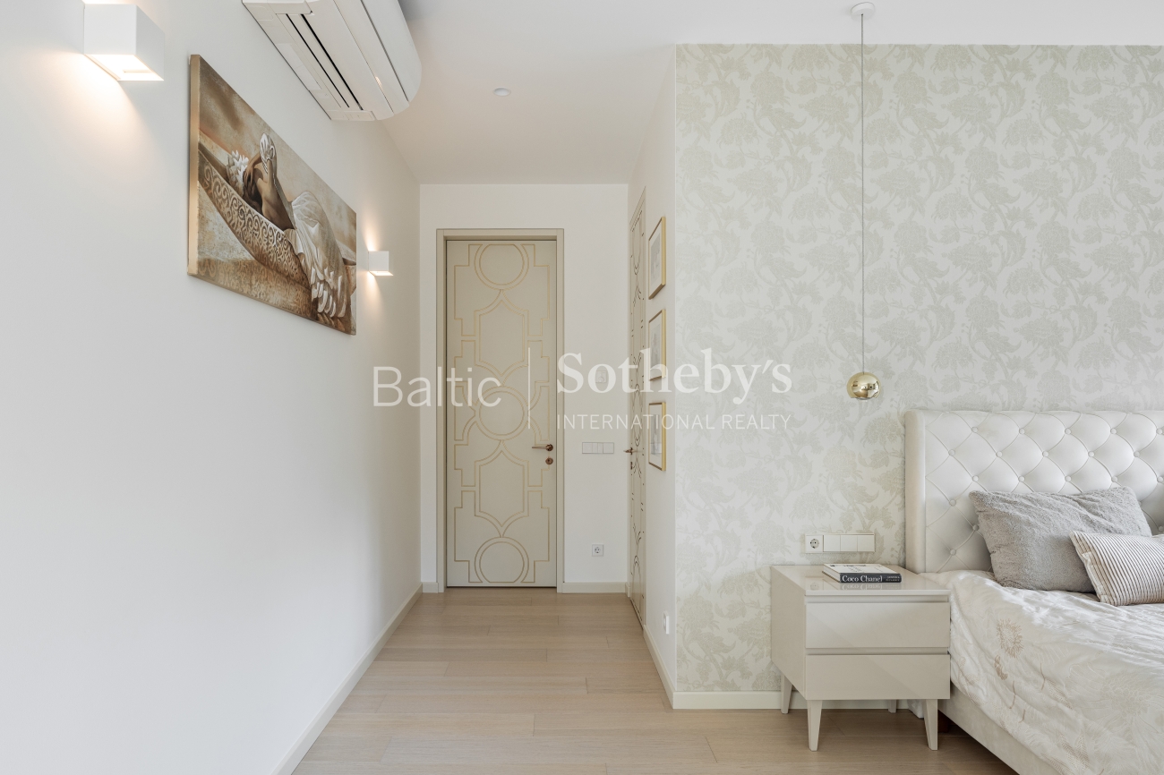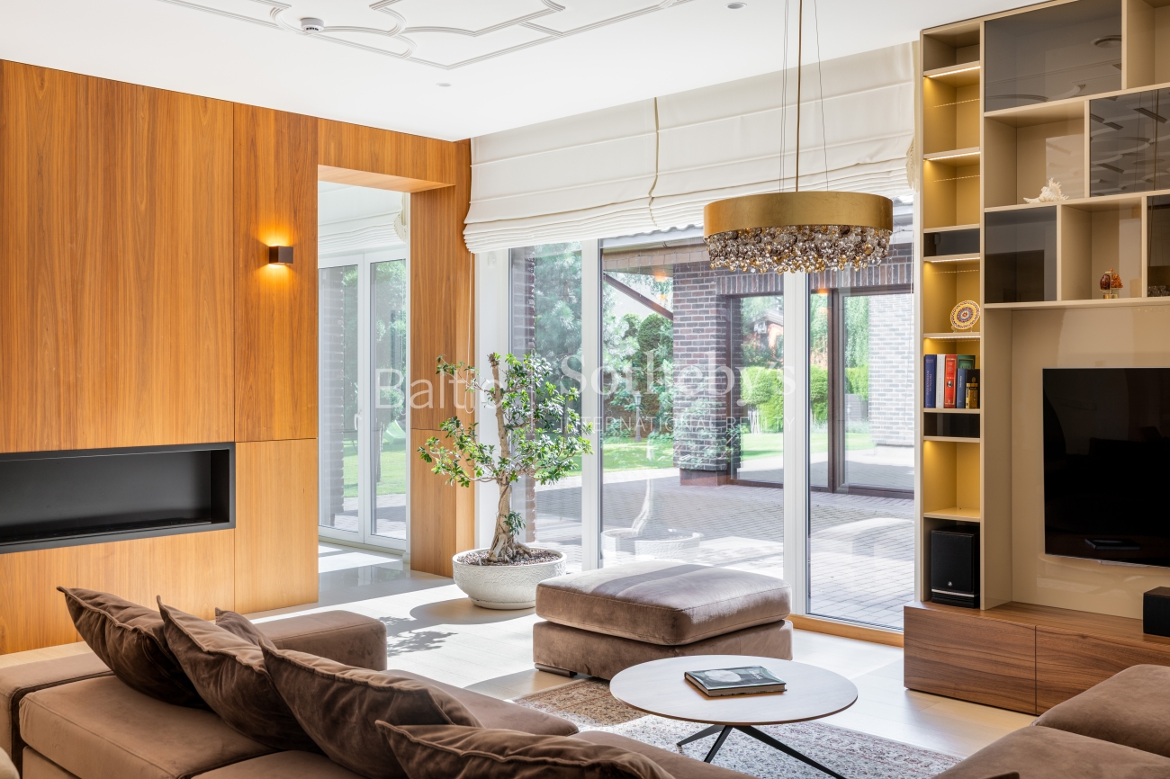 Vidaus erdvės kurtos su išskirtiniu dėmesiu detalėms. Aukštos lubos ir specialiai gamintos frezuotos durys su aukso patina suteikia prabangos pojūtį. Svetainėje interjerą papildo natūralaus riešutmedžio sienų apdaila ir biožidinys. Išskirtinumo namams suteikia rankų darbo lubų ornamentai, belgiški „Omexco Shalimar“ sienų apmušalai su auksiniu siūlu ir prabangūs apšvietimo sprendimai – „Masiero“ bei „Studio Italia“ šviestuvai. Visame name sudėtos itališkos grindų plytelės ir parketlentės. Namas aprūpintas išmaniosiomis technologijomis, kurios leidžia iš vienos programos kontroliuoti vidaus ir lauko apšvietimą, šildymą, vėsinimą, kameras, signalizaciją bei vartus. Papildomam patogumui sumontuotas centrinis dulkių siurblys bei grindų siurbimo robotai. Įspūdingą garso kokybę užtikrina centrinė garso sistema, veikianti tiek name, tiek terasoje ar pirties namuke.
