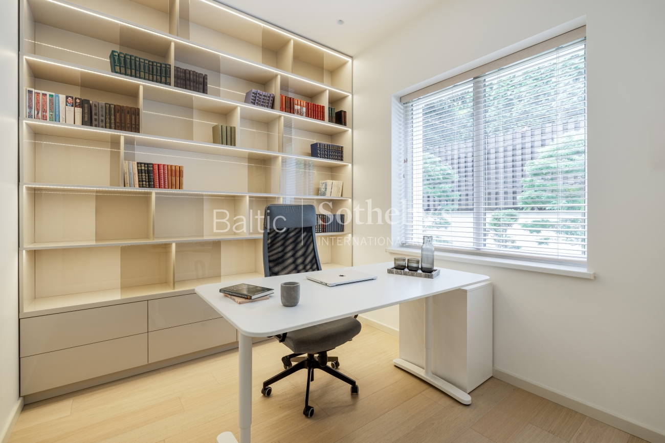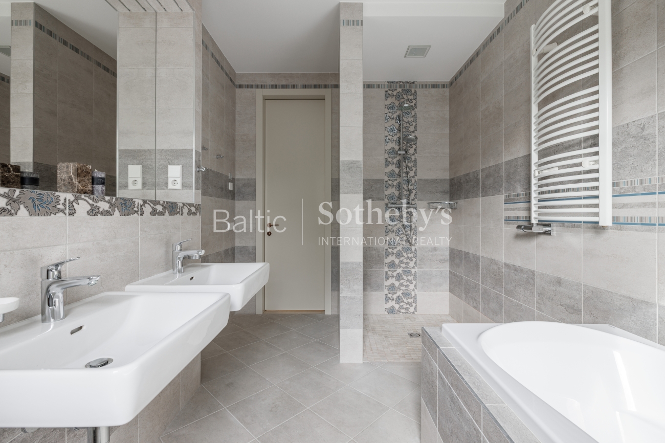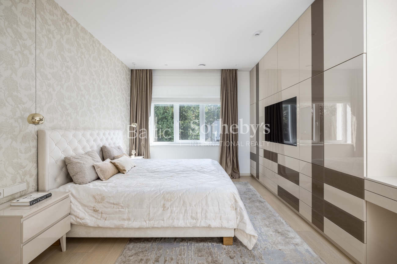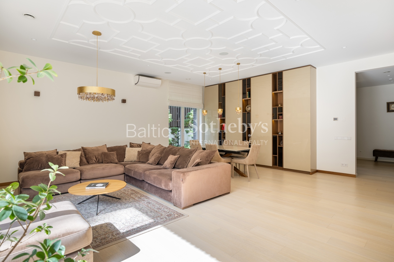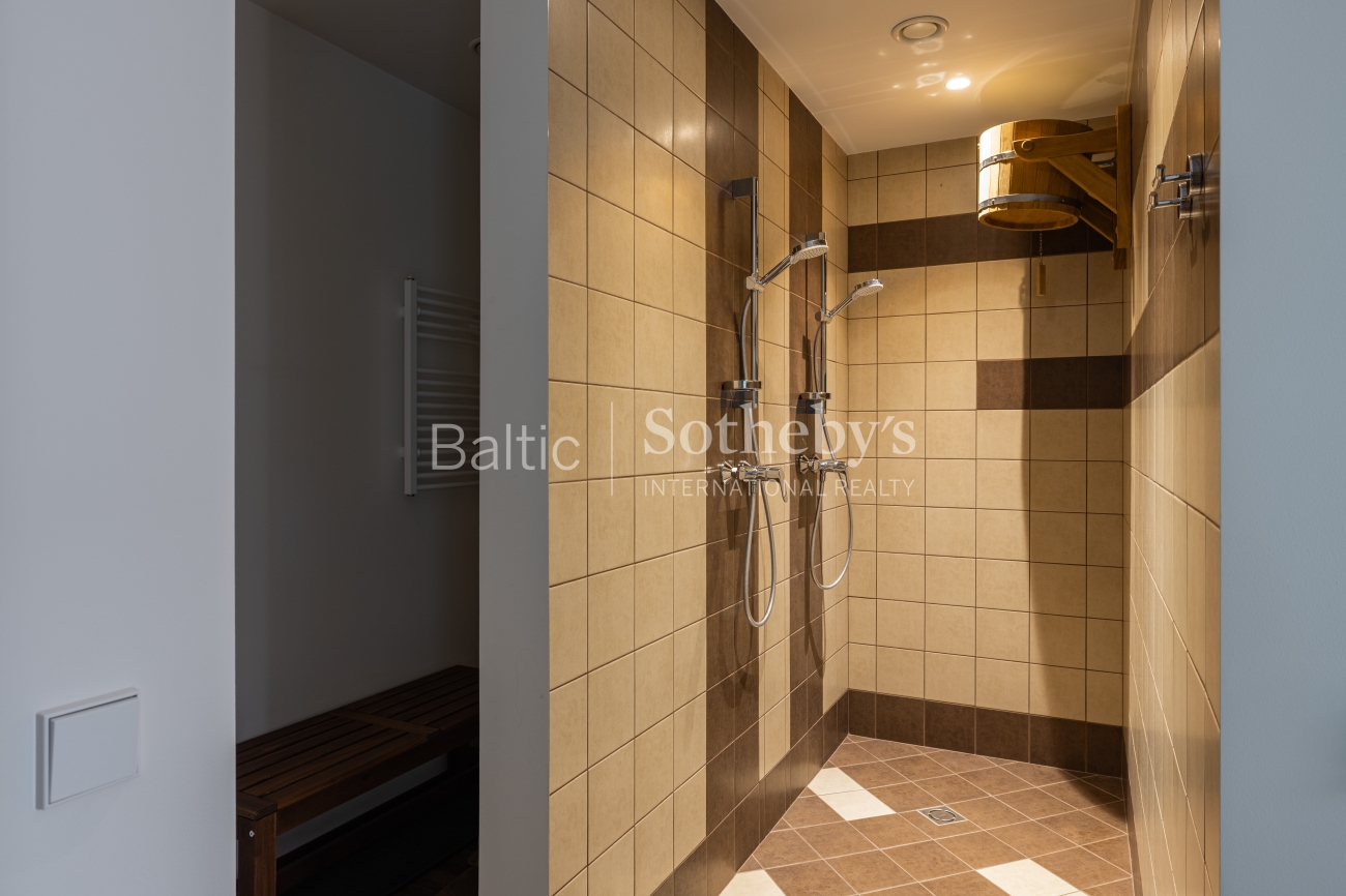 Vidaus erdvės kurtos su išskirtiniu dėmesiu detalėms. Aukštos lubos ir specialiai gamintos frezuotos durys su aukso patina suteikia prabangos pojūtį. Svetainėje interjerą papildo natūralaus riešutmedžio sienų apdaila ir biožidinys. Išskirtinumo namams suteikia rankų darbo lubų ornamentai, belgiški „Omexco Shalimar“ sienų apmušalai su auksiniu siūlu ir prabangūs apšvietimo sprendimai – „Masiero“ bei „Studio Italia“ šviestuvai. Visame name sudėtos itališkos grindų plytelės ir parketlentės. Namas aprūpintas išmaniosiomis technologijomis, kurios leidžia iš vienos programos kontroliuoti vidaus ir lauko apšvietimą, šildymą, vėsinimą, kameras, signalizaciją bei vartus. Papildomam patogumui sumontuotas centrinis dulkių siurblys bei grindų siurbimo robotai. Įspūdingą garso kokybę užtikrina centrinė garso sistema, veikianti tiek name, tiek terasoje ar pirties namuke.