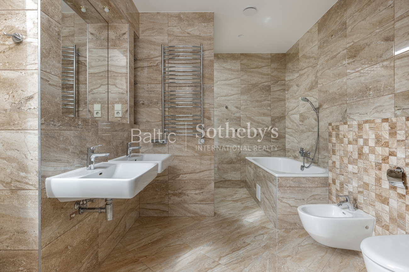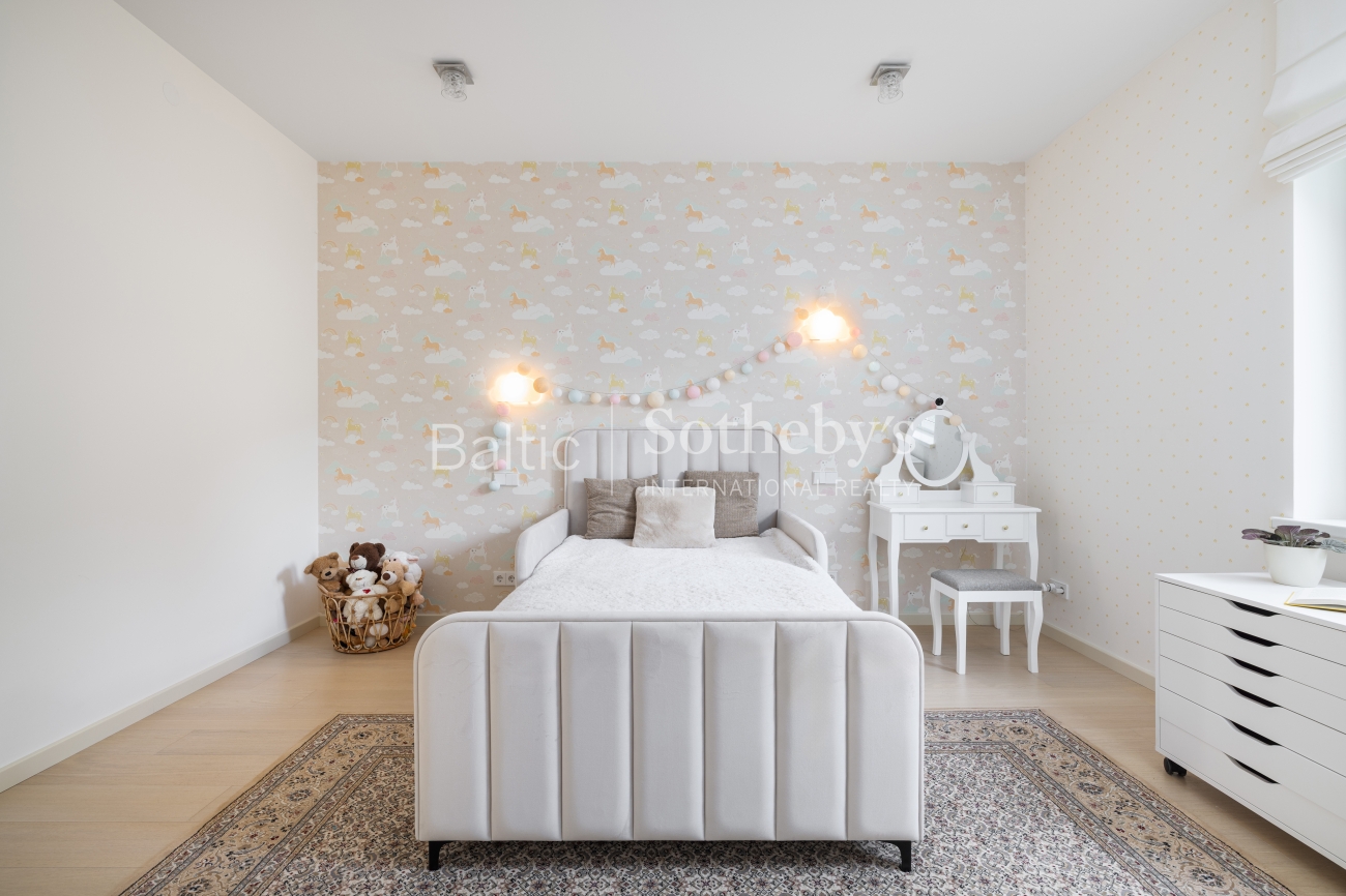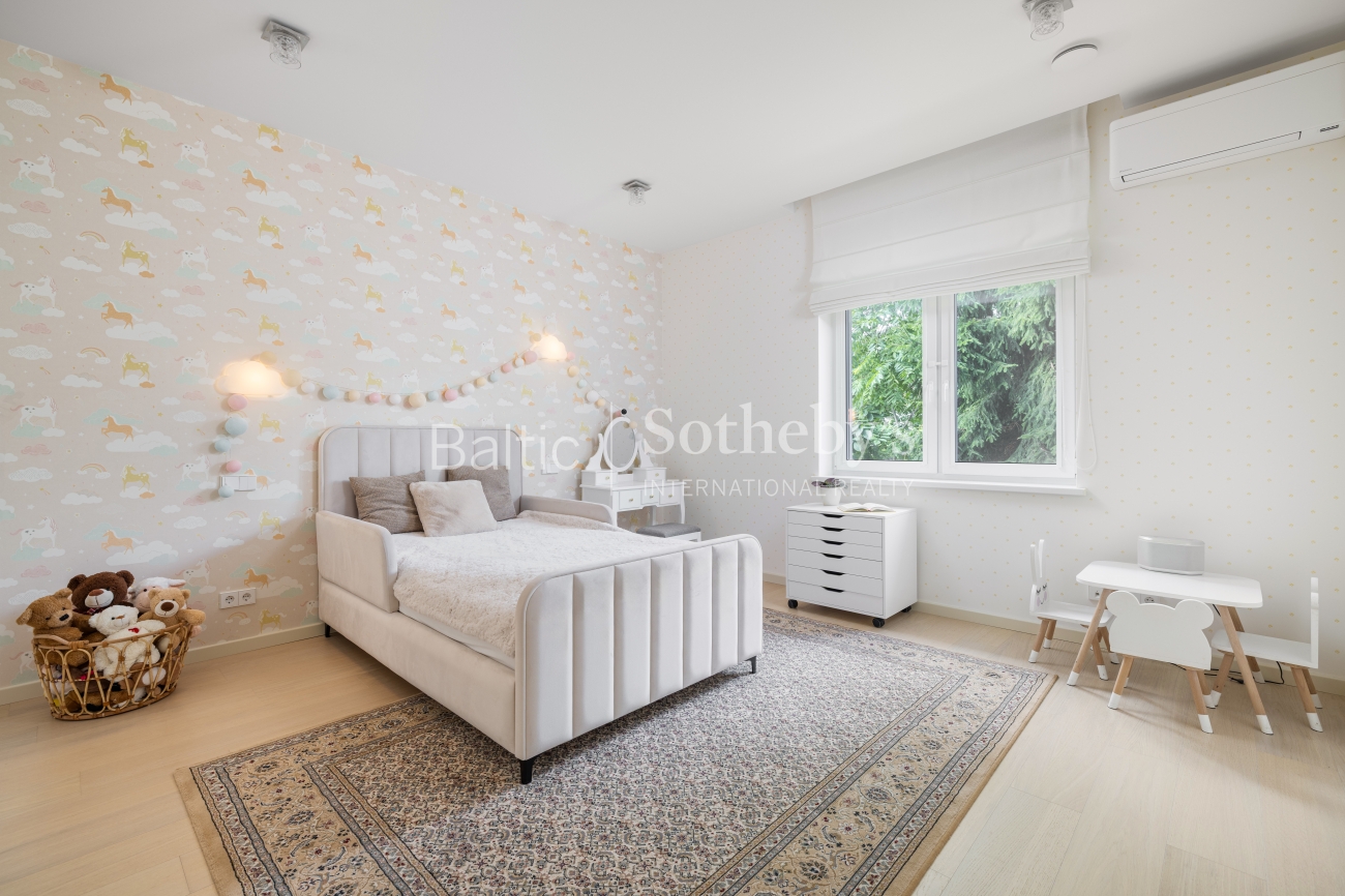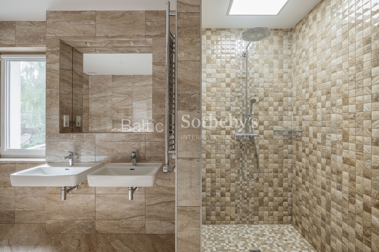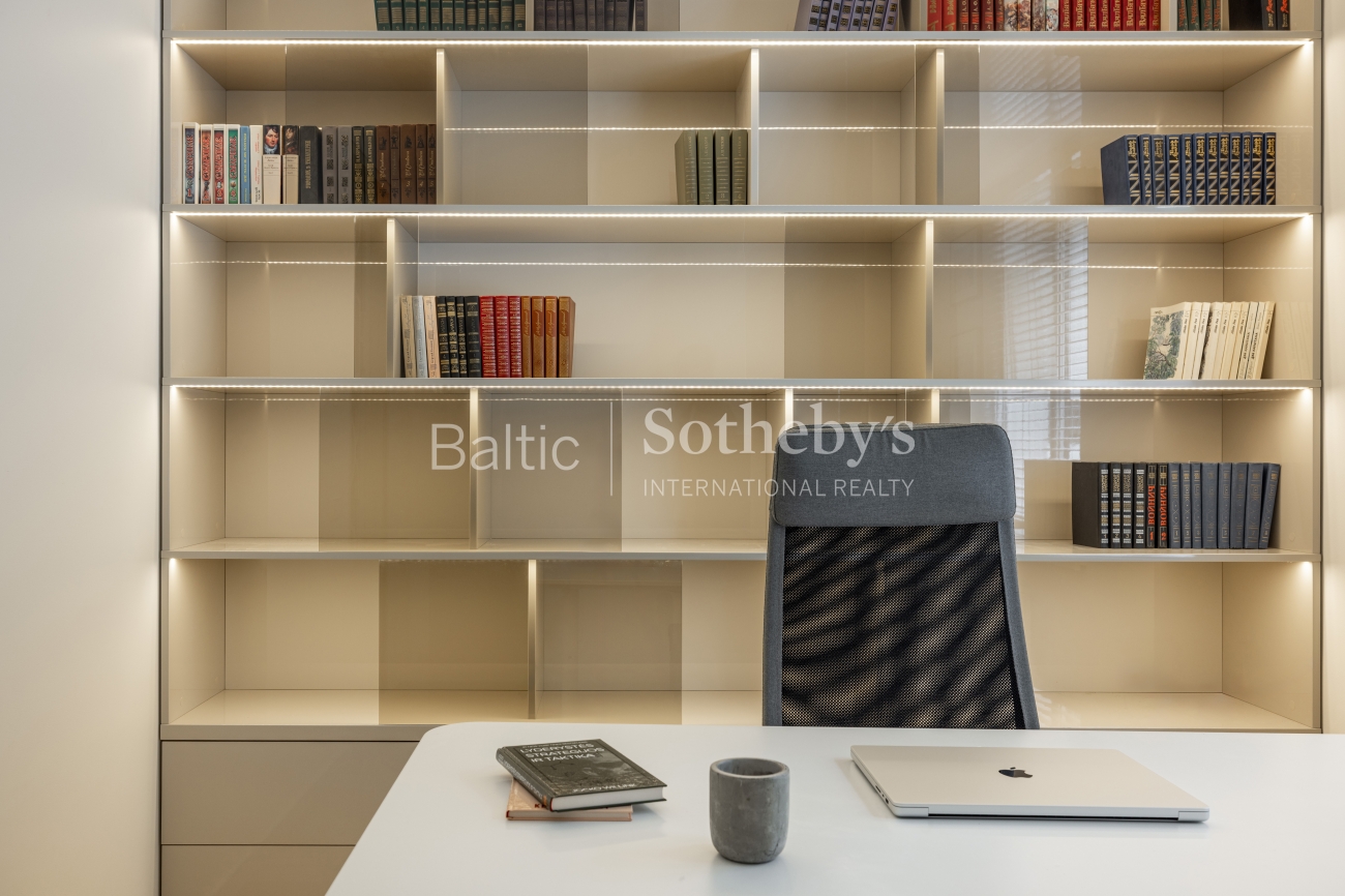 Vidaus erdvės kurtos su išskirtiniu dėmesiu detalėms. Aukštos lubos ir specialiai gamintos frezuotos durys su aukso patina suteikia prabangos pojūtį. Svetainėje interjerą papildo natūralaus riešutmedžio sienų apdaila ir biožidinys. Išskirtinumo namams suteikia rankų darbo lubų ornamentai, belgiški „Omexco Shalimar“ sienų apmušalai su auksiniu siūlu ir prabangūs apšvietimo sprendimai – „Masiero“ bei „Studio Italia“ šviestuvai. Visame name sudėtos itališkos grindų plytelės ir parketlentės. Namas aprūpintas išmaniosiomis technologijomis, kurios leidžia iš vienos programos kontroliuoti vidaus ir lauko apšvietimą, šildymą, vėsinimą, kameras, signalizaciją bei vartus. Papildomam patogumui sumontuotas centrinis dulkių siurblys bei grindų siurbimo robotai. Įspūdingą garso kokybę užtikrina centrinė garso sistema, veikianti tiek name, tiek terasoje ar pirties namuke.