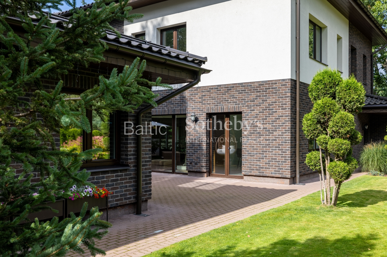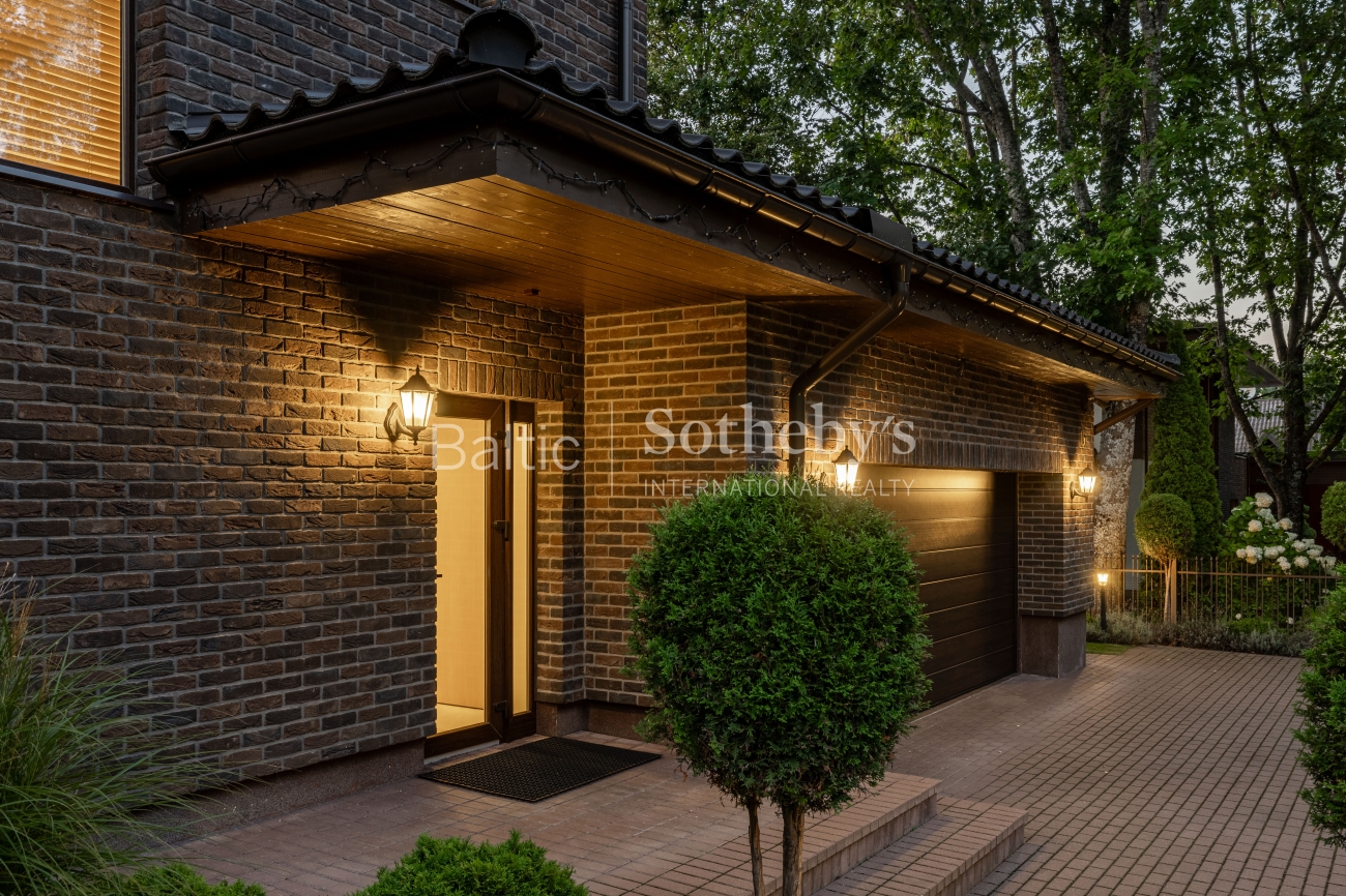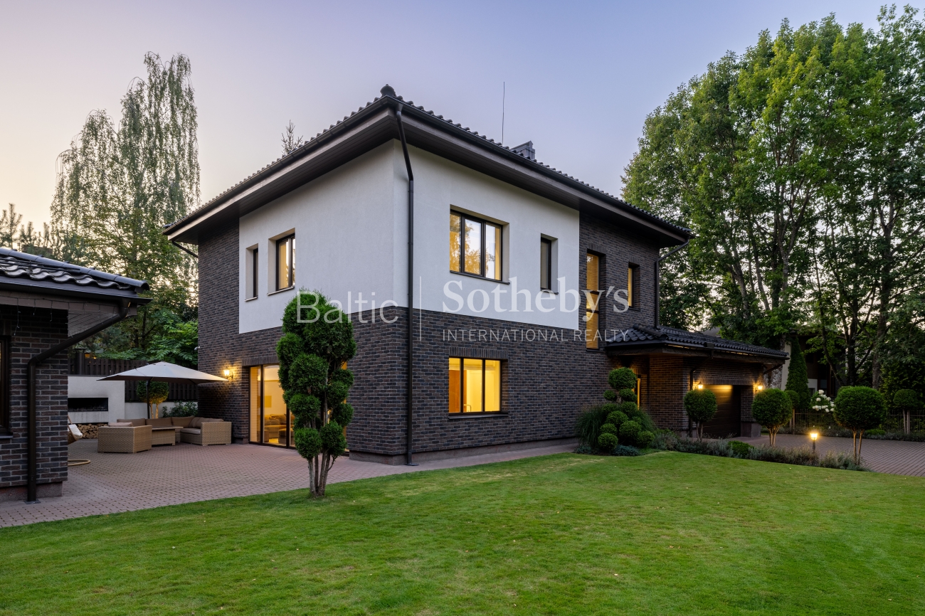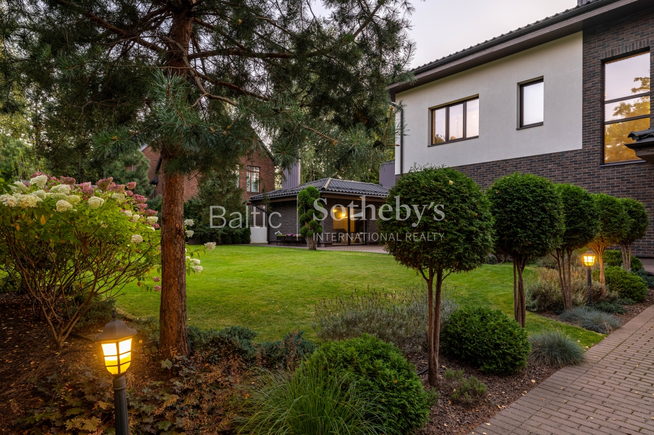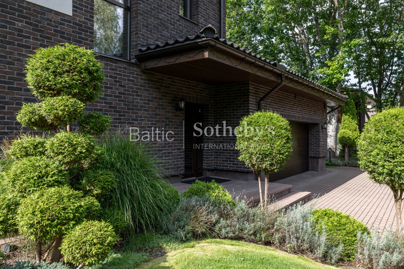 Namas išsiskiria ilgaamžiu klinkeriniu fasadu ir erdviu, landšafto dizainerio kurtu kiemu, kuriame harmoningai įkomponuoti brandūs medžiai. Kieme įrengtos klinkerio trinkelės, jauki terasa bei didelis lauko židinys, veikia automatinė laistymo sistema, sumontuotas apšvietimas ir automatiniai vartai. Pastatytas atskiras 58 kv.m pirties namukas su hidromasažine jacuzzi vonia, iš raudonojo kanadietiško kedro įrengta elektrine pirtimi, dušais, virtuvėle ir jaukiu židiniu.