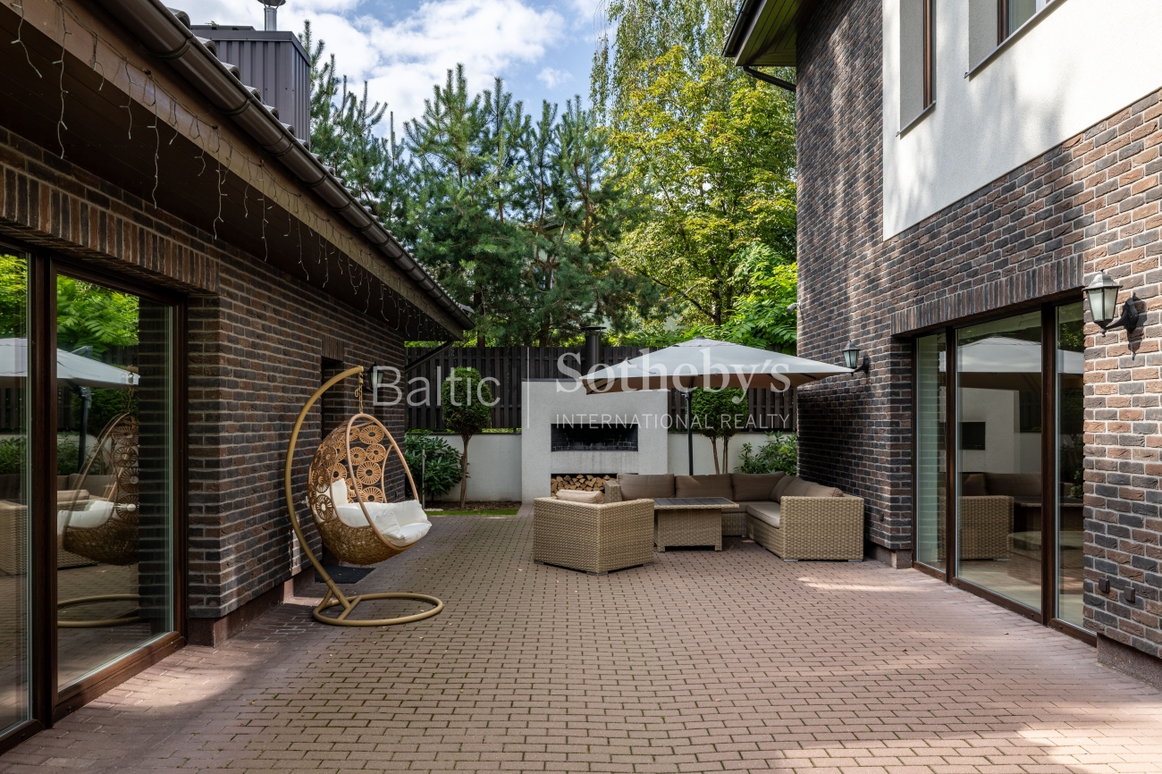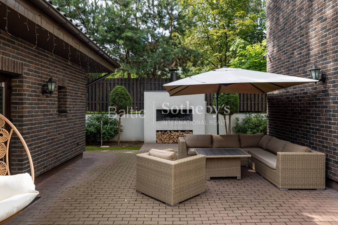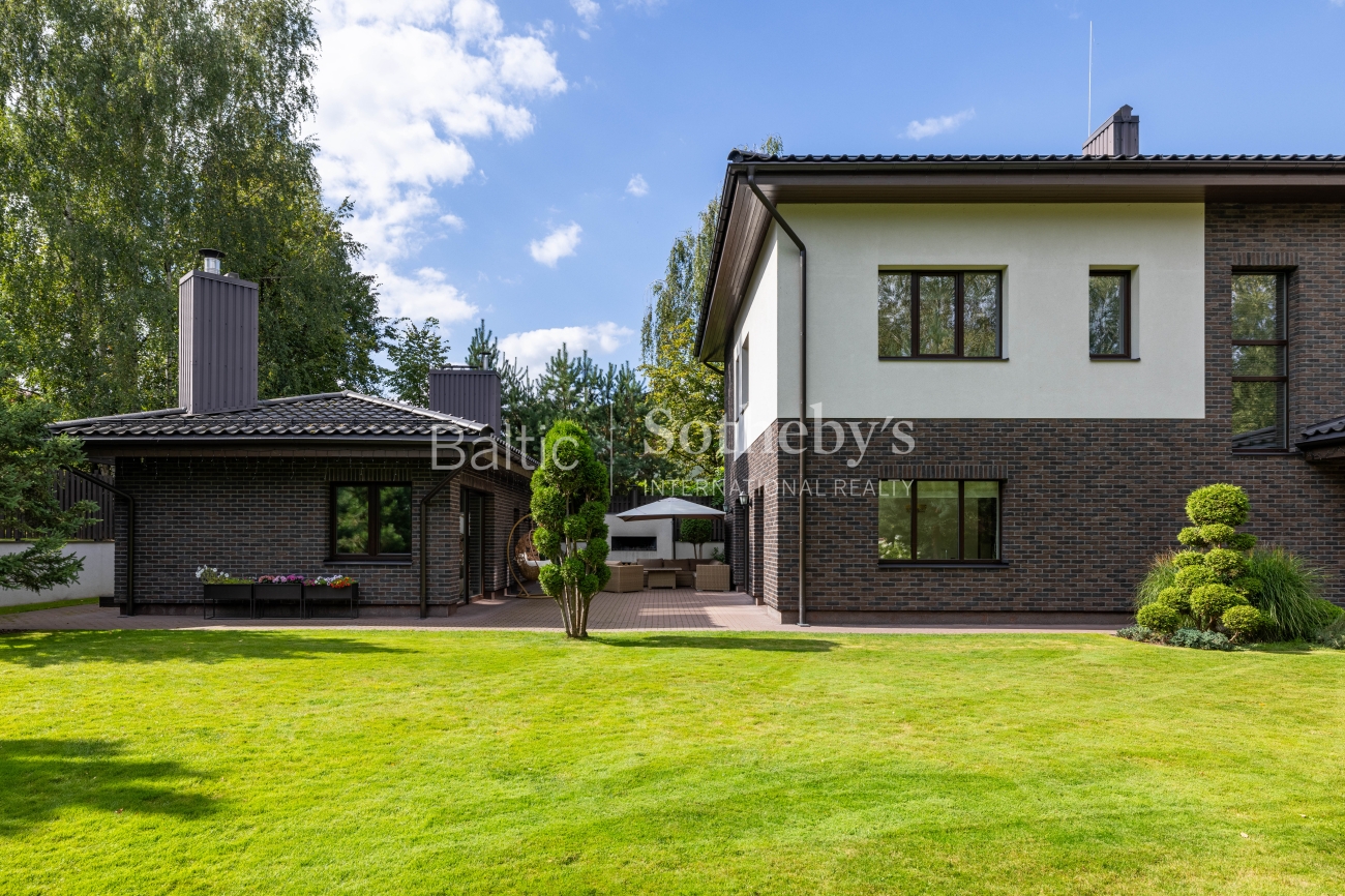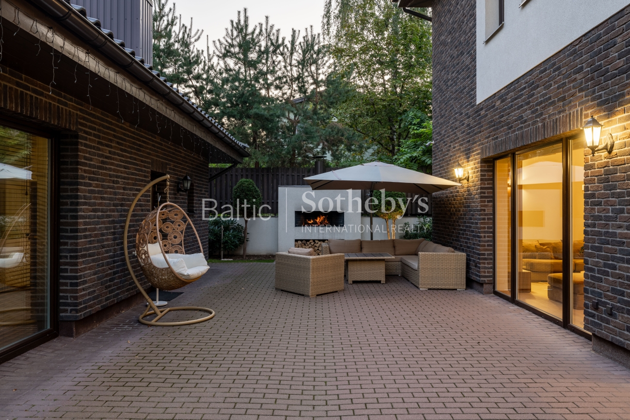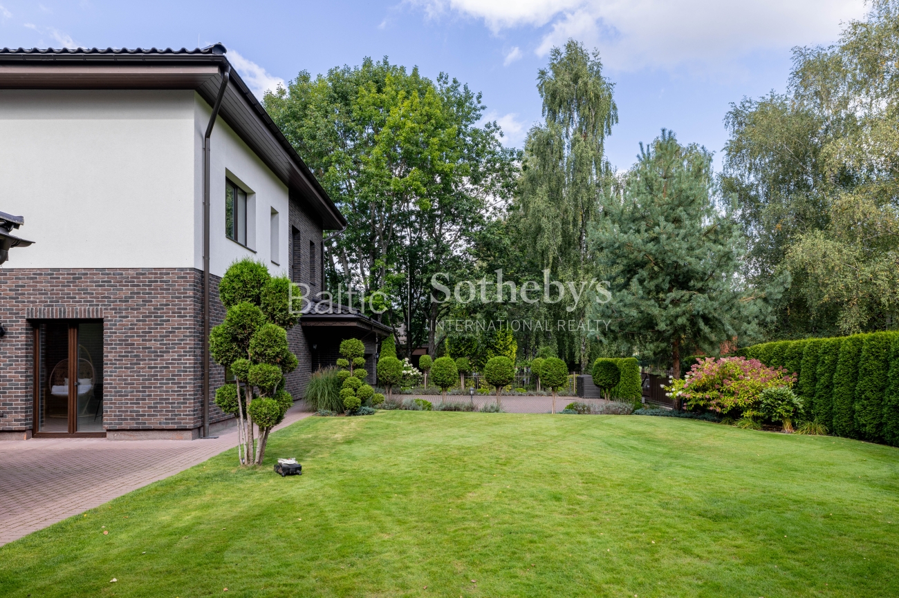 Namas išsiskiria ilgaamžiu klinkeriniu fasadu ir erdviu, landšafto dizainerio kurtu kiemu, kuriame harmoningai įkomponuoti brandūs medžiai. Kieme įrengtos klinkerio trinkelės, jauki terasa bei didelis lauko židinys, veikia automatinė laistymo sistema, sumontuotas apšvietimas ir automatiniai vartai. Pastatytas atskiras 58 kv.m pirties namukas su hidromasažine jacuzzi vonia, iš raudonojo kanadietiško kedro įrengta elektrine pirtimi, dušais, virtuvėle ir jaukiu židiniu.